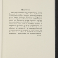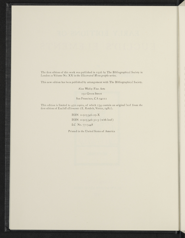 Stanford, Charles-Thomas. 1976. “Early Editions of Euclid’s ‘Elements’ (1977)”. San Francisco : Alan Wofsy Fine Arts ; Folkestone, Classic Elements, accessed February 11, 2026, https://digitalexhibits.library.wustl.edu/s/Classic-Elements/item/1947