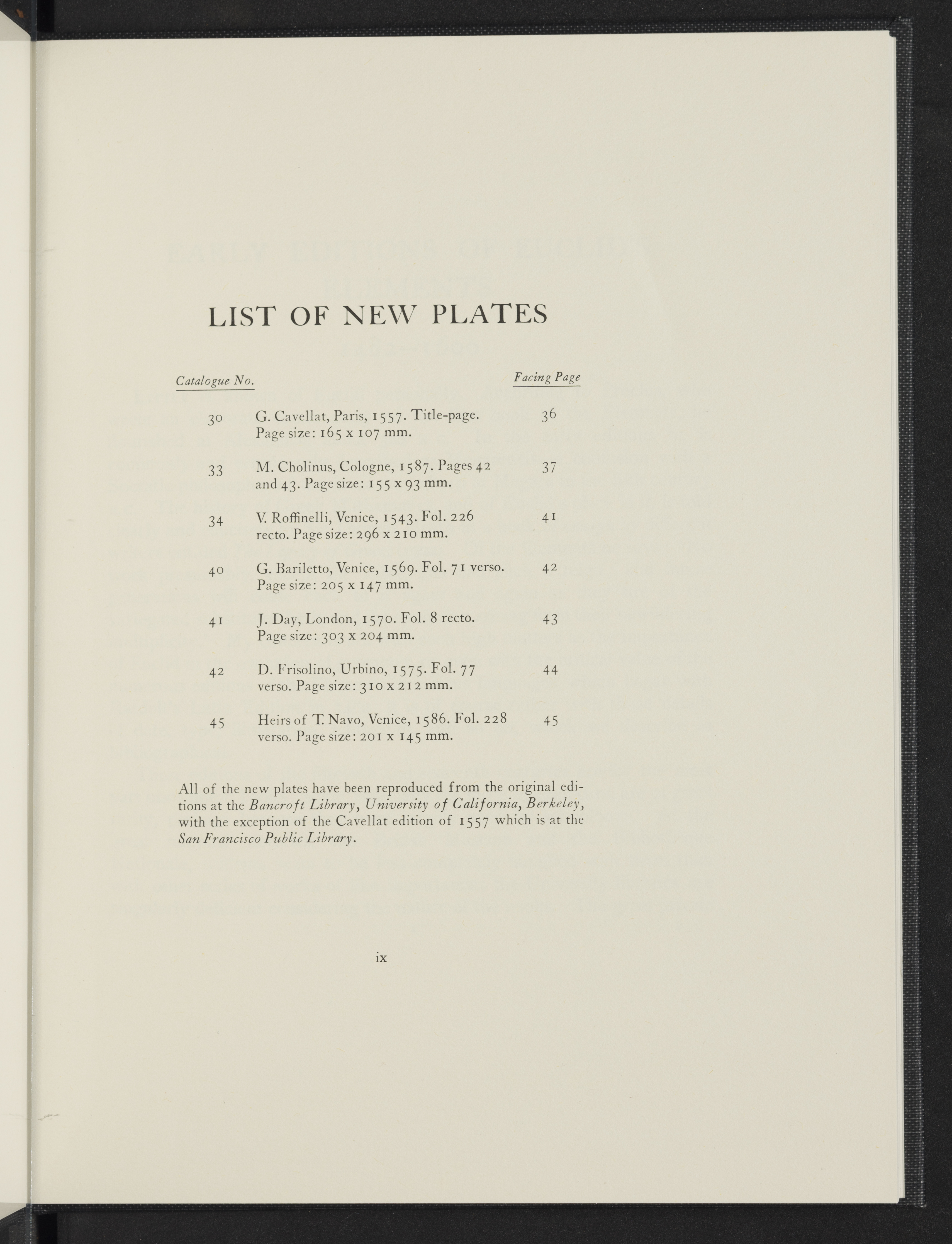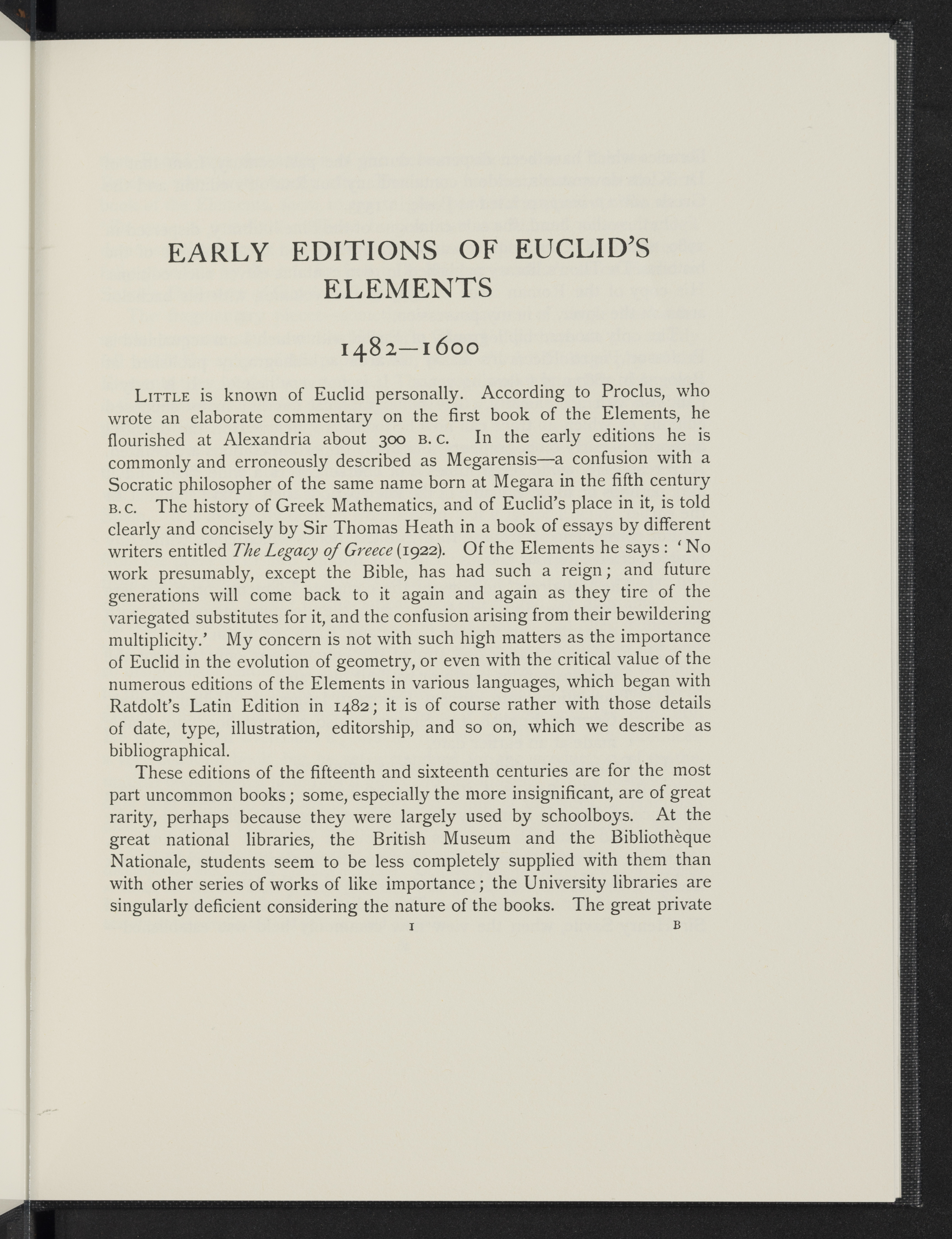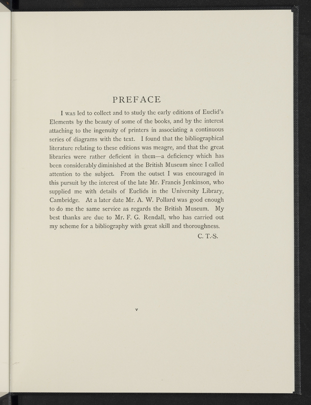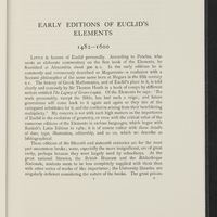 - A reprint of the 1926 version of <em>Early Editions of Euclid's Elements</em> by Charles Thomas-Stanford. This work includes a bibliography of incunabula and 16th-century editions of Euclid's Elements. An overview introduction is followed by annotated lists of editions in Greek, Greek and Latin, and various modern languages.