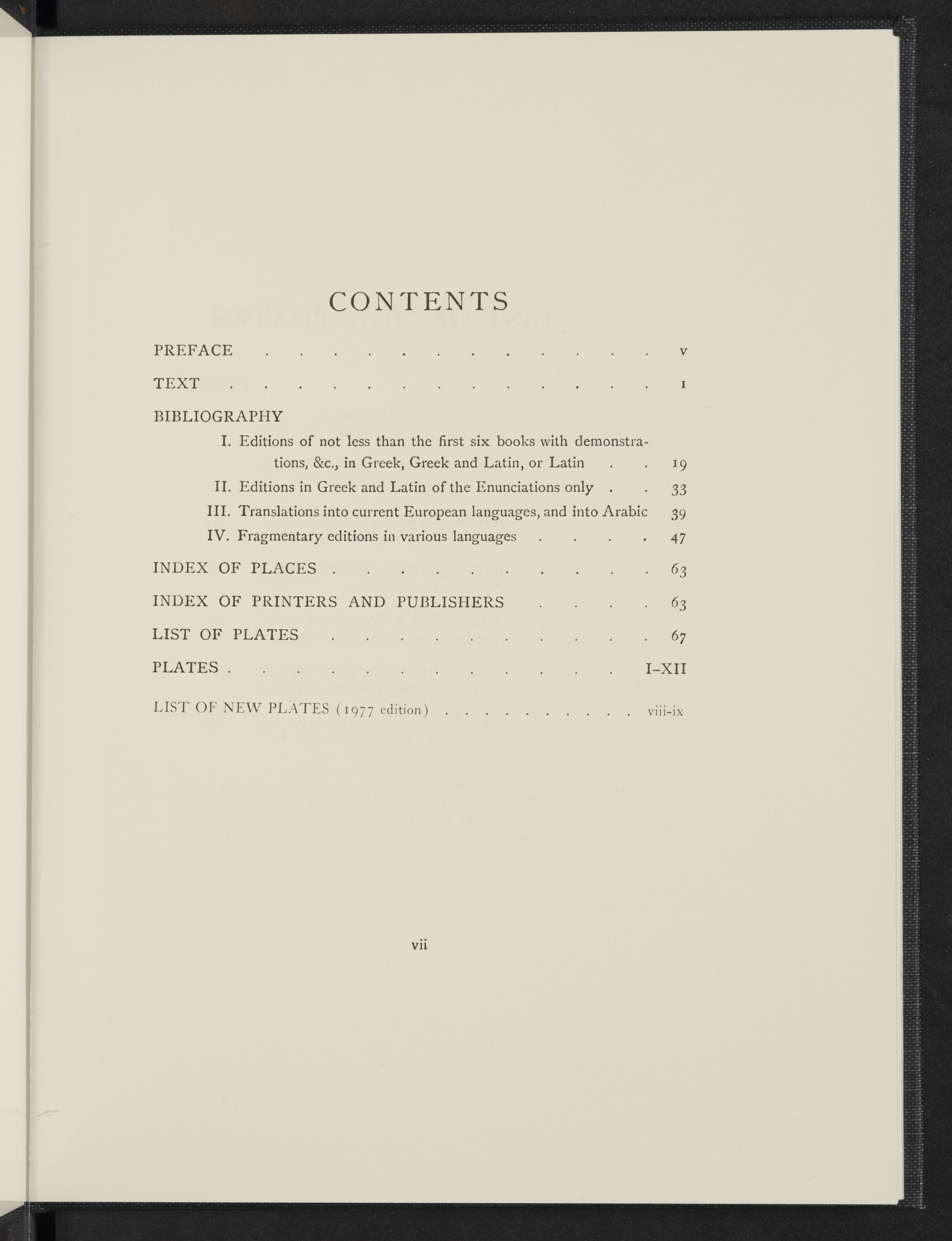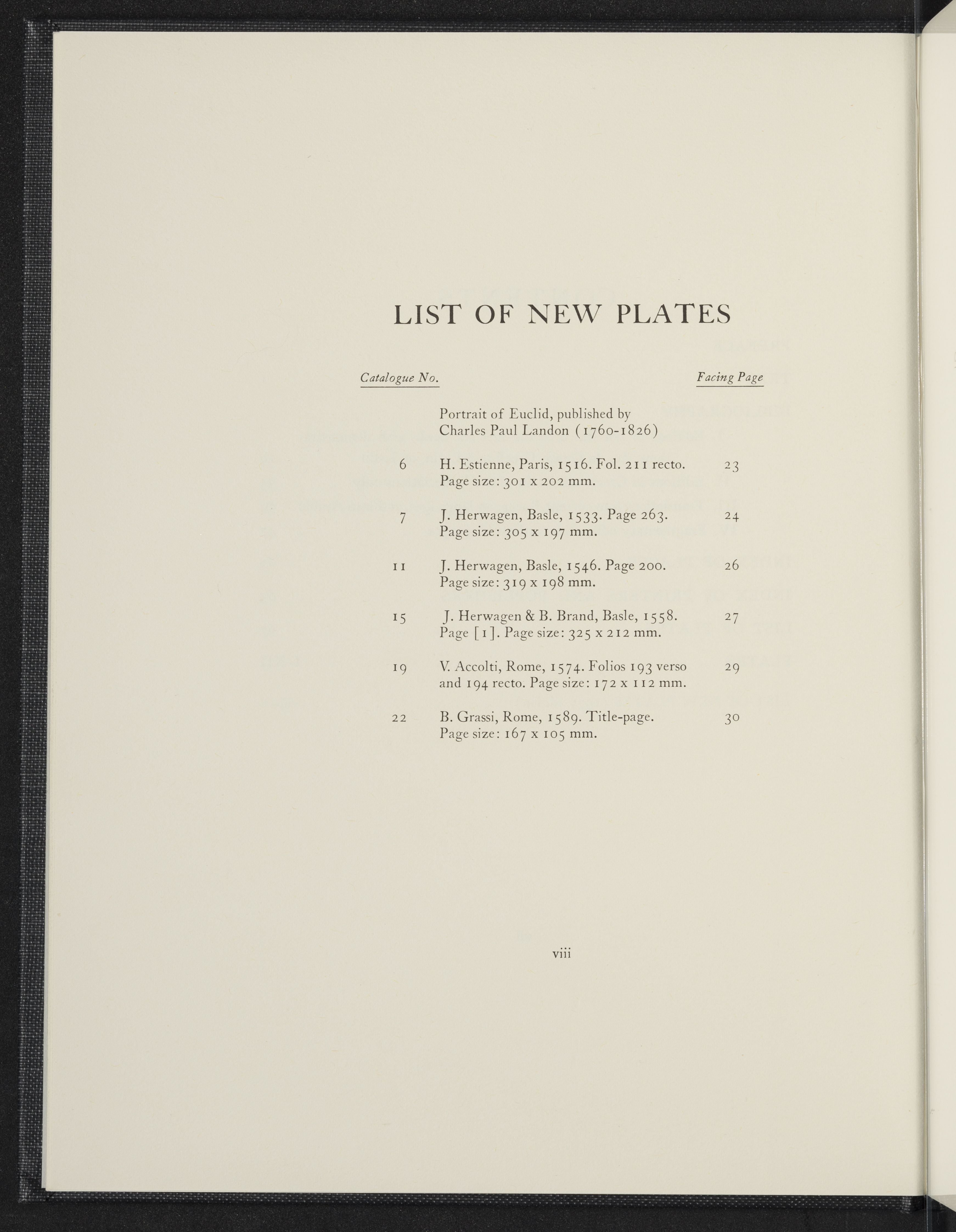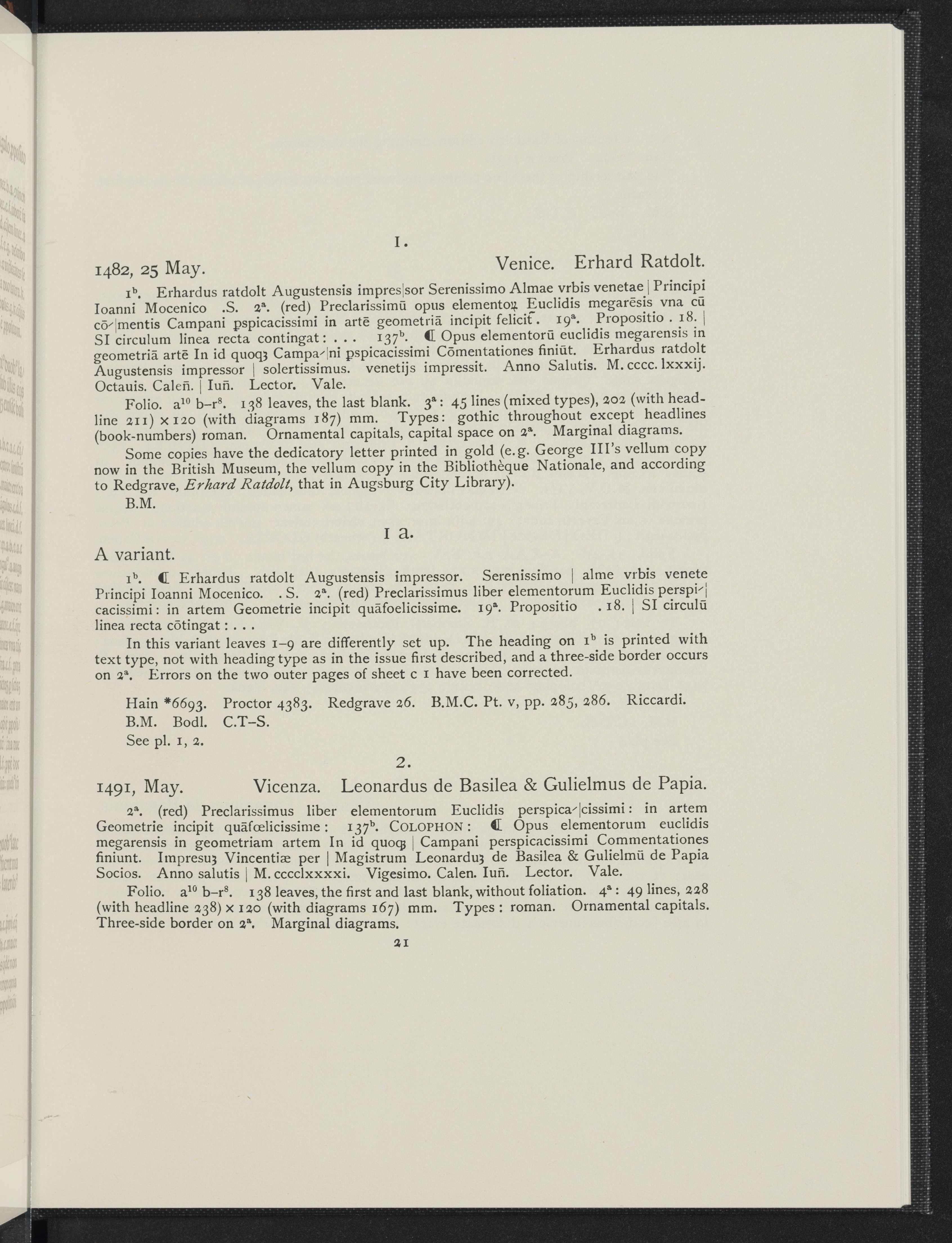 - A reprint of the 1926 version of <em>Early Editions of Euclid's Elements</em> by Charles Thomas-Stanford. This work includes a bibliography of incunabula and 16th-century editions of Euclid's Elements. An overview introduction is followed by annotated lists of editions in Greek, Greek and Latin, and various modern languages.
