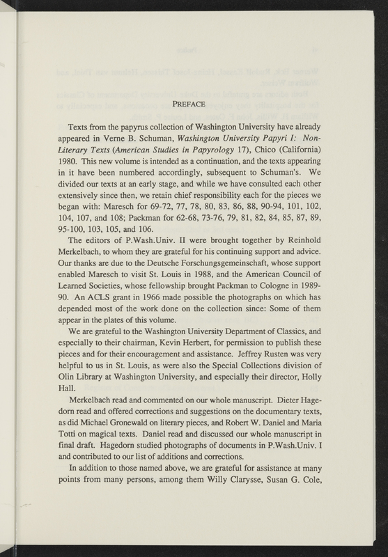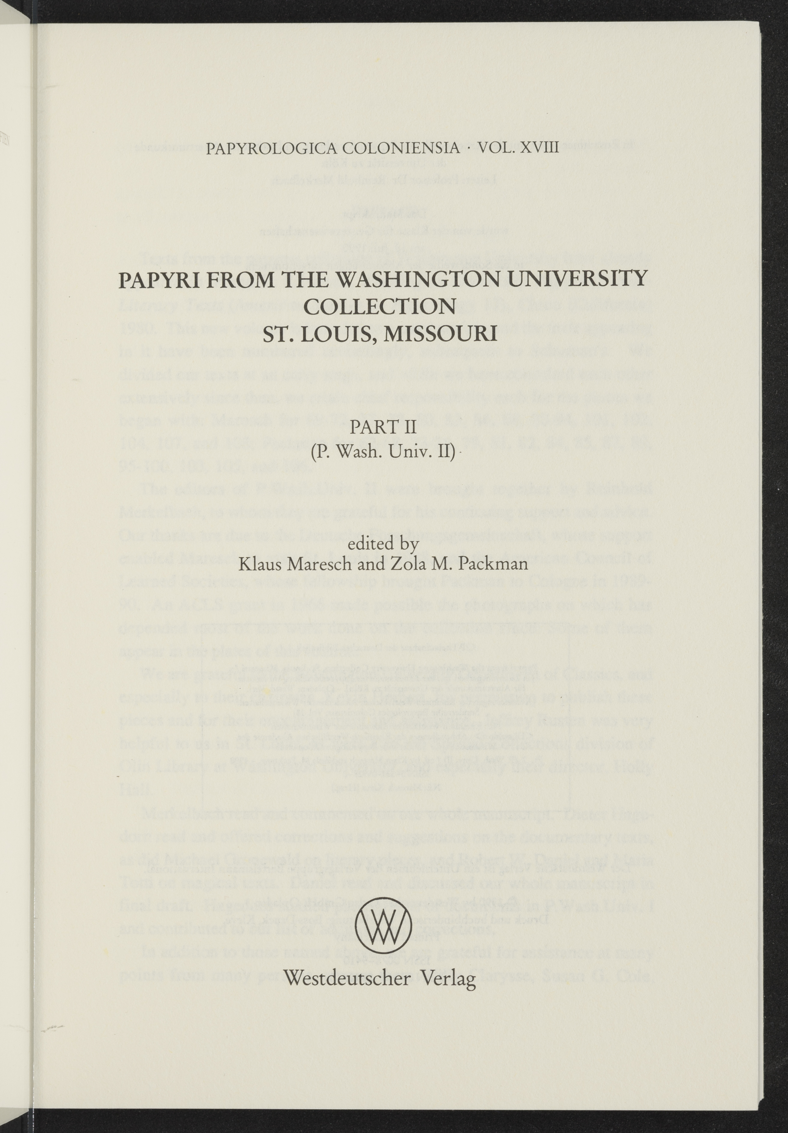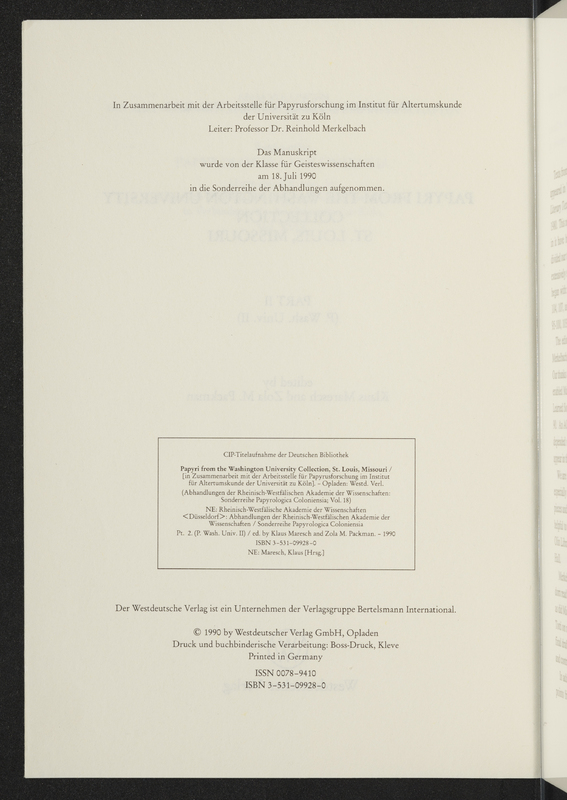 Maresch, Klaus; Packman, Zola M. 1989. “Papyri from the Washington University Collection, St. Louis, Missouri. Part II (1990)”. Opladen : Westdeutscher Verlag, Classic Elements, accessed February 11, 2026, https://digitalexhibits.library.wustl.edu/s/Classic-Elements/item/1950