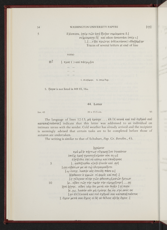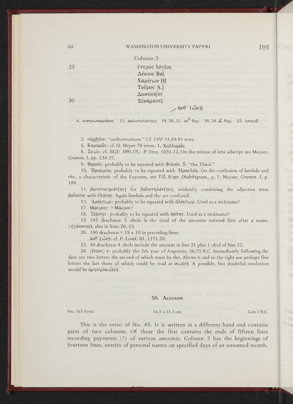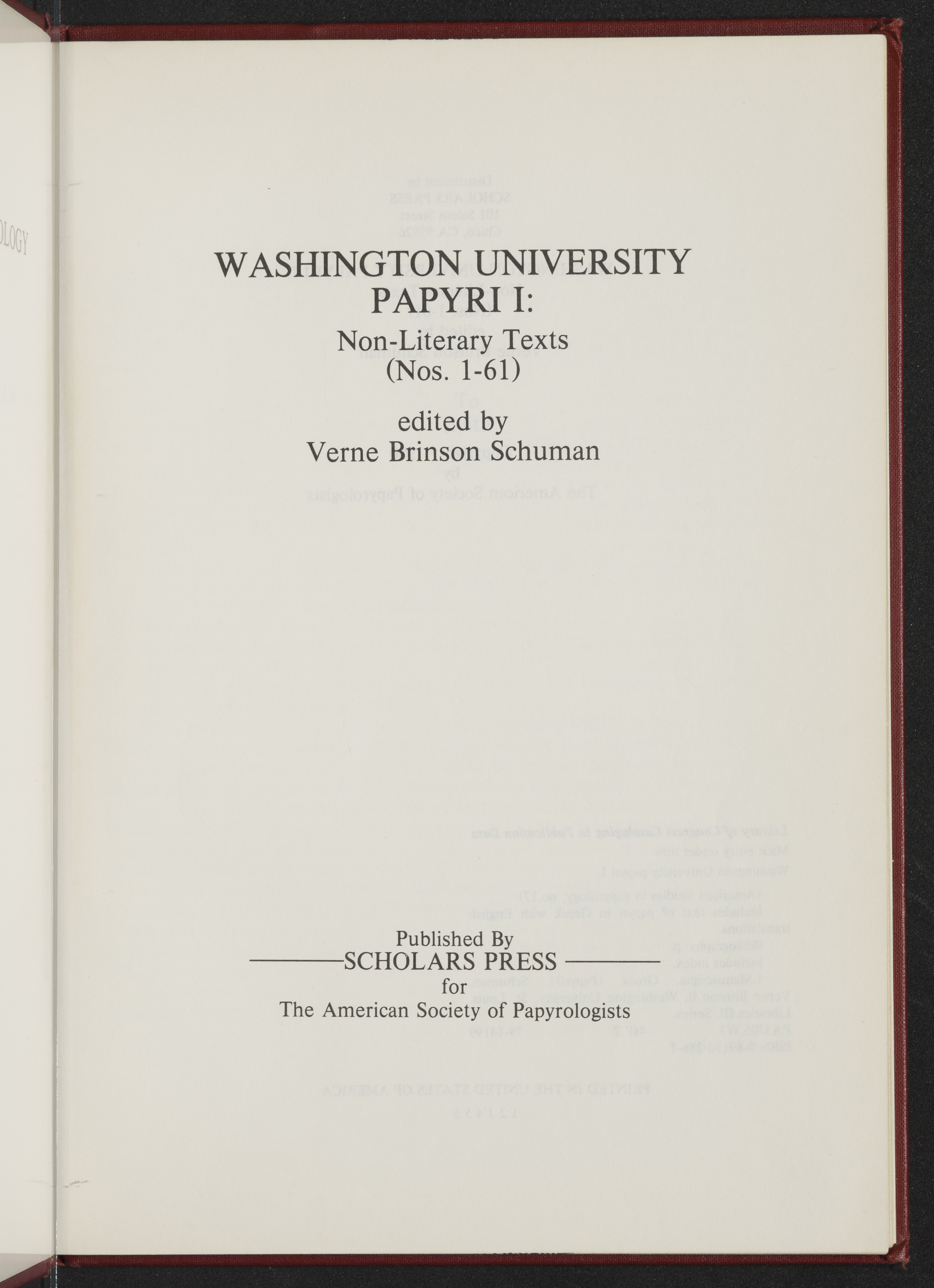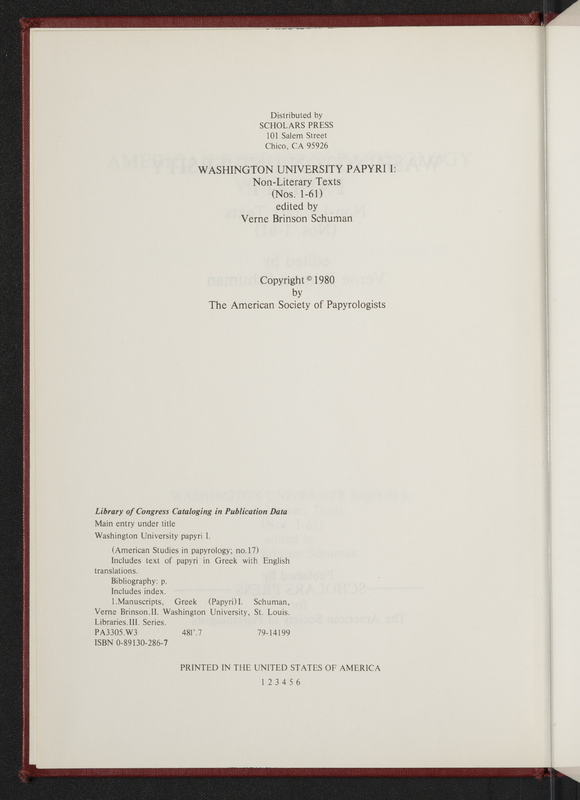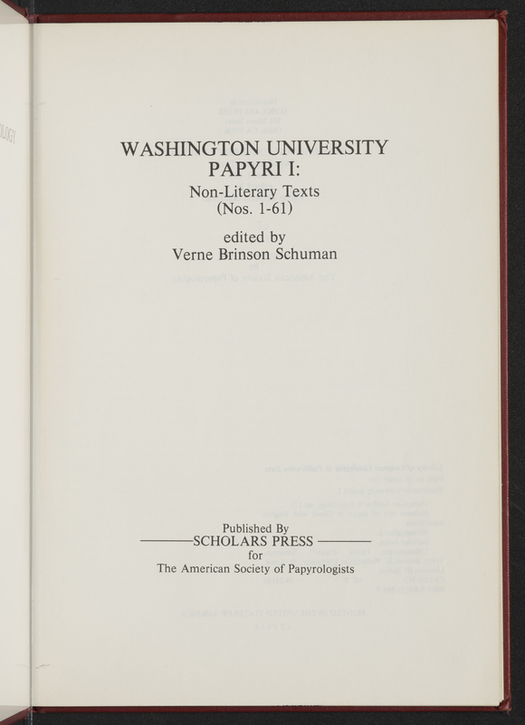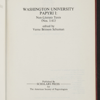 Schuman, Verne Brinson. 1979. “Washington University Papyri I : Non-Literary Texts (1980)”. Missoula, MT : Published by Scholars Press for the American Society of Papyrologists, Classic Elements, accessed March 28, 2026, https://digitalexhibits.library.wustl.edu/s/Classic-Elements/item/1951