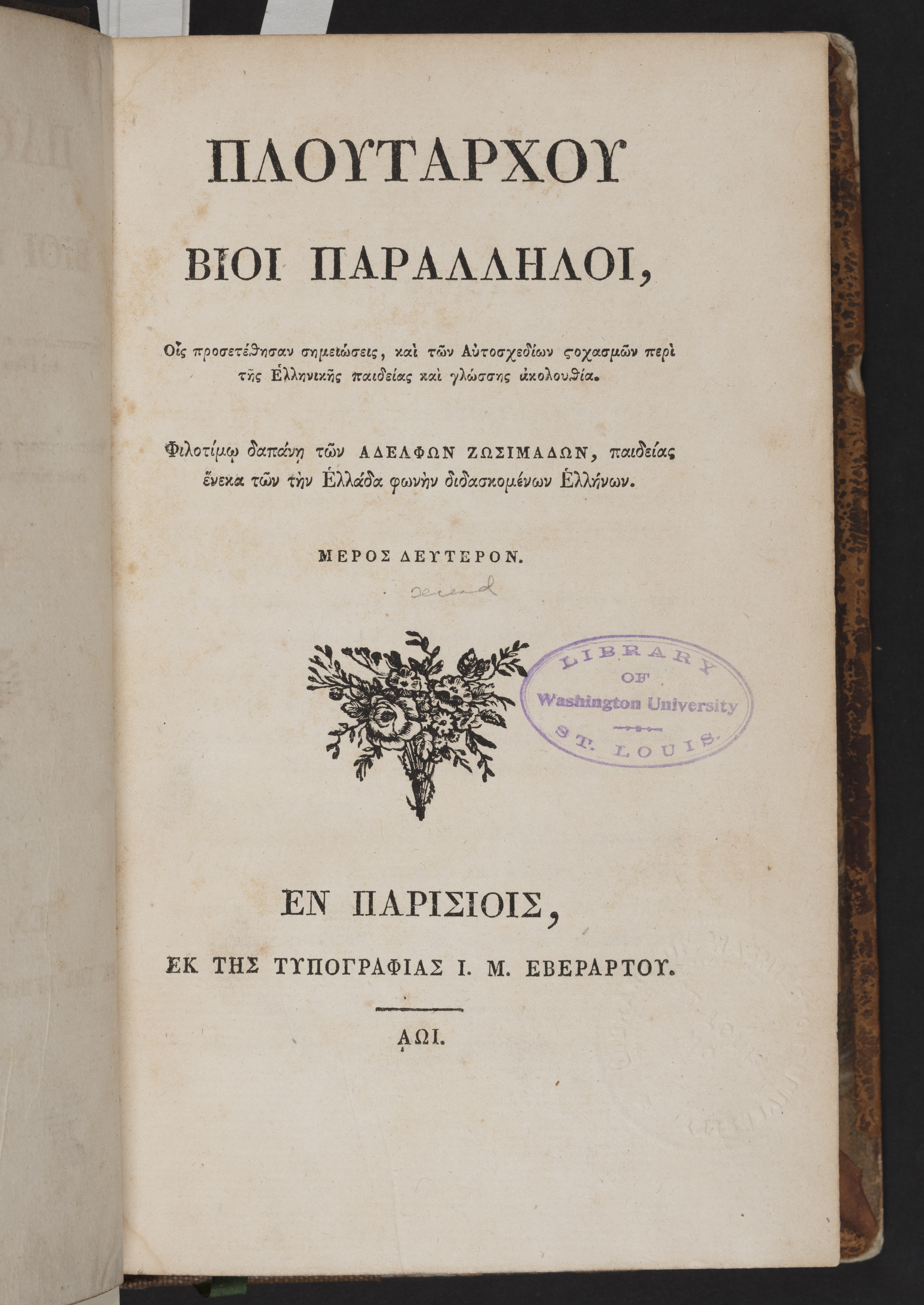 Plutarch, “Plutarch's "Parallel Lives" (1809-1814)”, En Parisiois : Ek tƒìs Typographias I.M. Everartou, 1809-1814, Classic Elements, accessed February 11, 2026, https://digitalexhibits.library.wustl.edu/s/Classic-Elements/item/1952