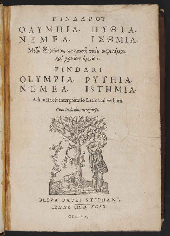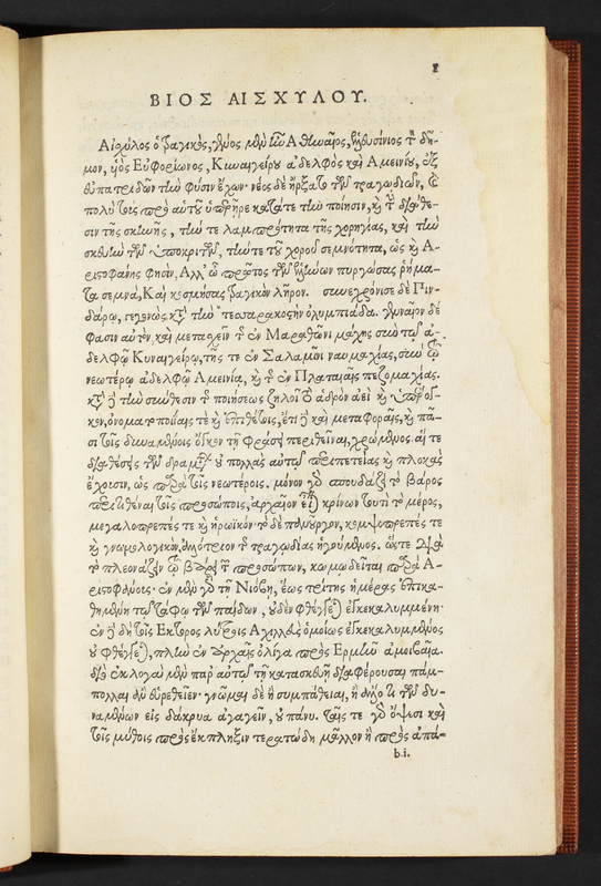 Edition of the tragedies of Aeschylus printed by Swiss Printer and scholar Henri Éstienne, often known as Stephanus. Stephanus is also known for his editions of Plato (which gave us the numbering system we still use in Plato’s texts), and for his "Thesaurus Graecae Linguae", a key work of Greek lexicography.