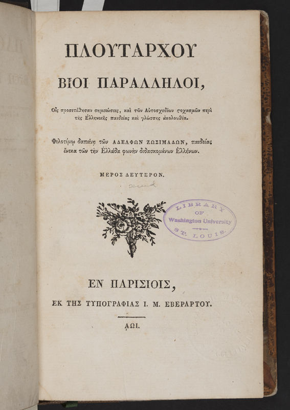 An edition of Plutarch’s "Lives" owned by Thomas Jefferson. It includes a note written by Jefferson in Greek in his own hand.