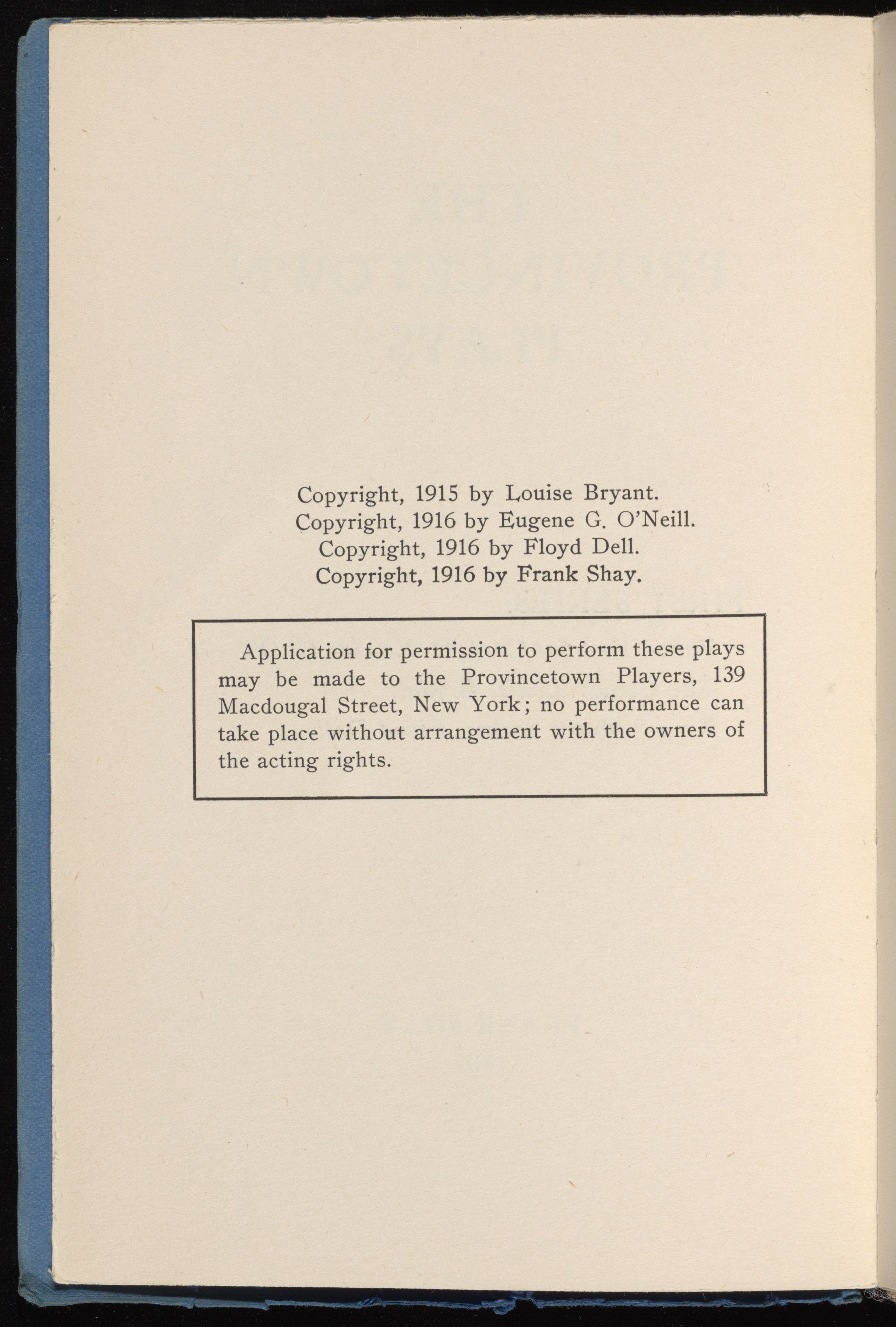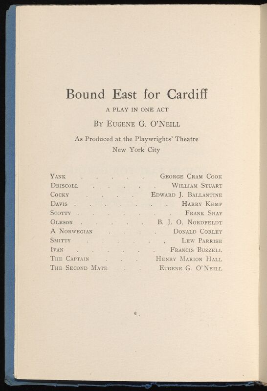 O’Neill, Eugene. 1915. "Bound East for Cardiff" in The Provincetown Plays First Series. eOneill.Com: An Electronic Eugene O’Neill Archive. Frank Shay, The Assembled Playwright: Harley Hammerman's Eugene O'Neill Collection, accessed February 11, 2026, https://digitalexhibits.library.wustl.edu/s/assembled-playwright/item/48499