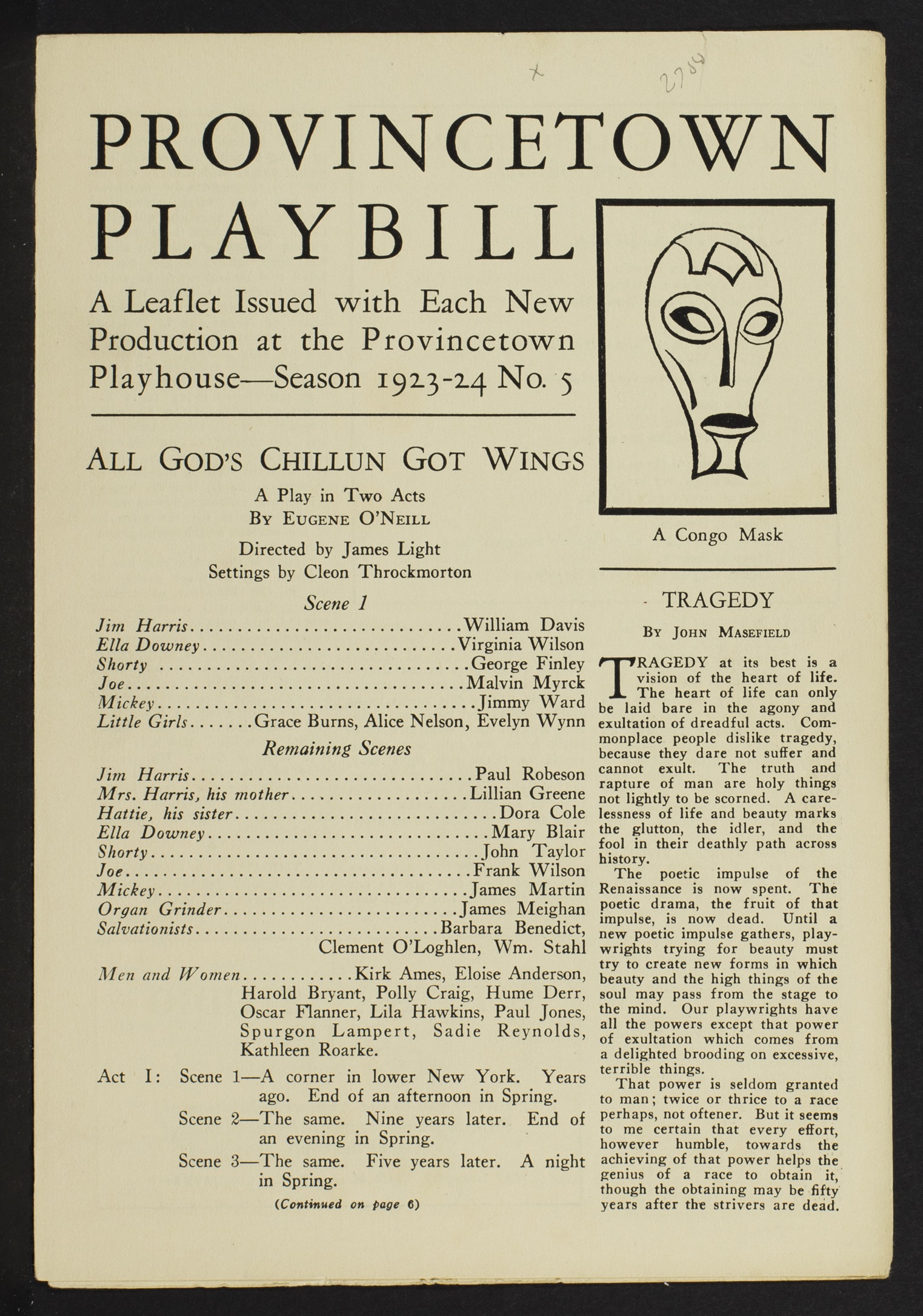 O’Neill, Eugene. 1924. Program for All God’s Chillun Got Wings. eOneill.Com: An Electronic Eugene O’Neill Archive. Provincetown Playhouse, The Assembled Playwright: Harley Hammerman's Eugene O'Neill Collection, accessed February 12, 2026, https://digitalexhibits.library.wustl.edu/s/assembled-playwright/item/48530