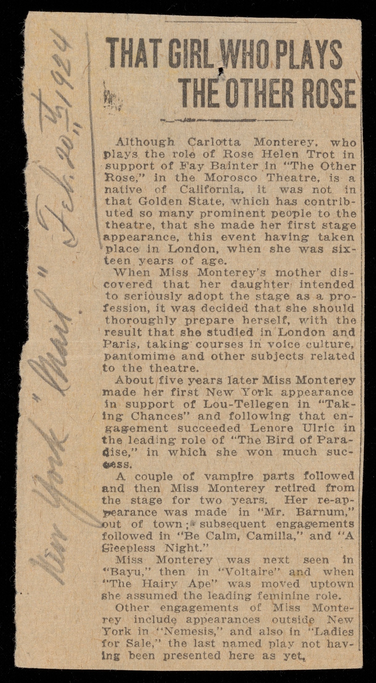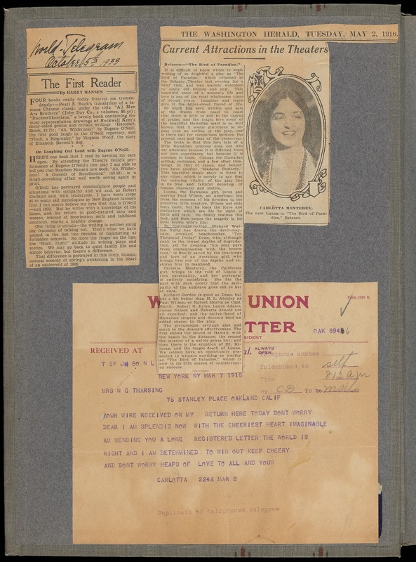 O'Neill, Eugene, “Scrapbook detailing Carlotta Monterey's career”, 1915-1933, The Assembled Playwright: Harley Hammerman's Eugene O'Neill Collection, accessed February 11, 2026, https://digitalexhibits.library.wustl.edu/s/assembled-playwright/item/48555