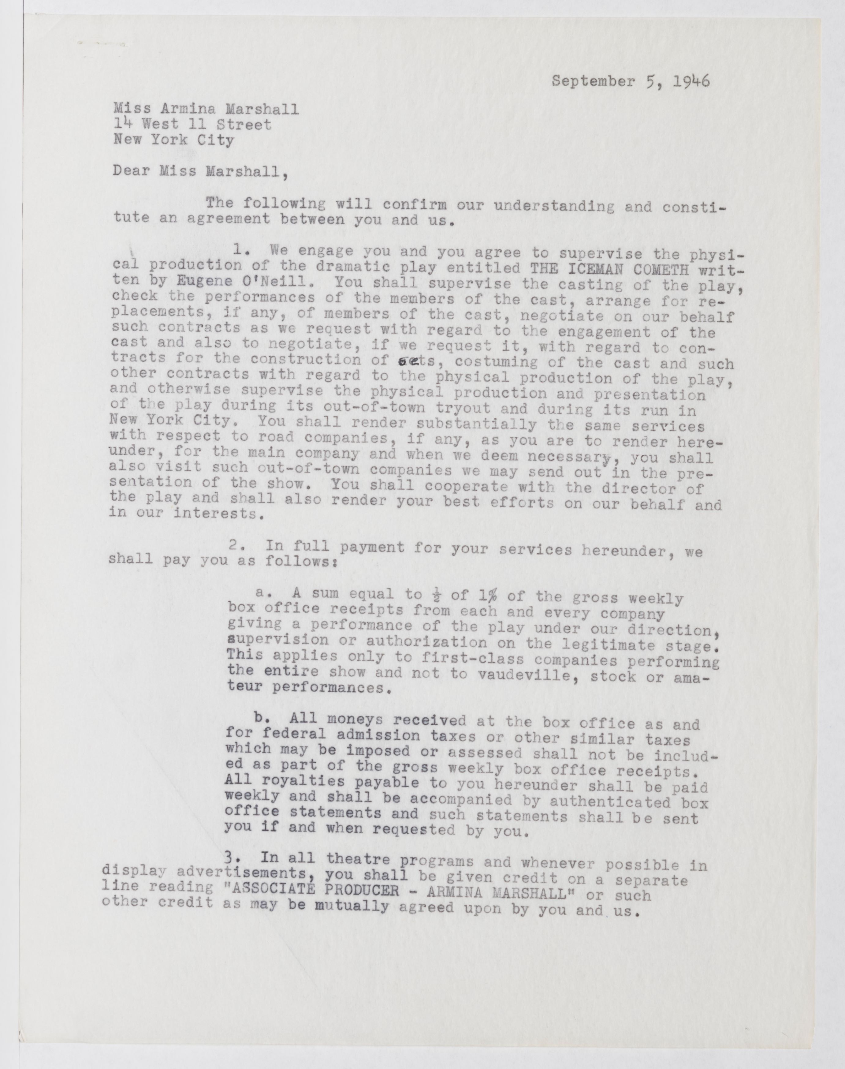 O’Neill, Eugene. 1946. Associate Producer Agreement for The Iceman Cometh. eOneill.Com: An Electronic Eugene O’Neill Archive. Martin Beck Theatre, The Assembled Playwright: Harley Hammerman's Eugene O'Neill Collection, accessed February 11, 2026, https://digitalexhibits.library.wustl.edu/s/assembled-playwright/item/49388
