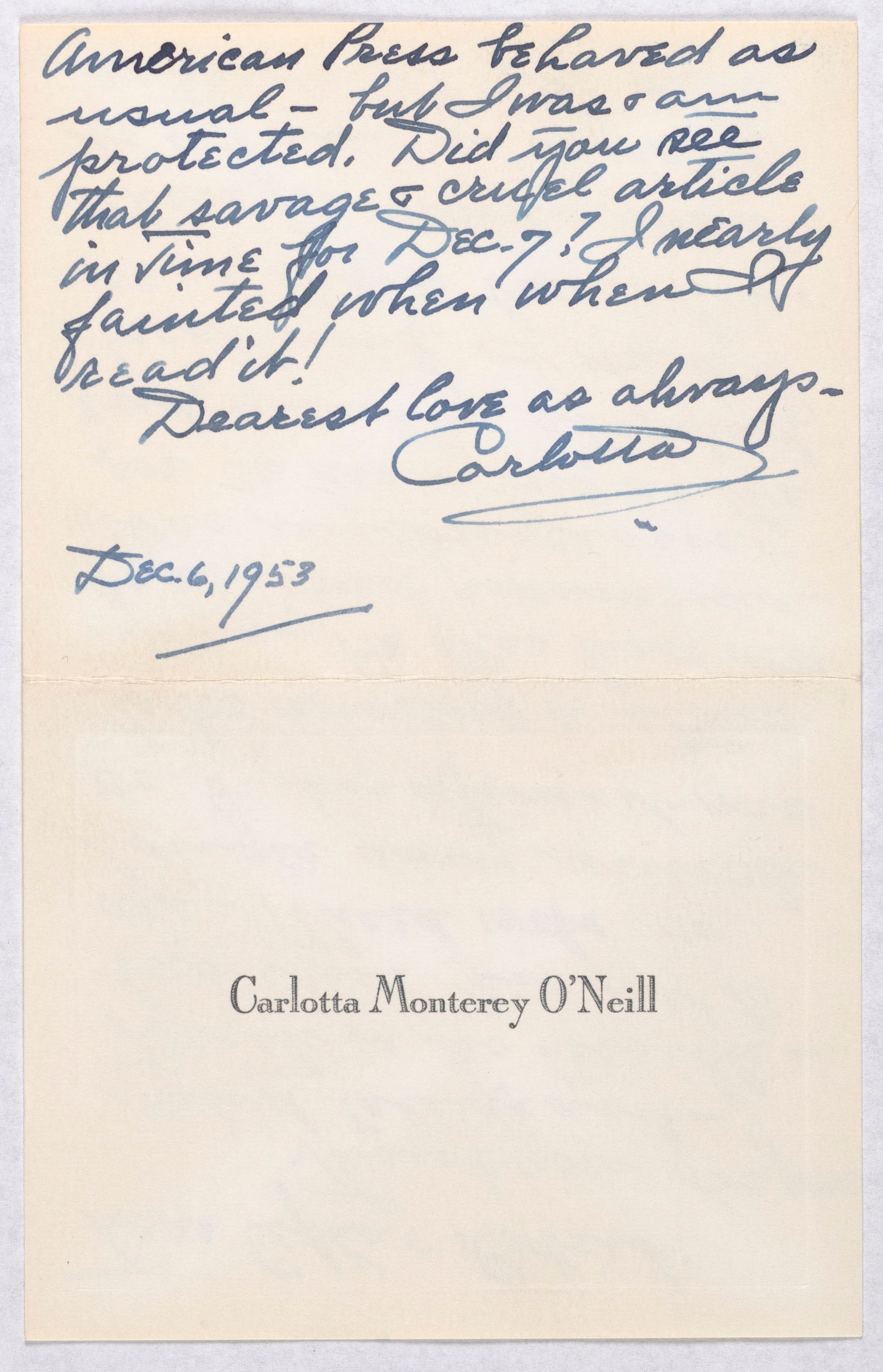 Carlotta Monterey O’Neill. 1953. Carlotta Monterey O’Neill to Robert and Cepha Sisk. eOneill.Com: An Electronic Eugene O’Neill Archive, The Assembled Playwright: Harley Hammerman's Eugene O'Neill Collection, accessed February 11, 2026, https://digitalexhibits.library.wustl.edu/s/assembled-playwright/item/49416