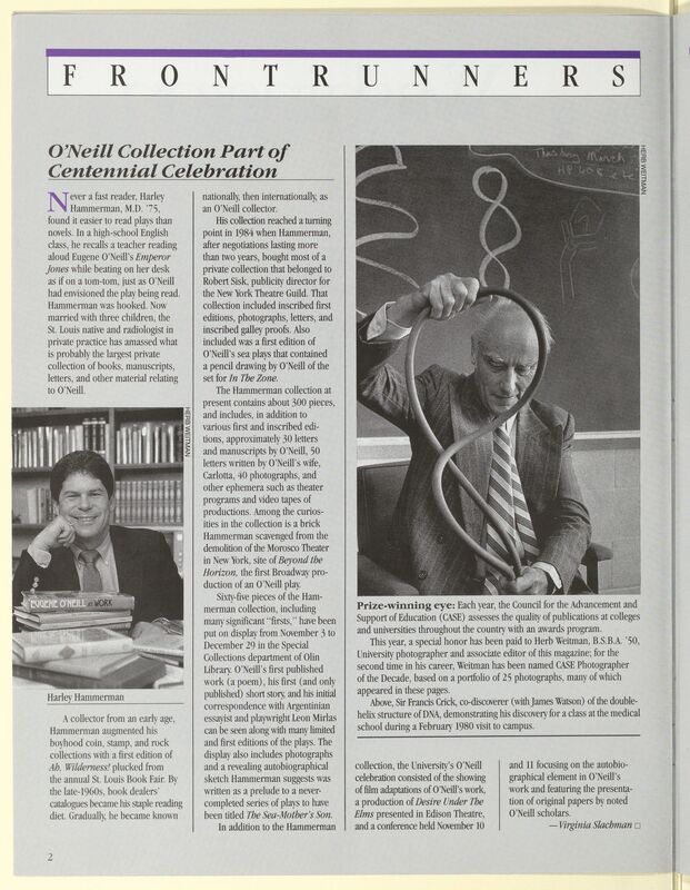 "O’Neill Collection Part of Centennial Celebration". 1988, The Assembled Playwright: Harley Hammerman's Eugene O'Neill Collection, accessed February 11, 2026, https://digitalexhibits.library.wustl.edu/s/assembled-playwright/item/51839
