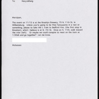 - These printed emails from poet Mark Bibbins to Mary Jo Bang reveal a long-standing friendship. Bibbins, known for his work exploring identity, queerness, and politics, addresses Bang with affectionate nicknames—“Marzipan,” “Lolly”—and signs off as “Mollasses” and “Bumble.” Their witty exchanges include shared reflections on difficult days as well as plans to see a film or visit a museum.