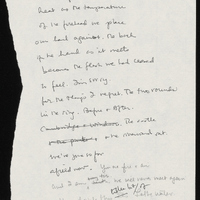 - Draft of Mary Jo Bang's poem "A Place" handwritten on a scrap of paper.