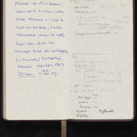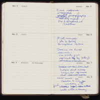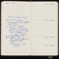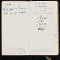 - Brown leather 1987 pocket calendar from Gump's San Francisco. Calendar includes Mary Jo Bang's handwritten notes, appointments, and drafts of poems.