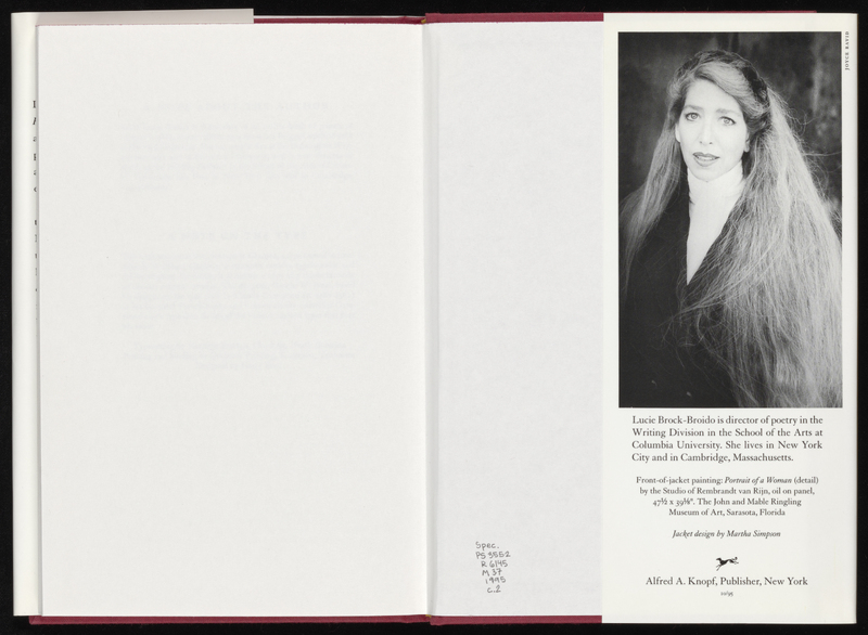 Part of Lucie Brock-Broido, The Master Letters. Alfred A. Knopf. Copy with handwritten dedication to Bang.
