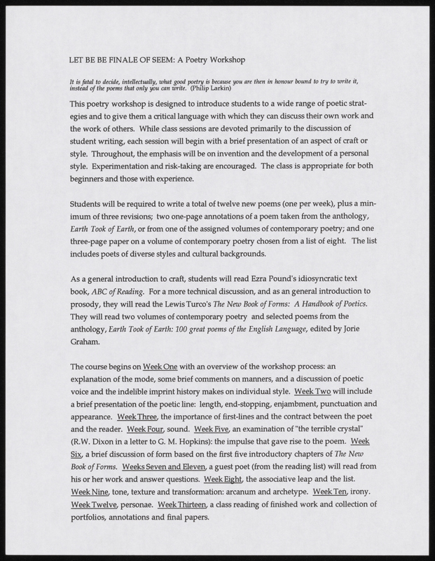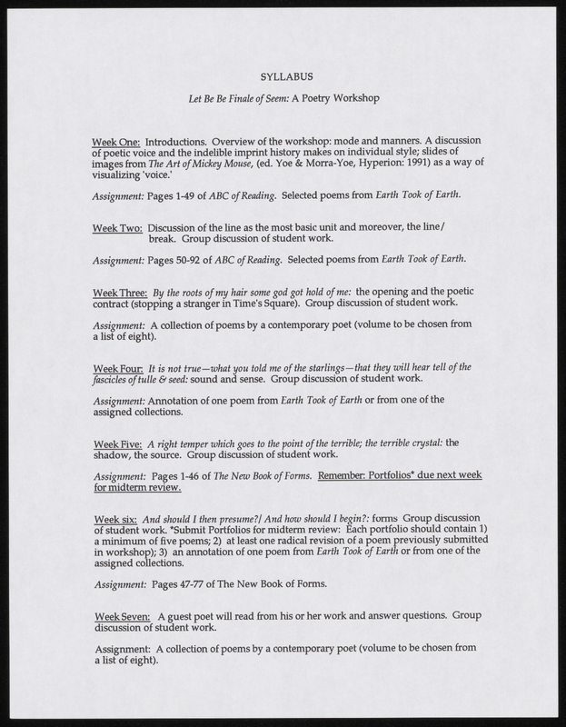 Yale syllabus from a class Bang taught emphasizes poetic experimentation and risk-taking. Assigned works include Ezra Pound, Jorie Graham, and Arthur Sze.