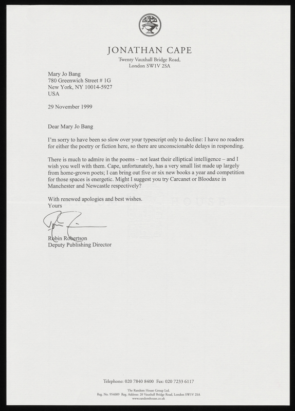Robin Robertson praises the “elliptical intelligence” of Bang’s poems and recommends other publishers for her work. He also notes the publishing house’s constraints, including a lack of readers, as the reason for an “unconscionable delay” in response. The letter shows both the challenges of literary publishing and the tone of encouragement that sustained Bang’s persistence.