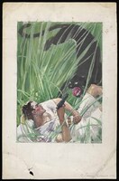 Magazine illustration by Al Parker for fiction story "Love Can Be a Problem" by Faith Baldwin, Good Housekeeping, May 1940 The moment before a confrontation between two men at a dinner party. The man with his back to the viewer holds a bottle menacingly behind his back, and grips the hand of a woman sitting at one of the tables. The background is a jungle mural. -