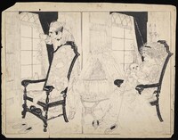 "It's a Big World for a Baby" by Nell Brinkley, ca.1920 A woman sits in a chair holding a baby while a man stands behind an empty chair and holds back a curtain to look out the window. An empty bassinet sits next to the woman. -