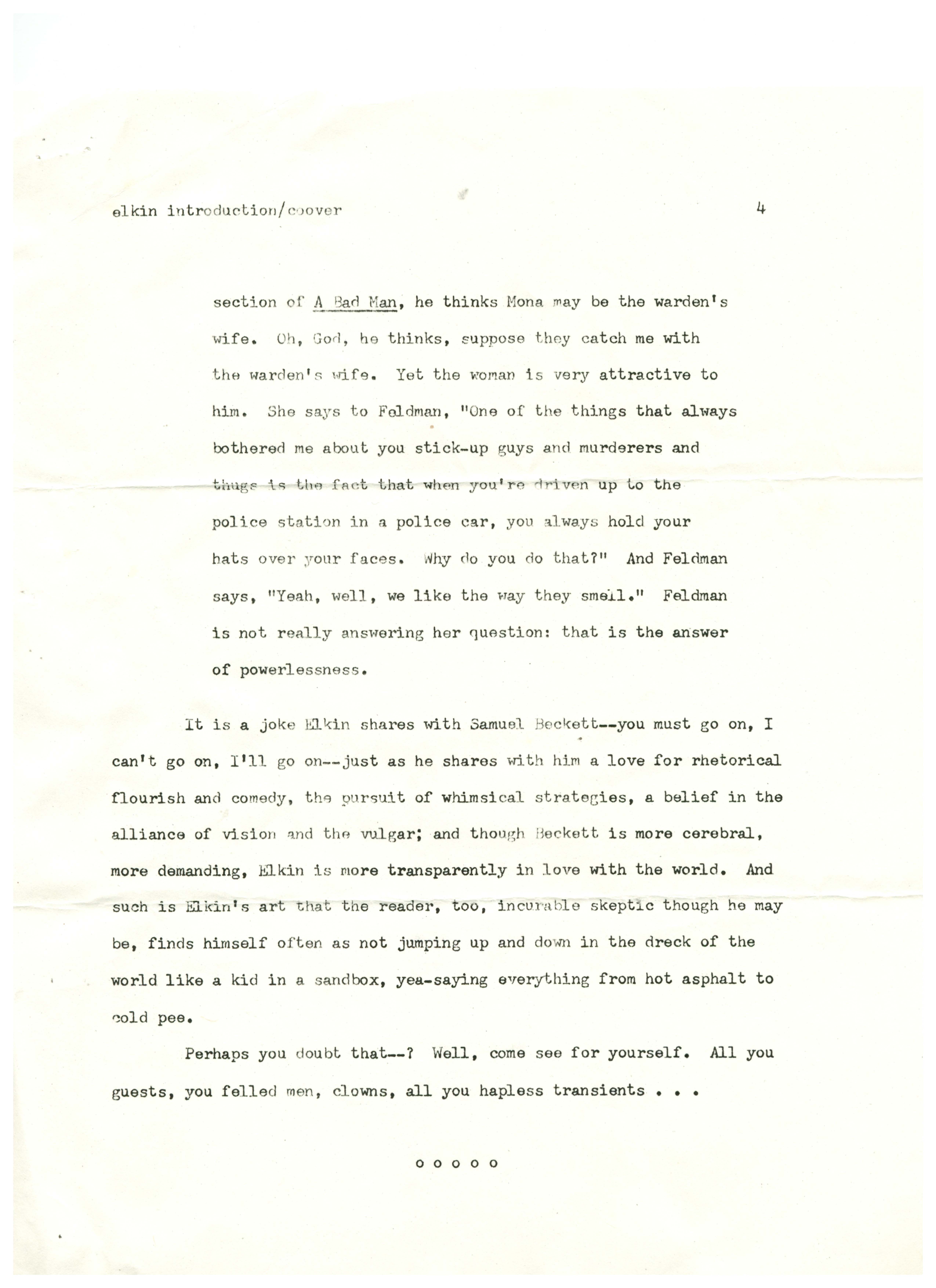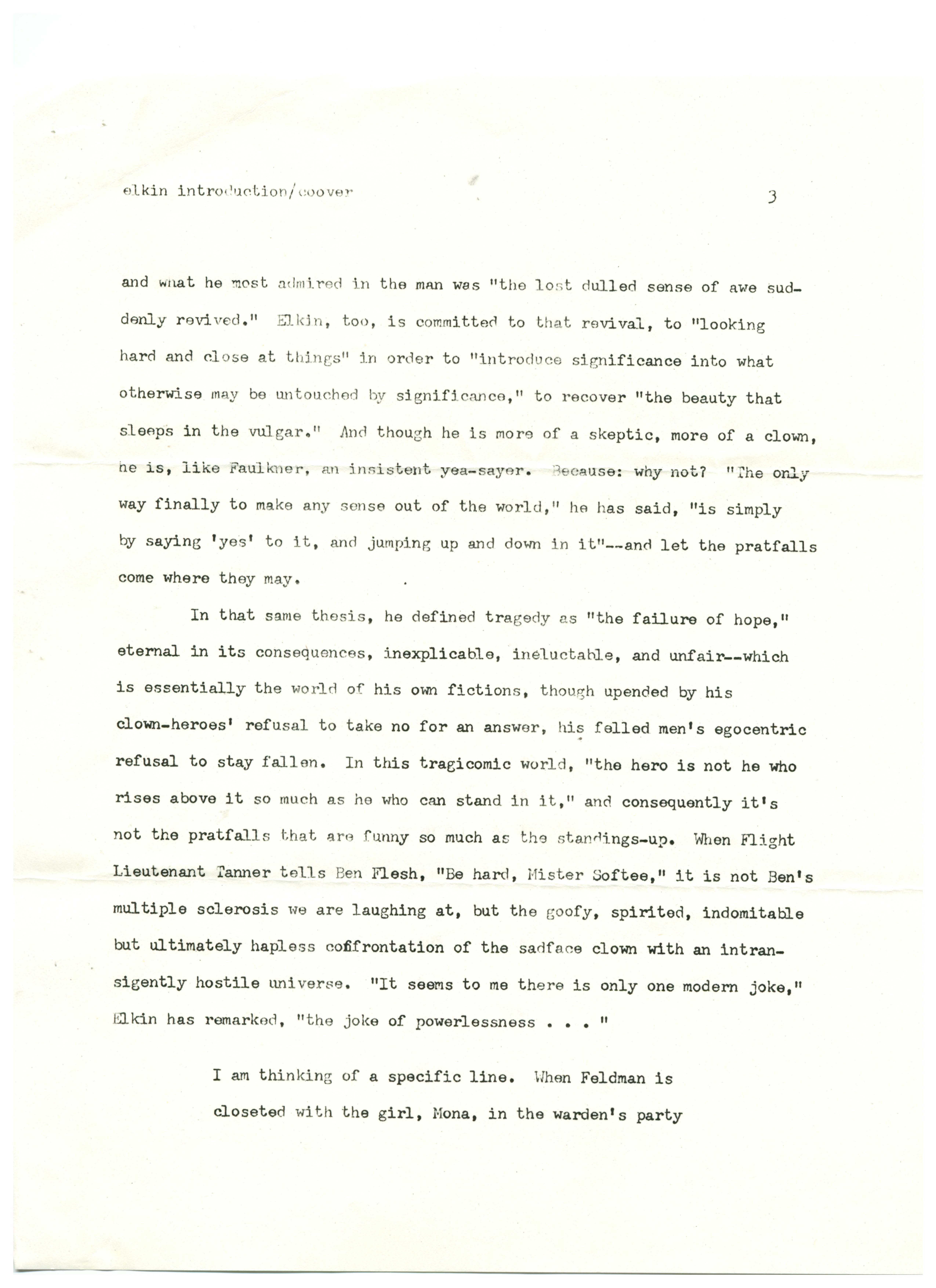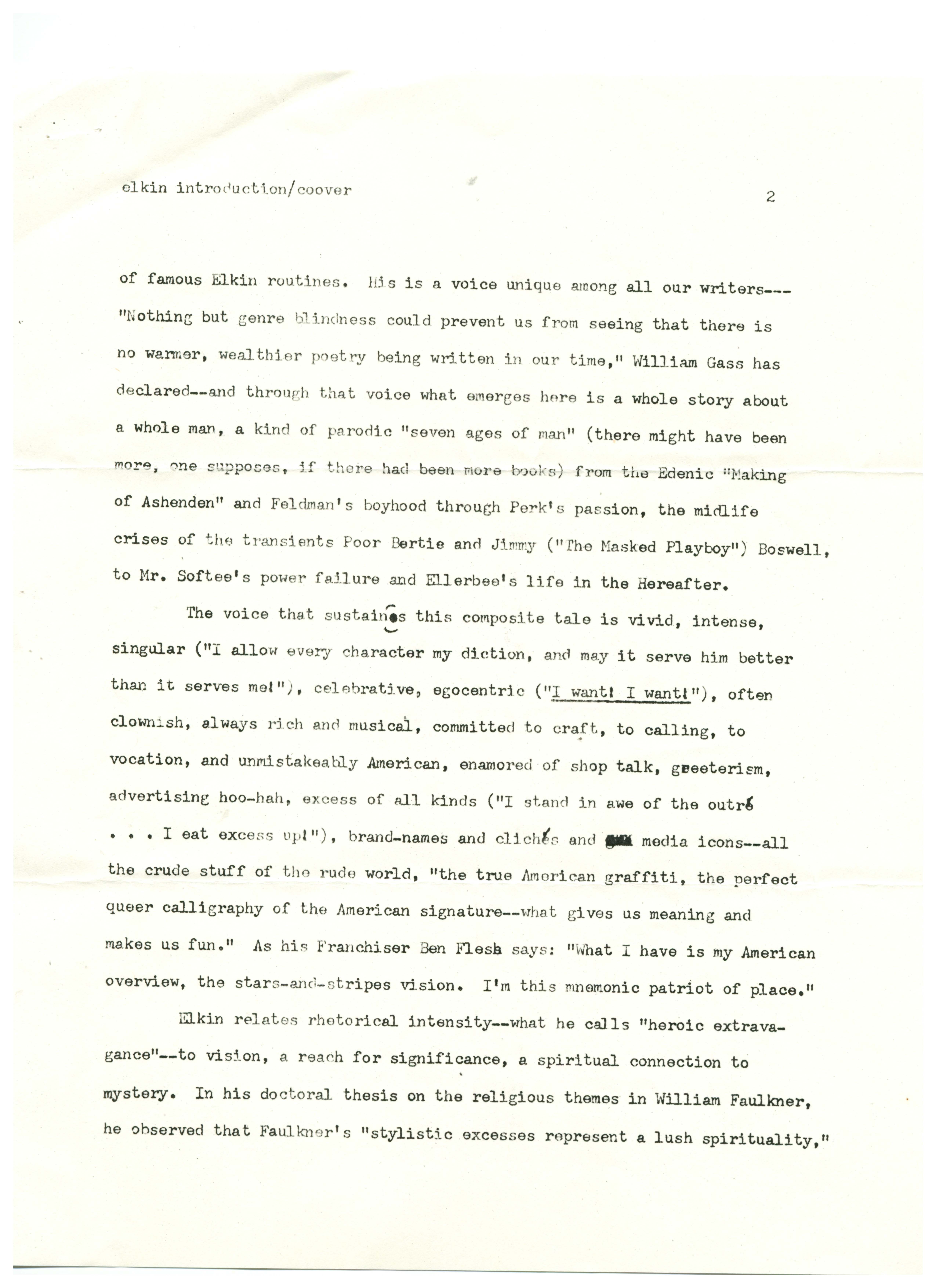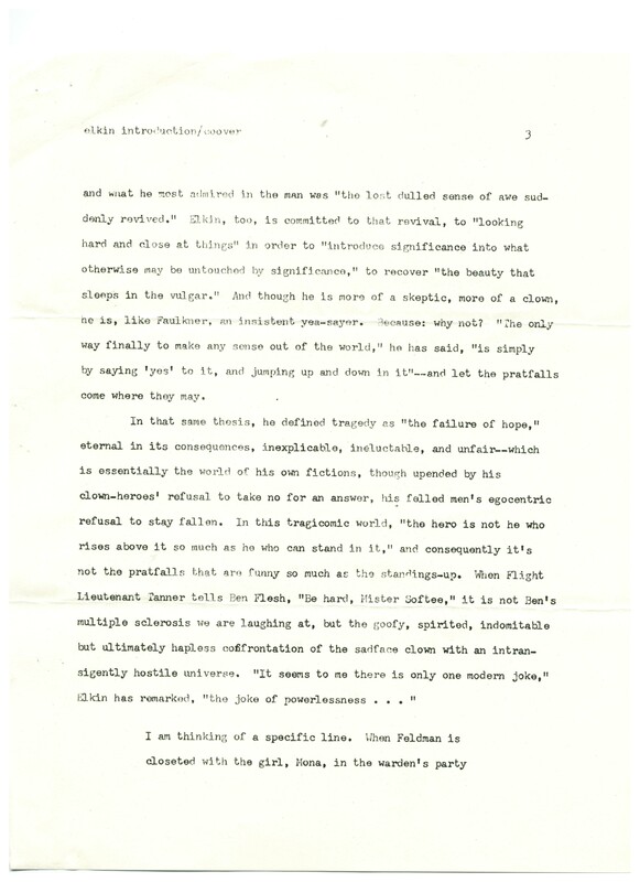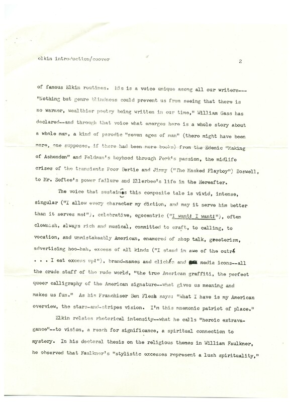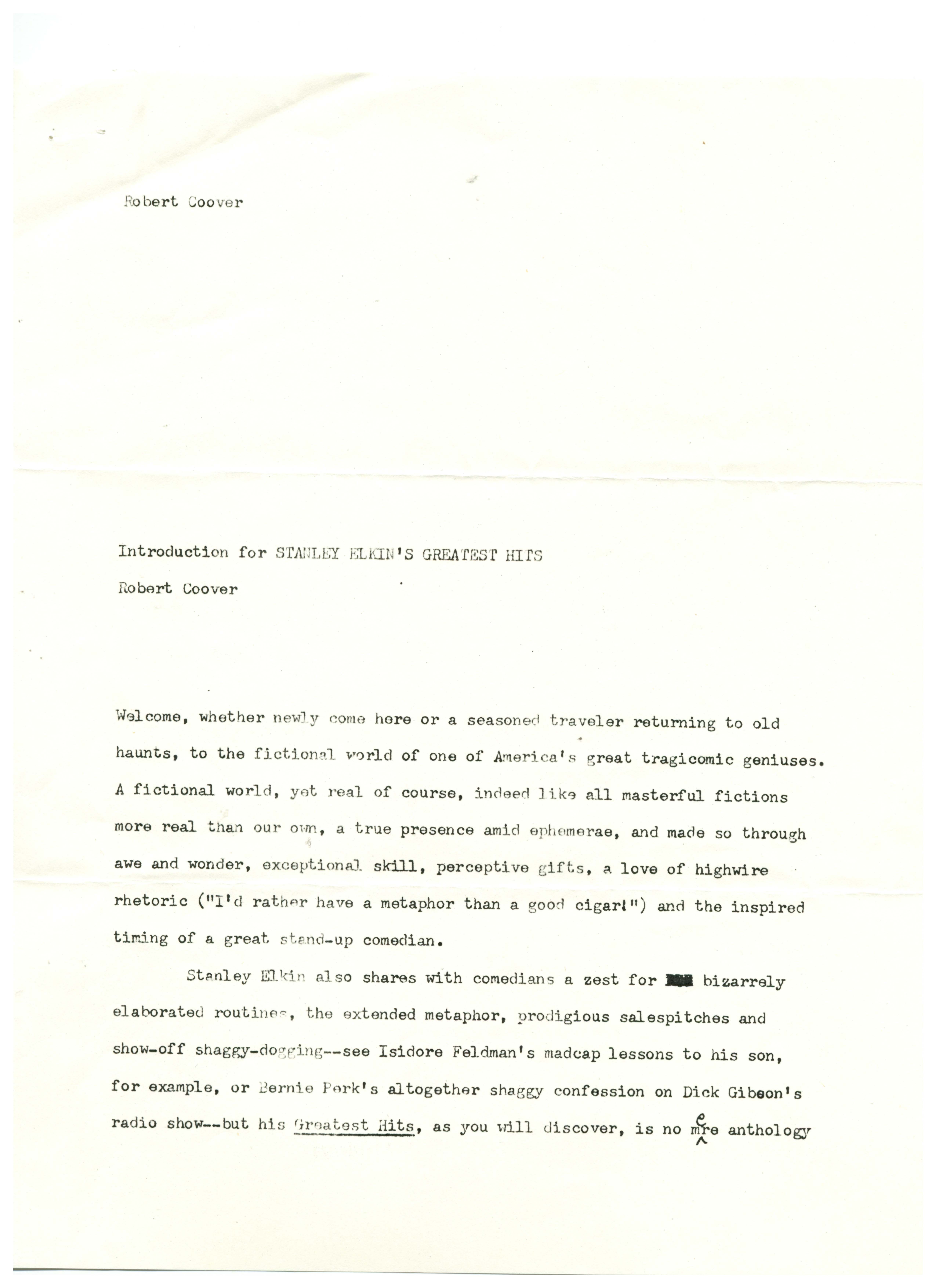 Coover, Robert. Letter. 1980. “‘Introduction for Stanley Elkin’s Greatest Hits’ by Robert Coover”, 1980, Stanley and Joan Elkin’s Artistic Kingdom, accessed February 10, 2026, https://digitalexhibits.library.wustl.edu/s/elkin/item/29800