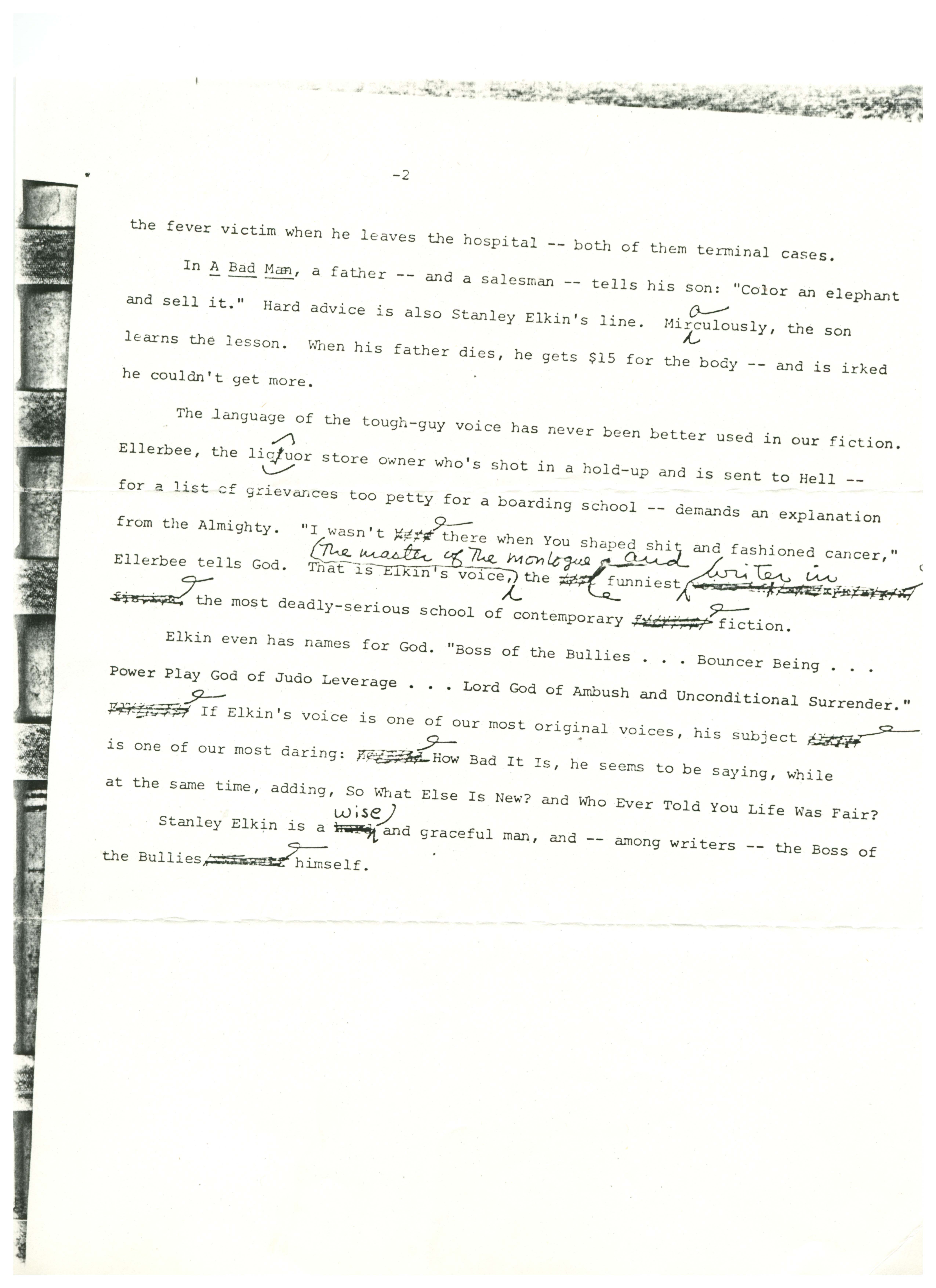 Irving, John, “"Boss of the Bullies" by John Irving”, not dated, Stanley and Joan Elkin’s Artistic Kingdom, accessed March 13, 2026, https://digitalexhibits.library.wustl.edu/s/elkin/item/29801