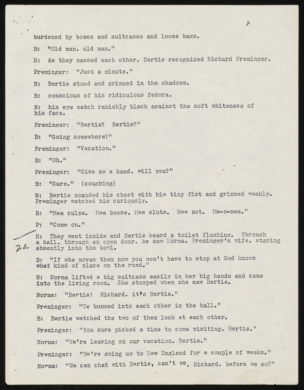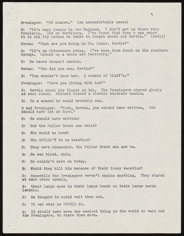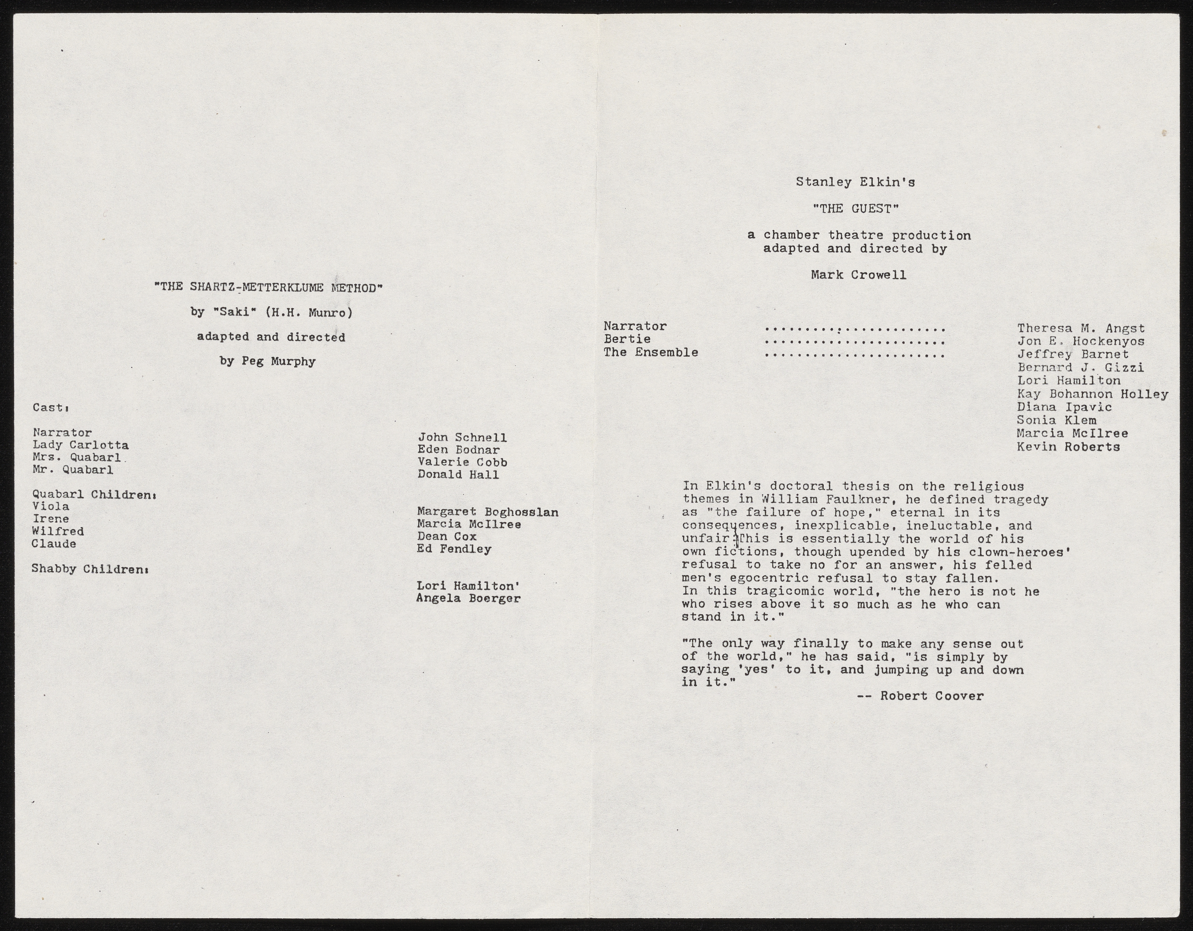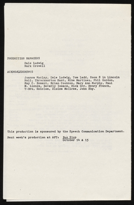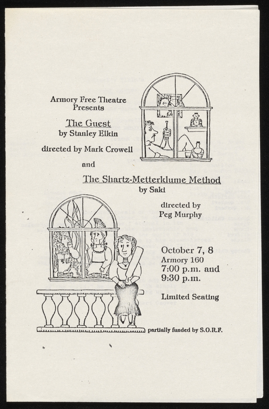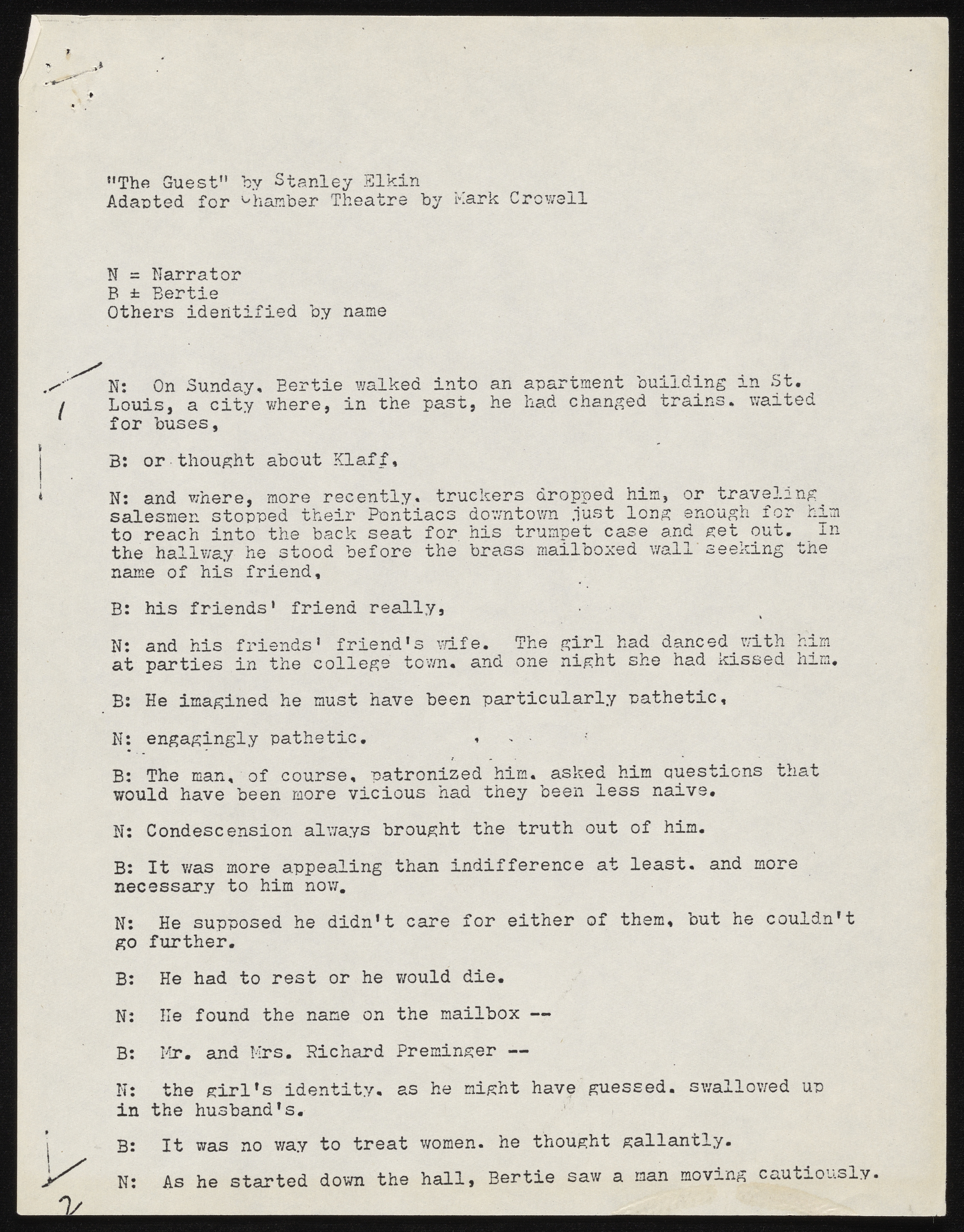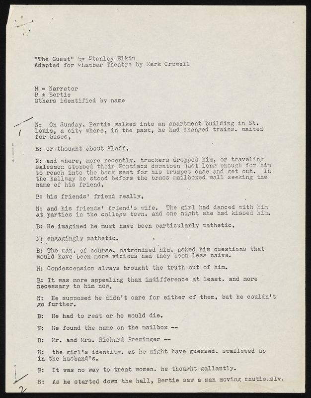 - Photocopy of typescript play adaptation of "The Guest" by Mark Crowell. It was adapted for the Chamber Theatre and the Armory Free Theatre and includes a program and flyer for Armory Free Theatre production.