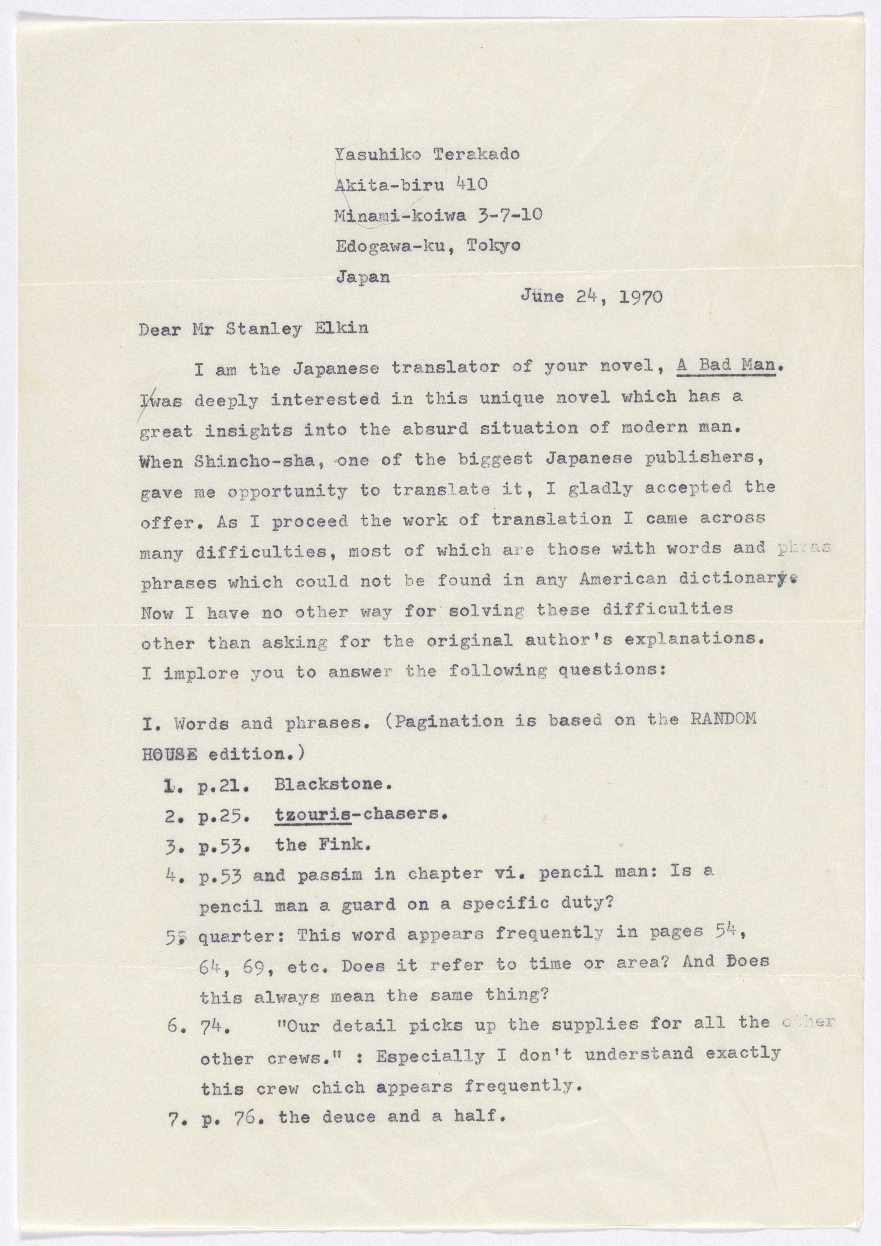 Terakado, Yasuhiko. Letter. 1970. “Terakado to Elking, 1970: June 24”, 1970, Stanley and Joan Elkin’s Artistic Kingdom, accessed February 11, 2026, https://digitalexhibits.library.wustl.edu/s/elkin/item/58383