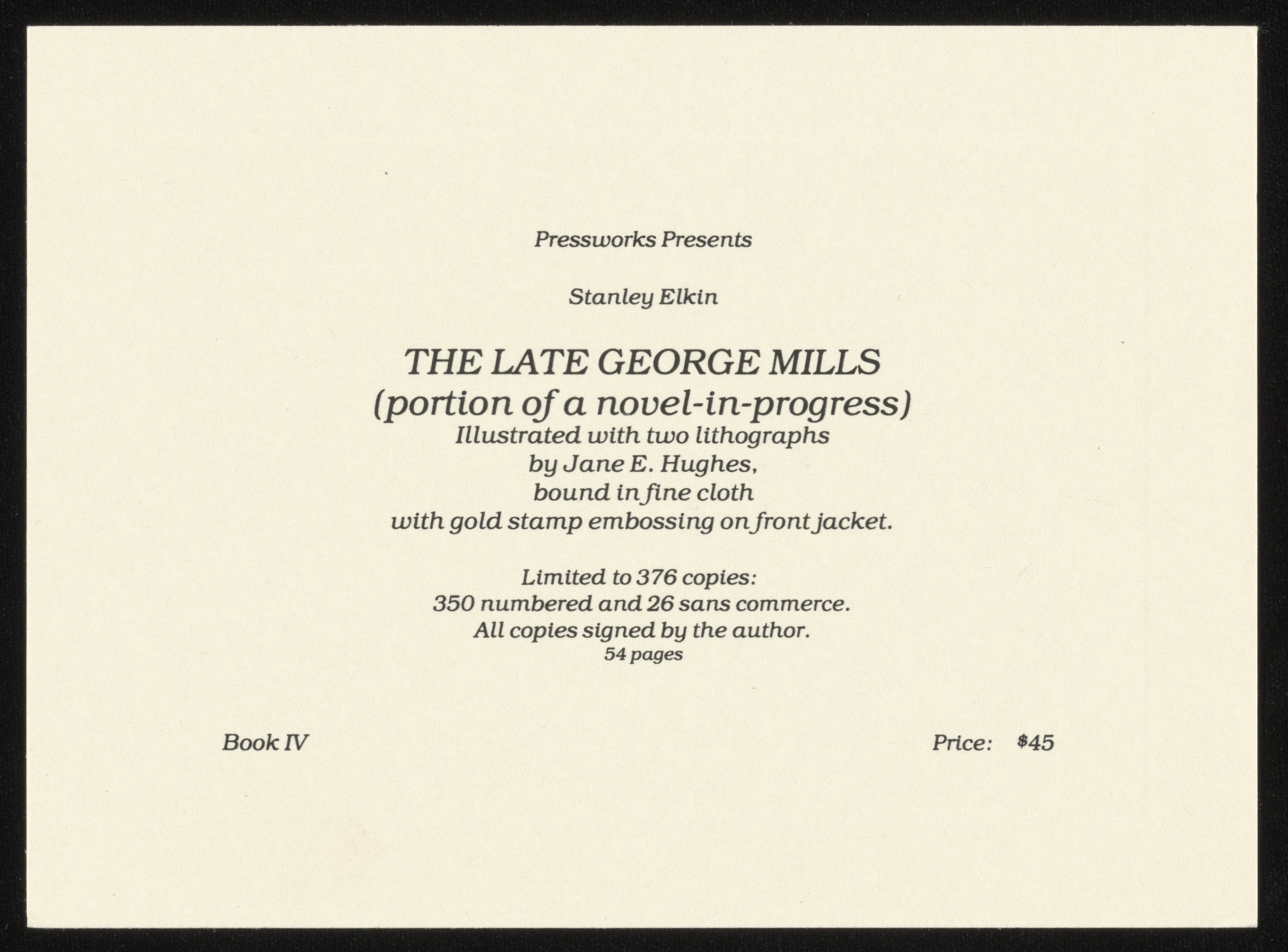 “George Mills - Pressworks Presents”, 1982-1983, Stanley and Joan Elkin’s Artistic Kingdom, accessed February 11, 2026, https://digitalexhibits.library.wustl.edu/s/elkin/item/58530