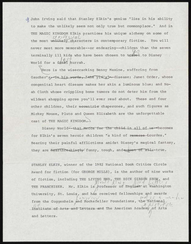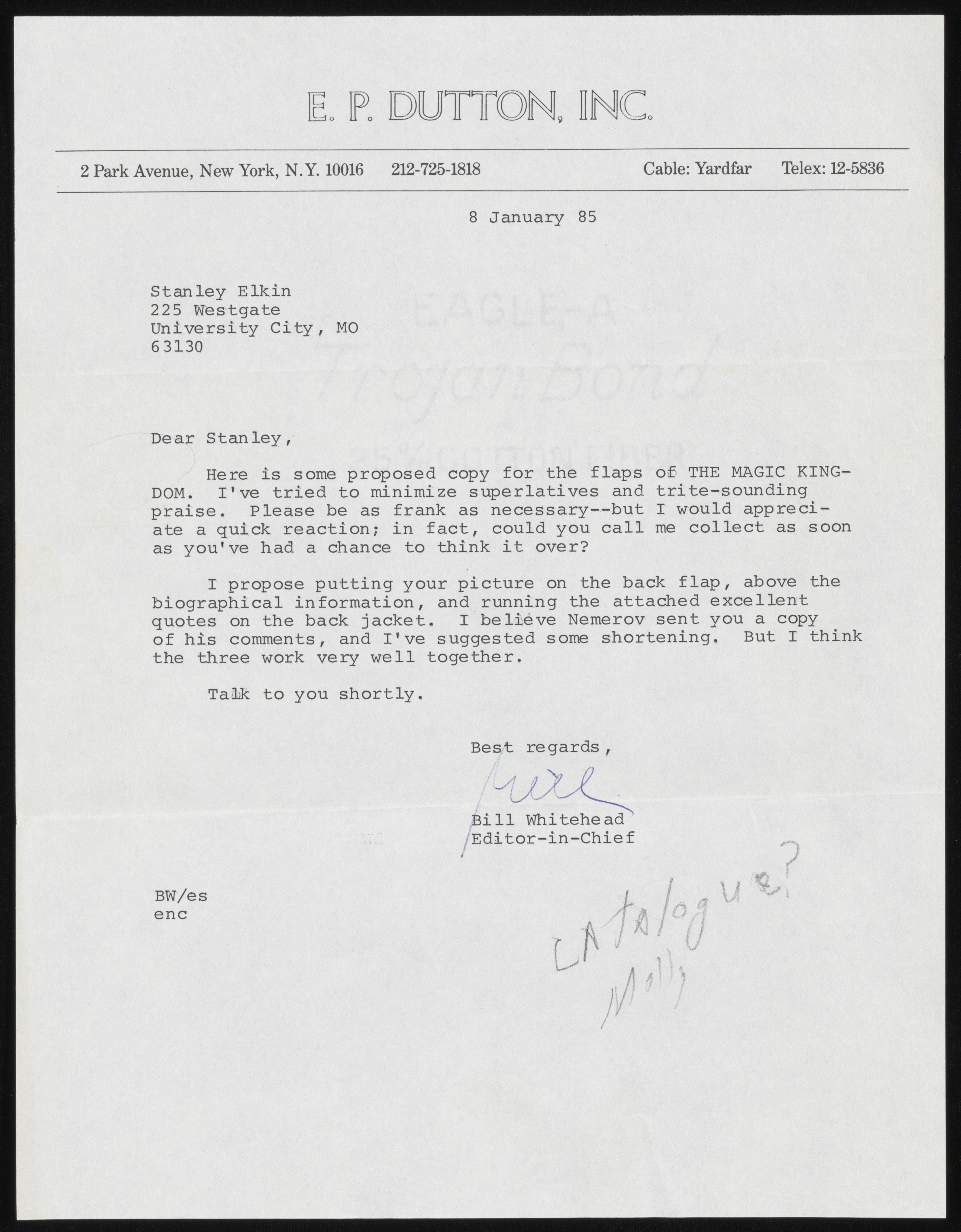 Whitehead, Bill. Letter. 1985. “Whitehead to Elkin, With Flap Copy”, 1985, Stanley and Joan Elkin’s Artistic Kingdom, accessed February 11, 2026, https://digitalexhibits.library.wustl.edu/s/elkin/item/58568