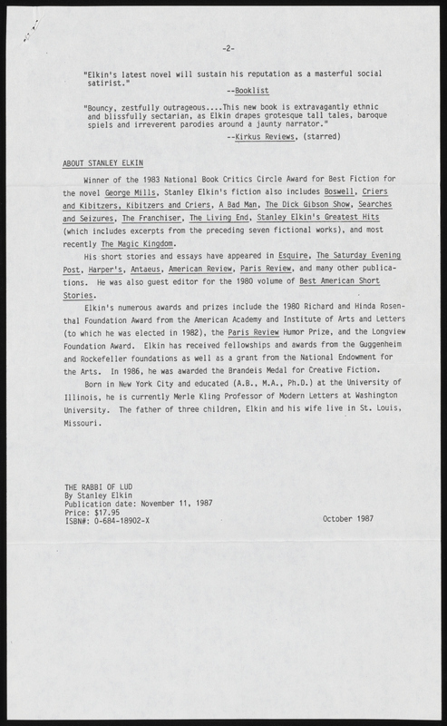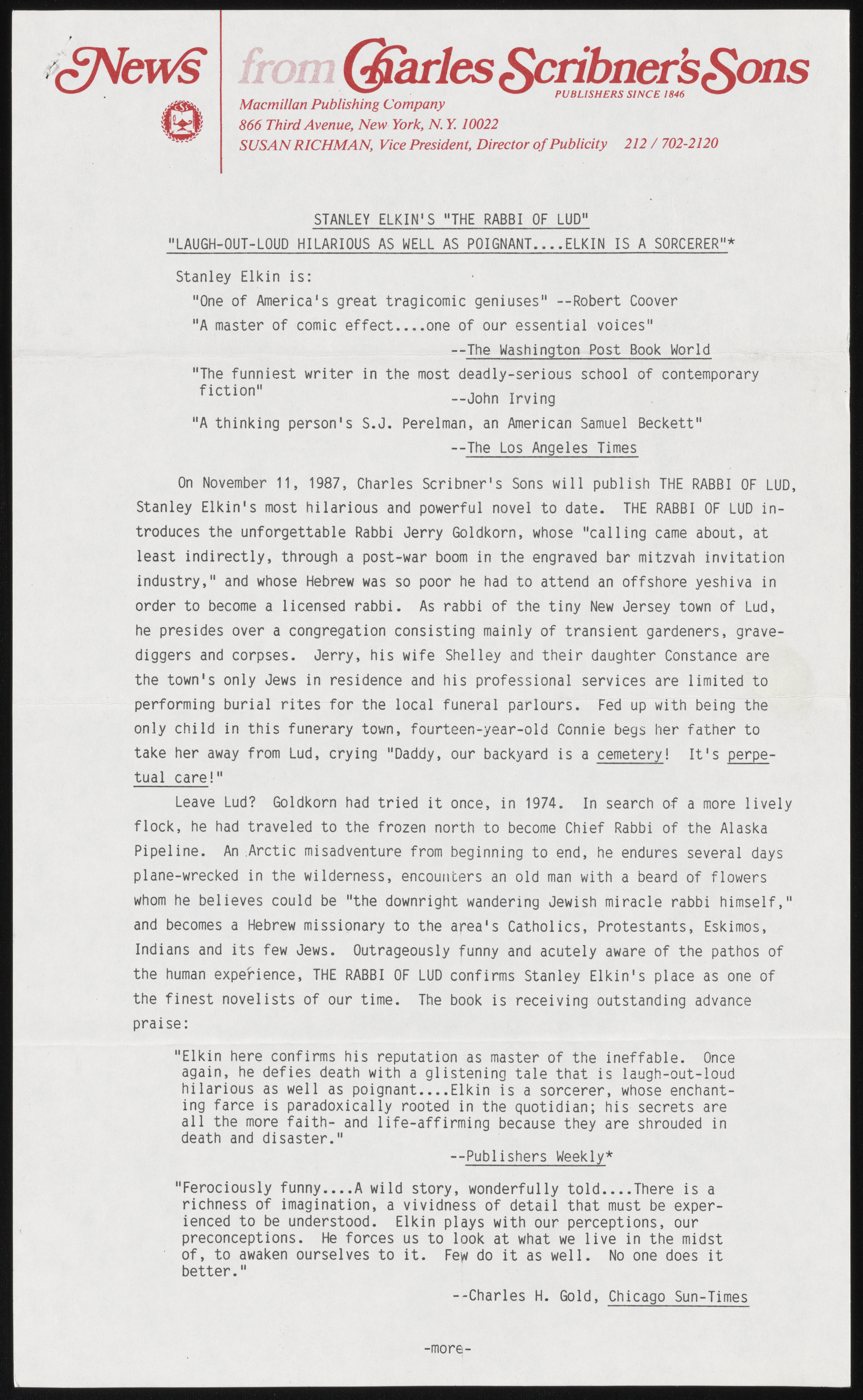 Charles Scribner’s Sons. Letter. 1987. “The Rabbi of Lud - Press Release”, 1987, Stanley and Joan Elkin’s Artistic Kingdom, accessed February 12, 2026, https://digitalexhibits.library.wustl.edu/s/elkin/item/58628