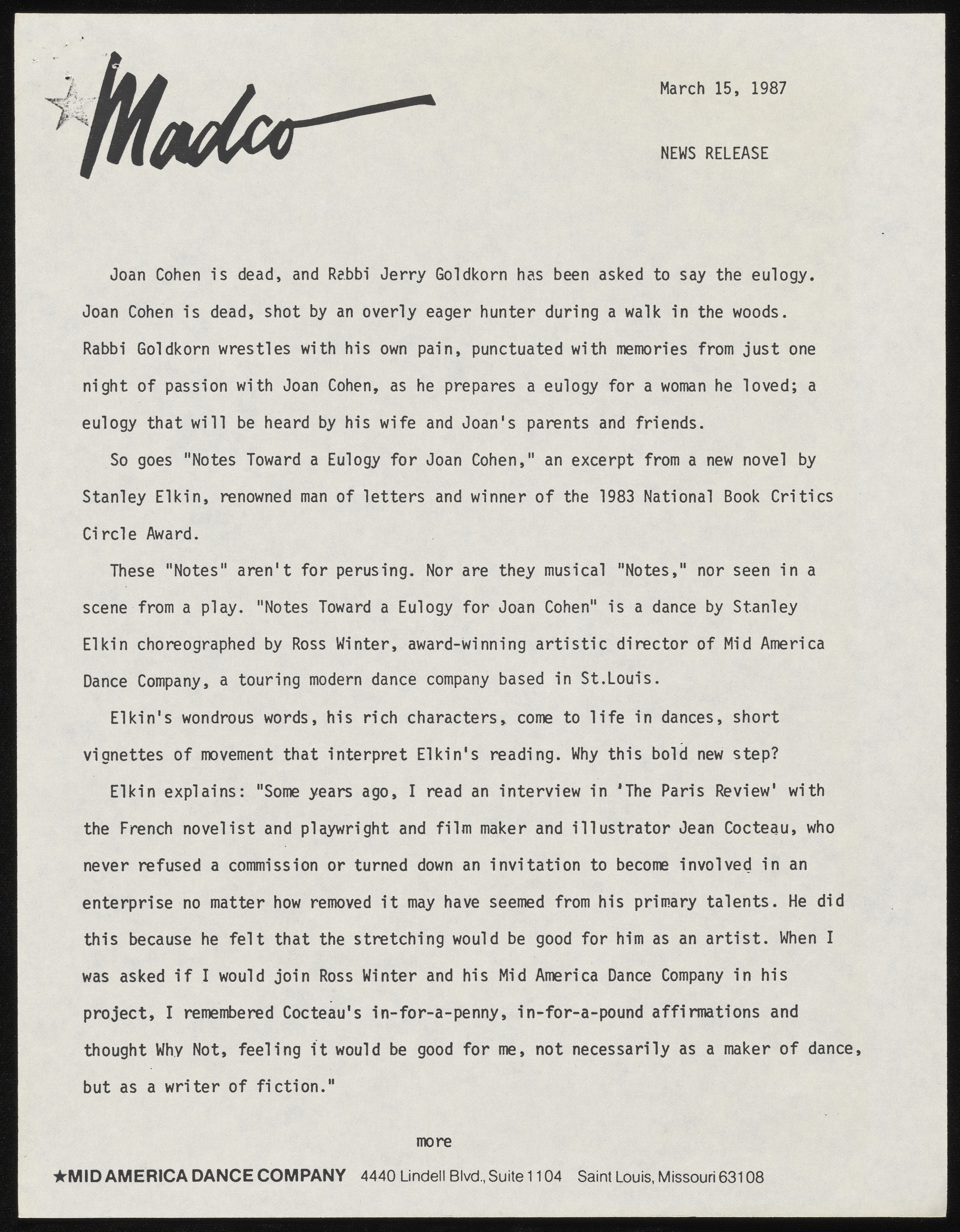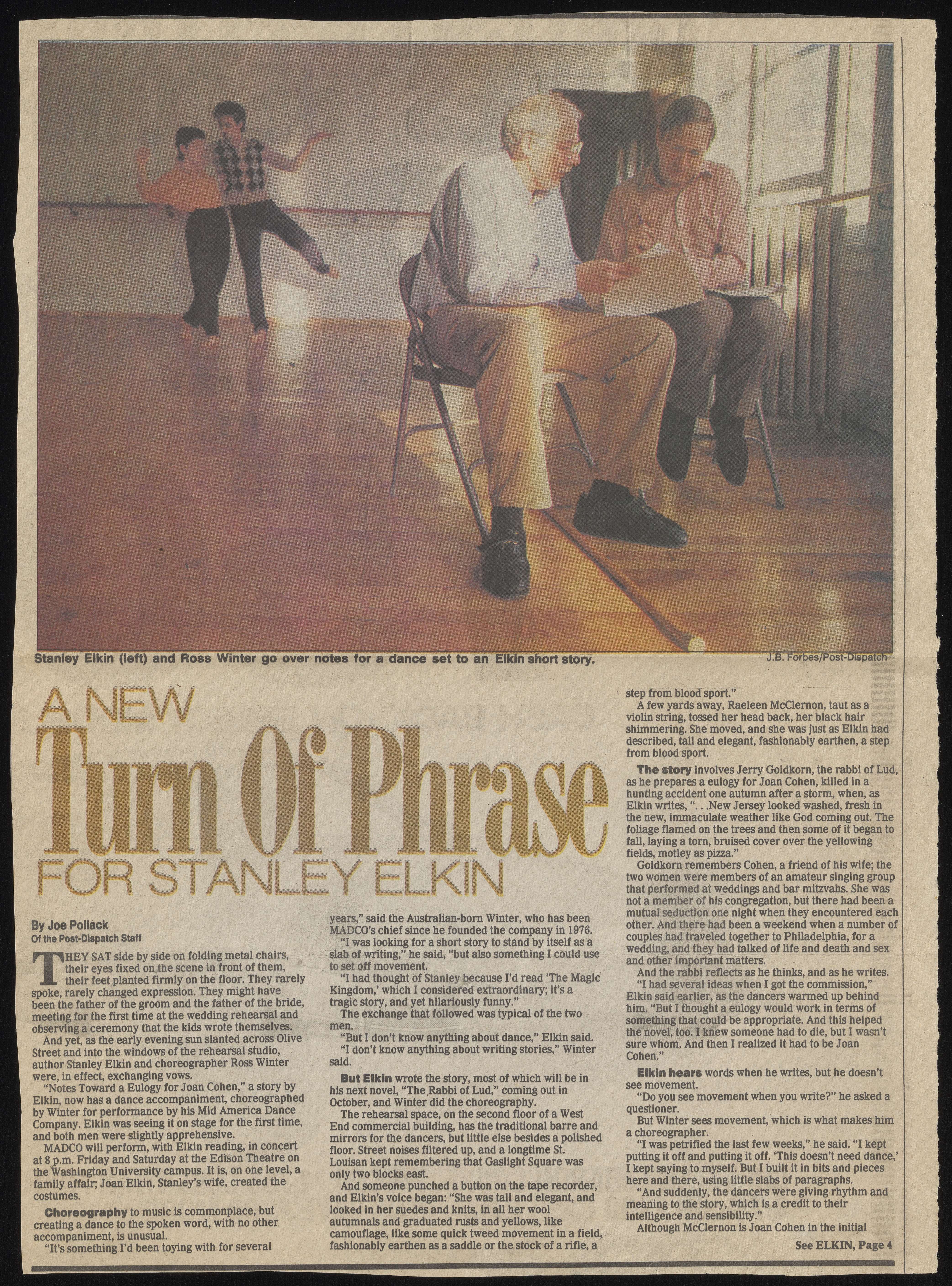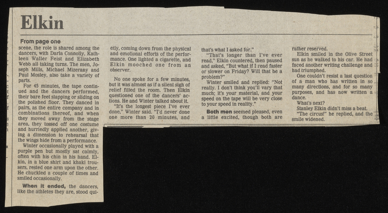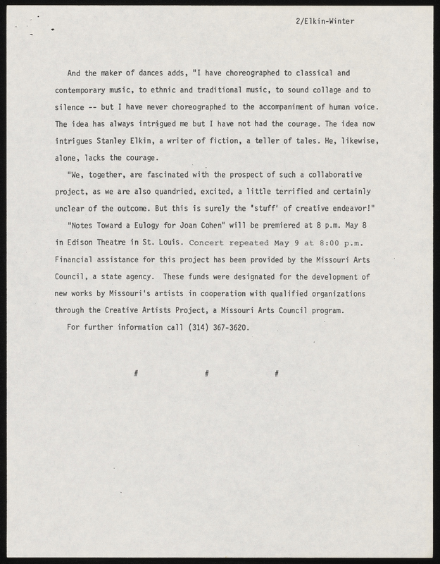 “Notes Toward an Elegy - Program, Press Release, and Review”, 1987-1988, Stanley and Joan Elkin’s Artistic Kingdom, accessed February 11, 2026, https://digitalexhibits.library.wustl.edu/s/elkin/item/58665