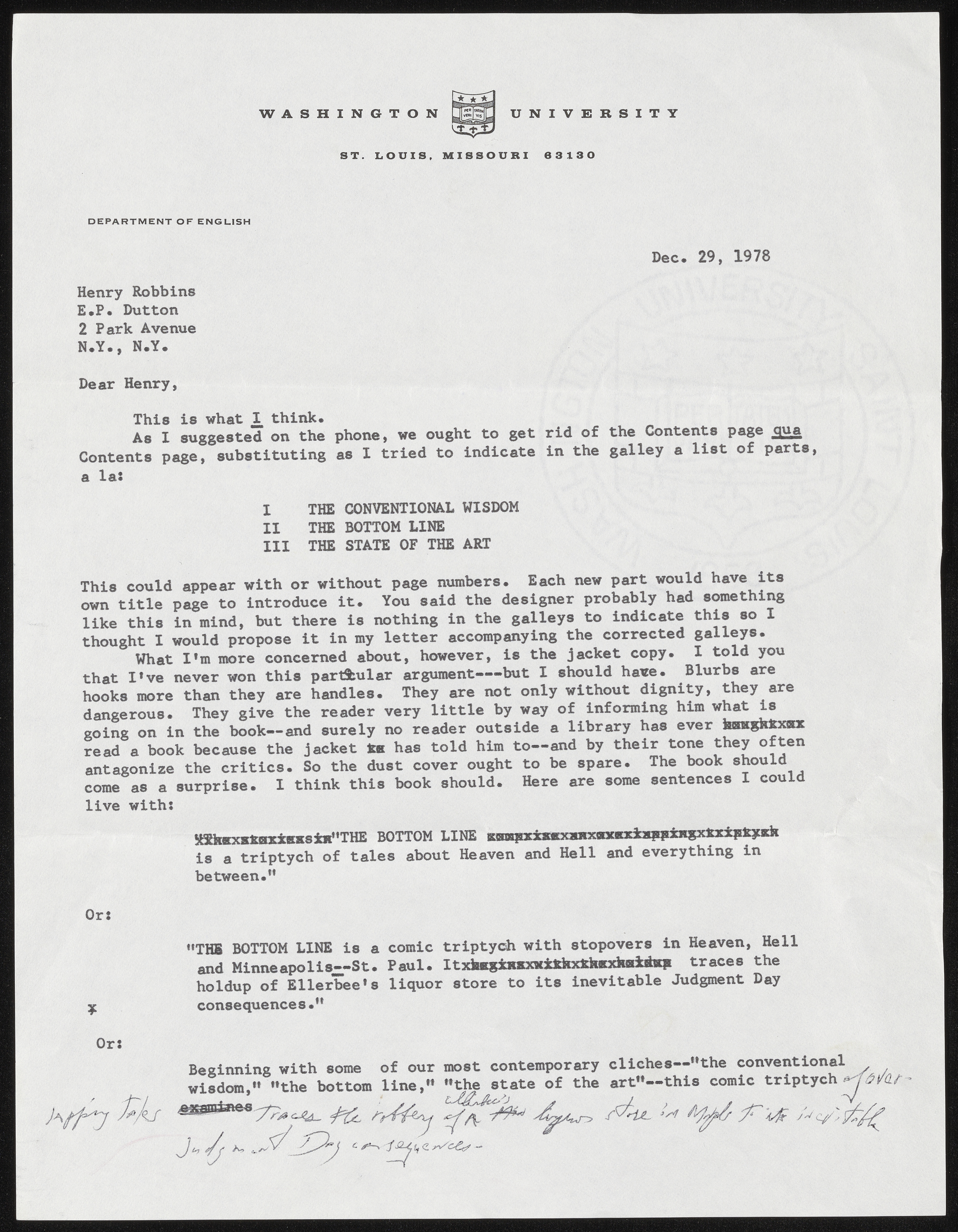 Elkin, Stanley. Letter. 1978. “Elkin to Robbins”. Stanley Elkin Papers, 1978, Stanley and Joan Elkin’s Artistic Kingdom, accessed February 10, 2026, https://digitalexhibits.library.wustl.edu/s/elkin/item/58816
