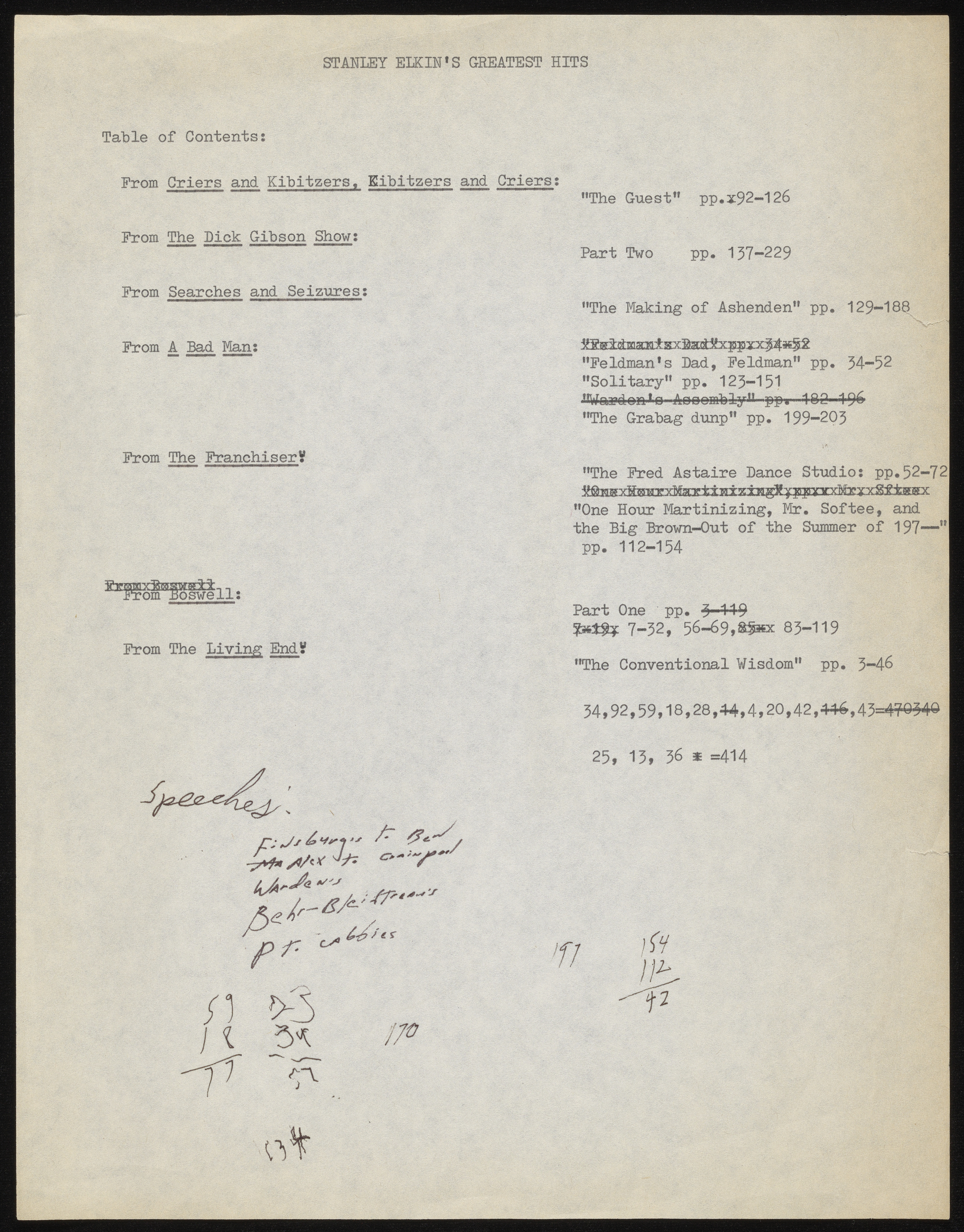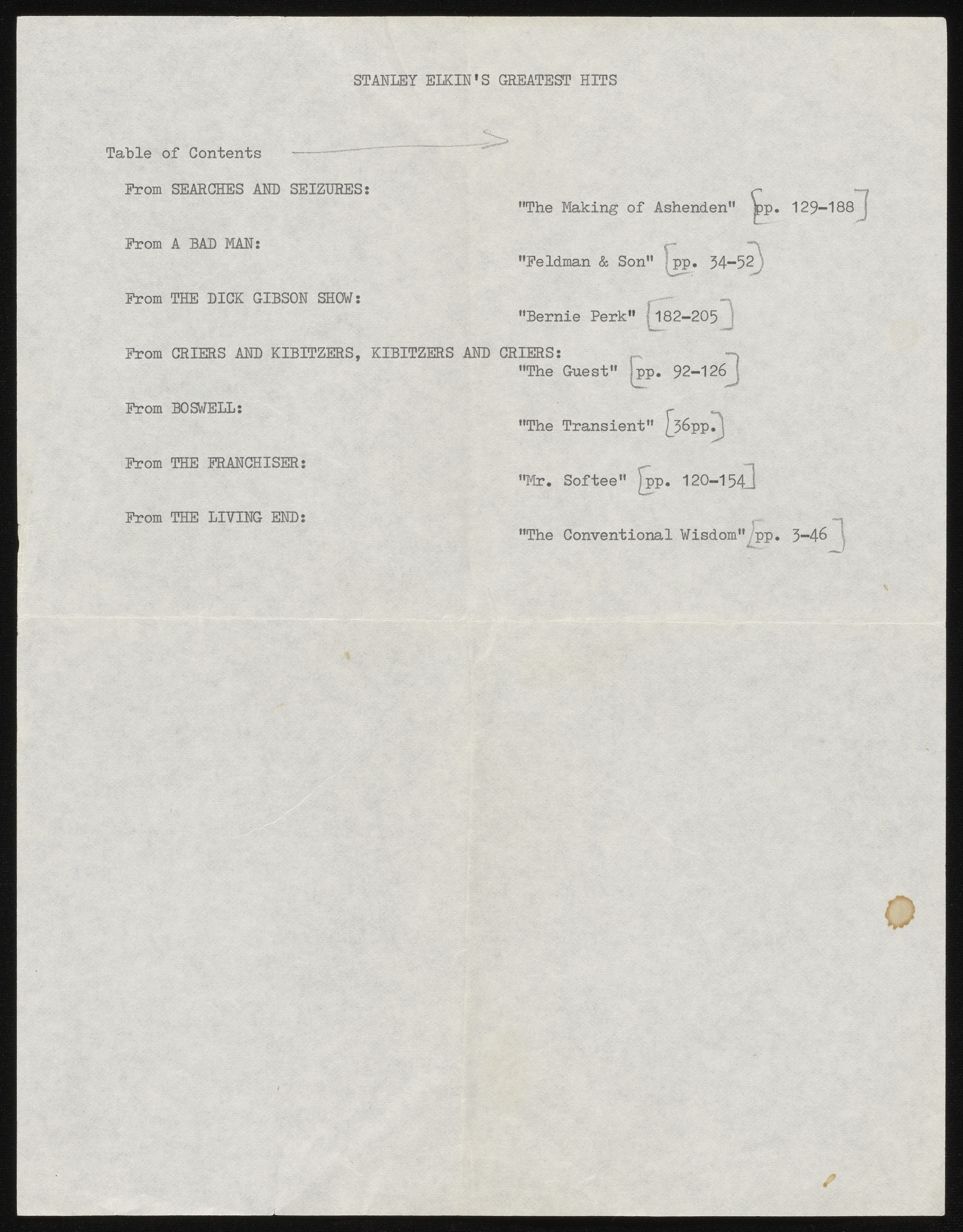 Elkin, Stanley. Letter. n.d. “Stanley Elkin’s Greatest Hits - Table of Contents.”, Stanley and Joan Elkin’s Artistic Kingdom, accessed February 10, 2026, https://digitalexhibits.library.wustl.edu/s/elkin/item/58890