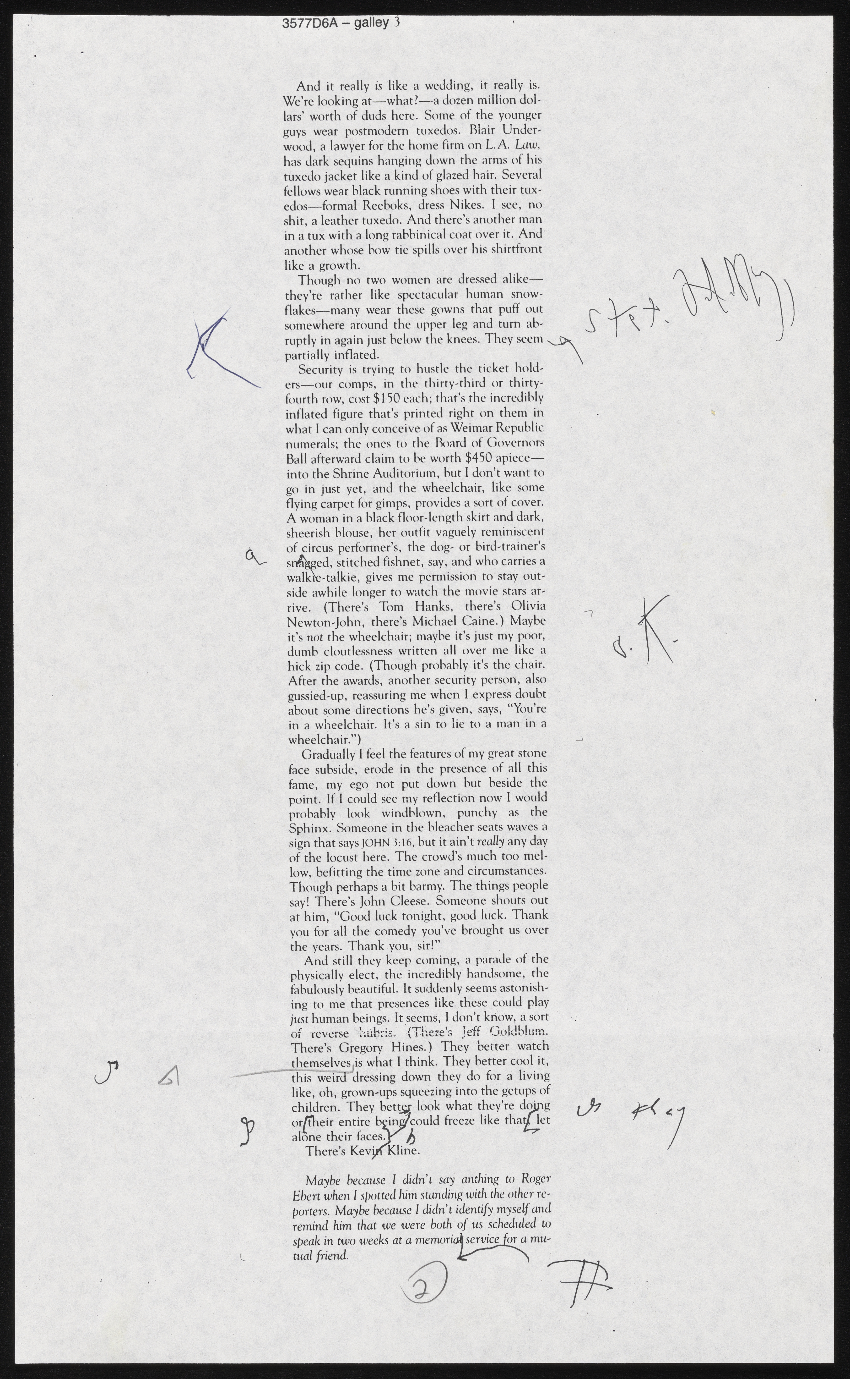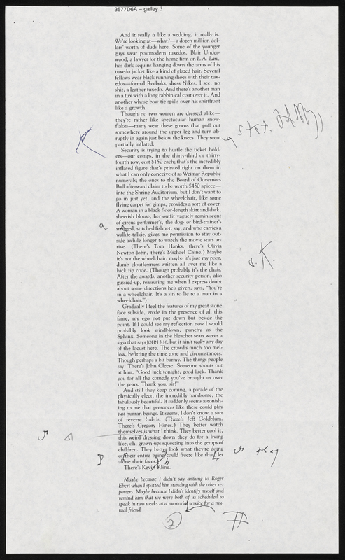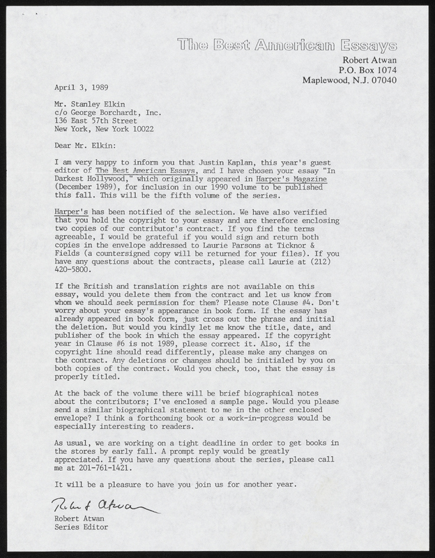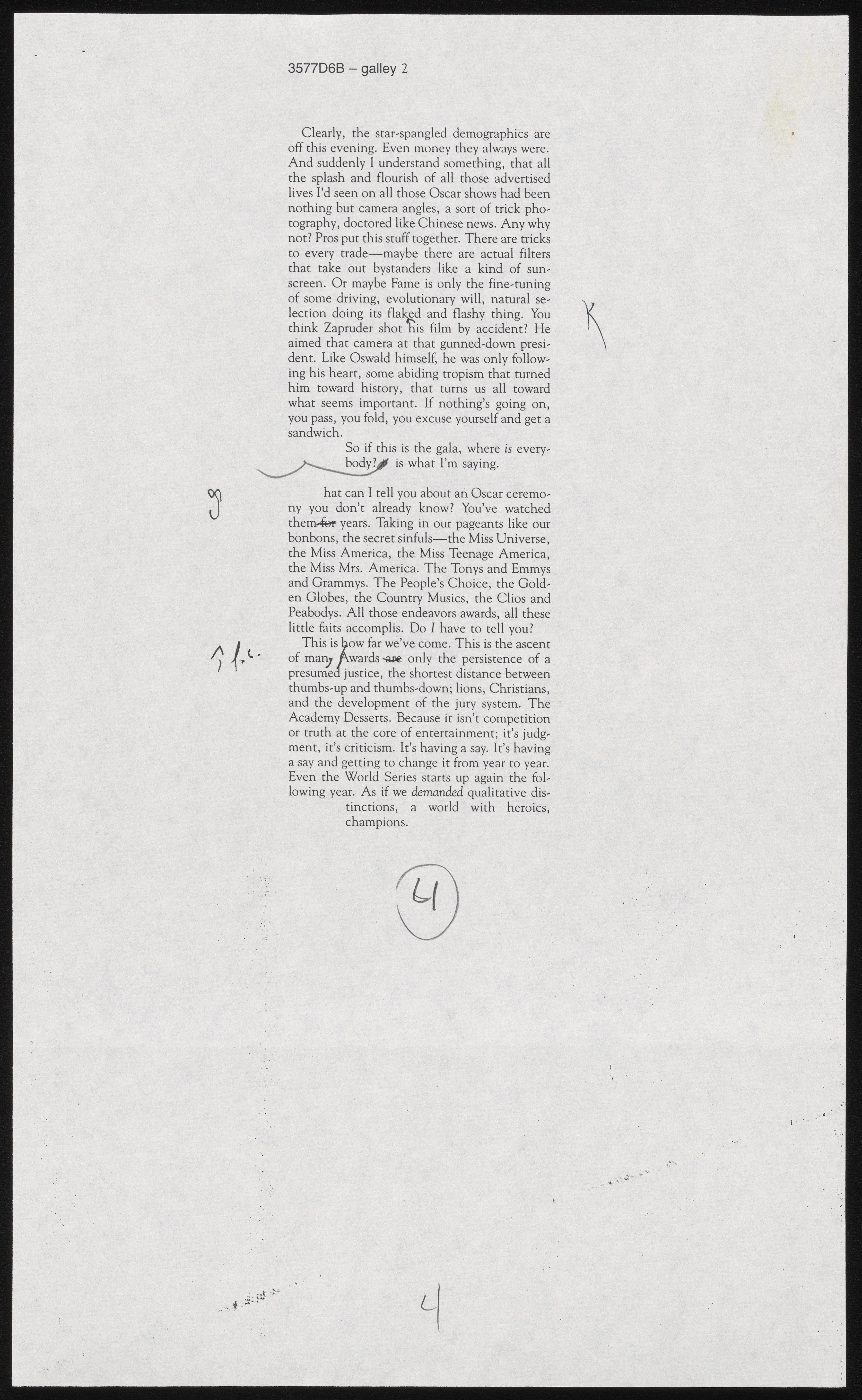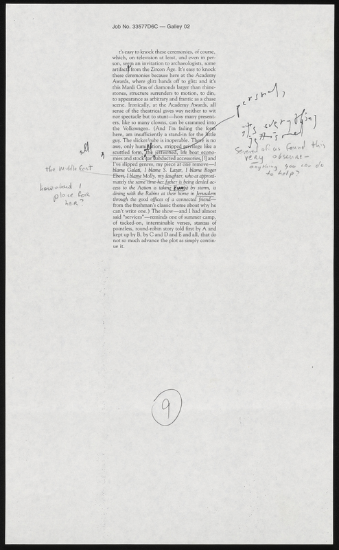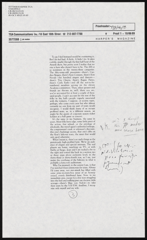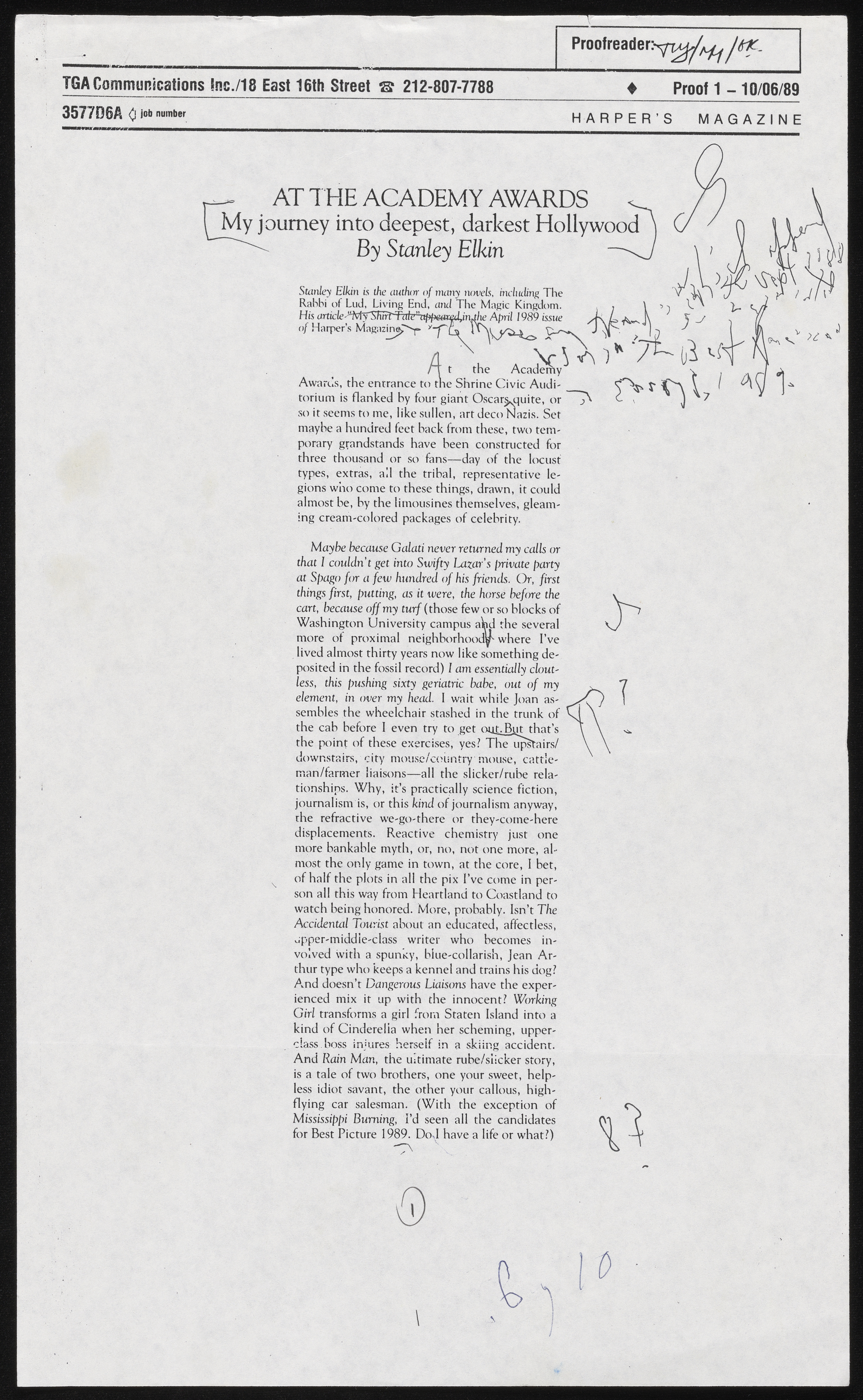 - Correspondence and galleys with minor revisions between Elkin and editors regarding "At the Academy Awards".