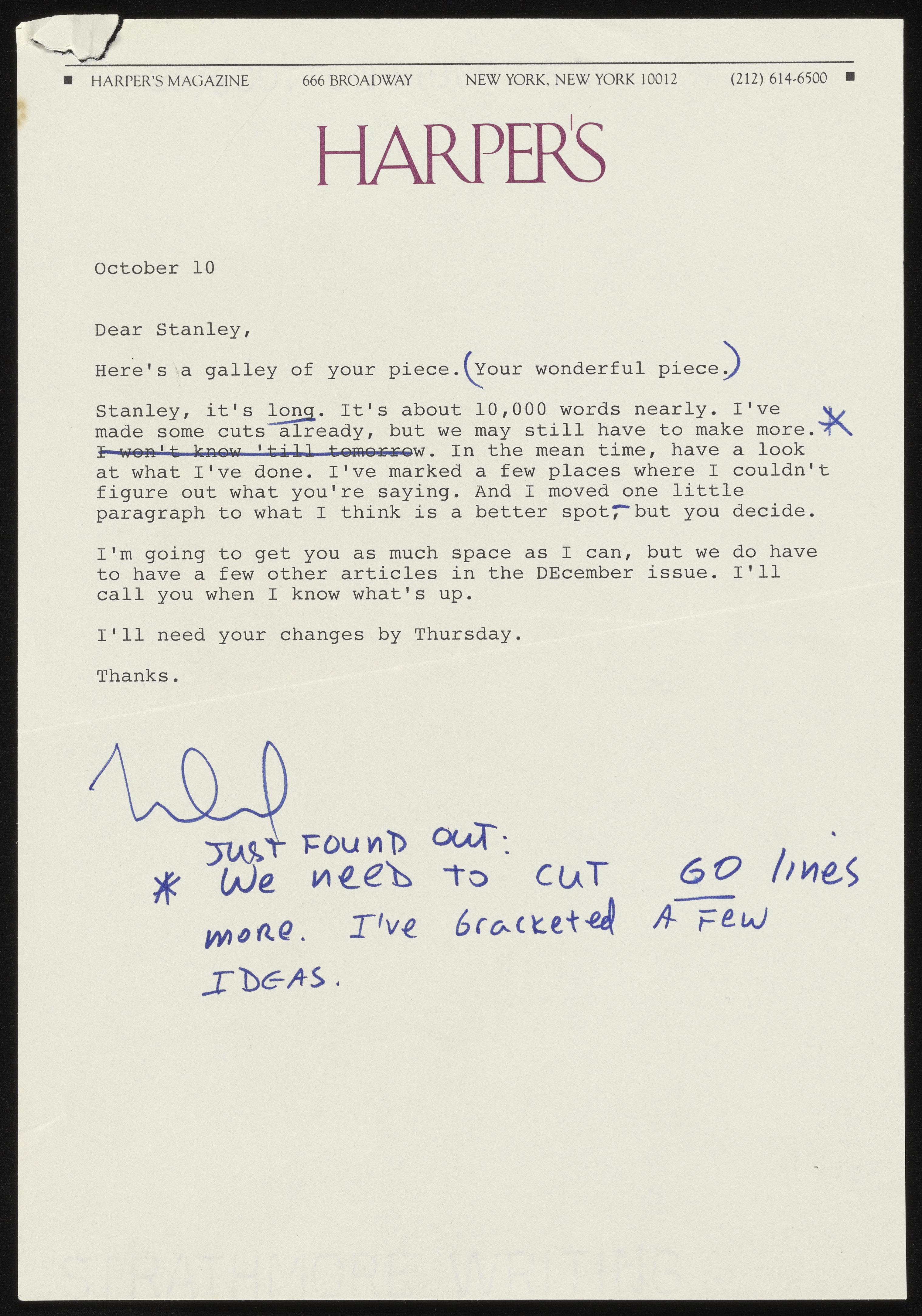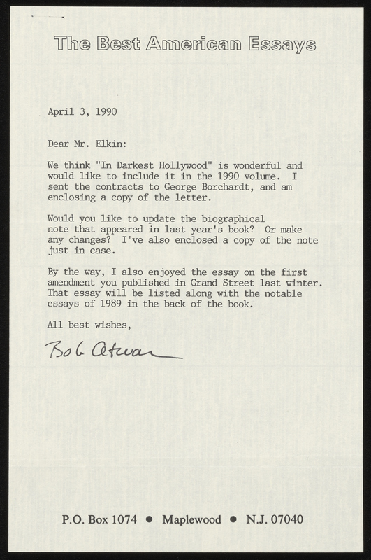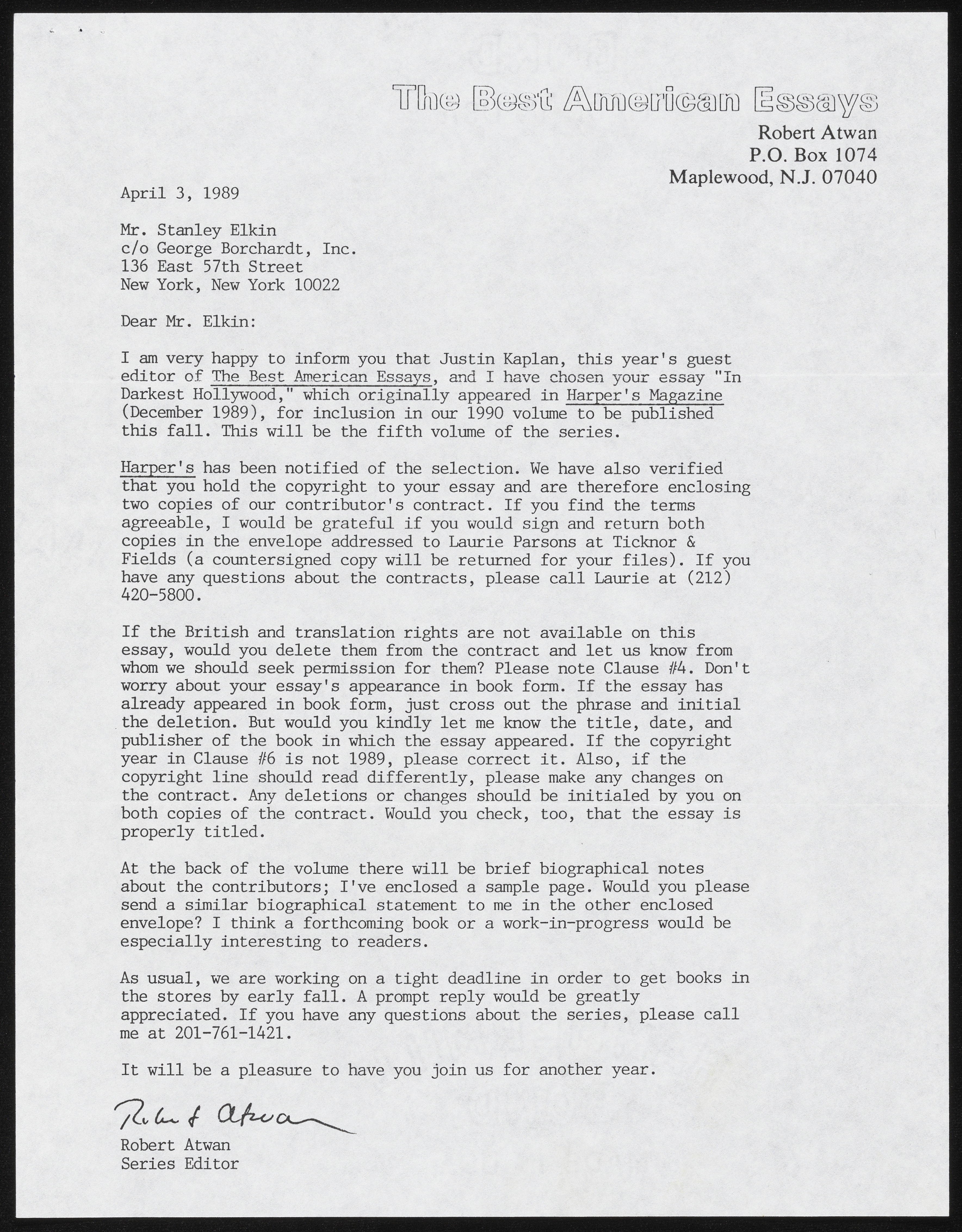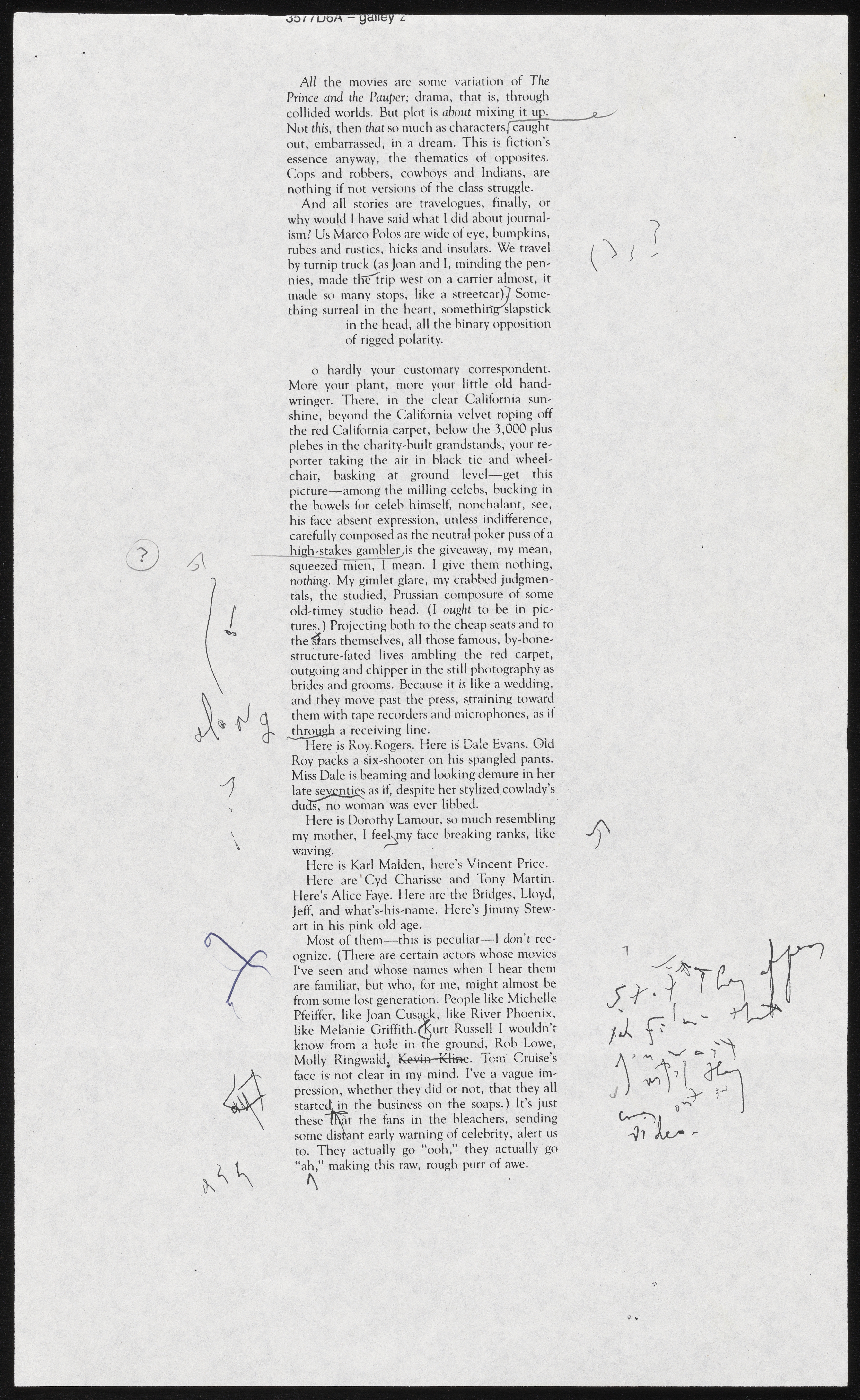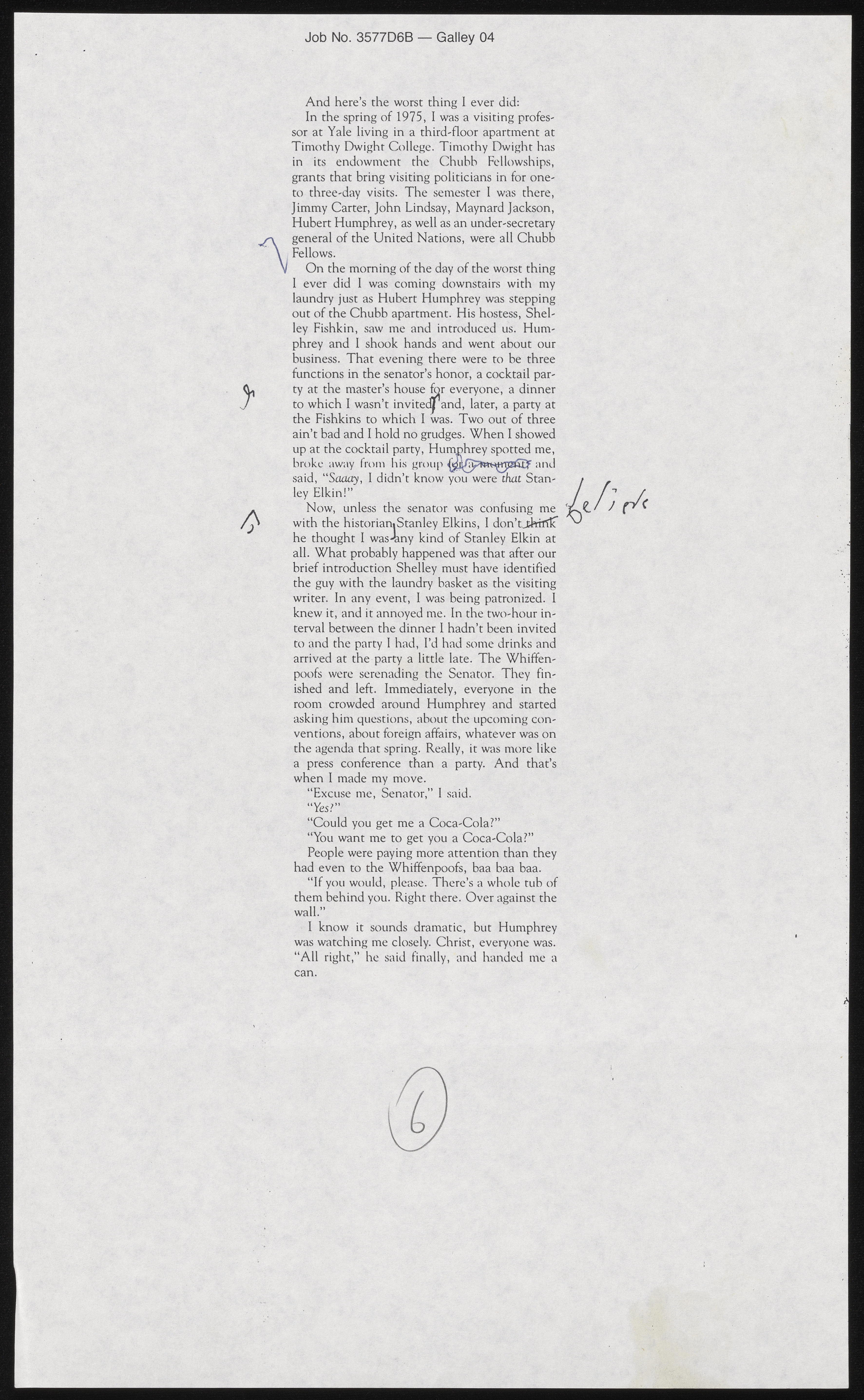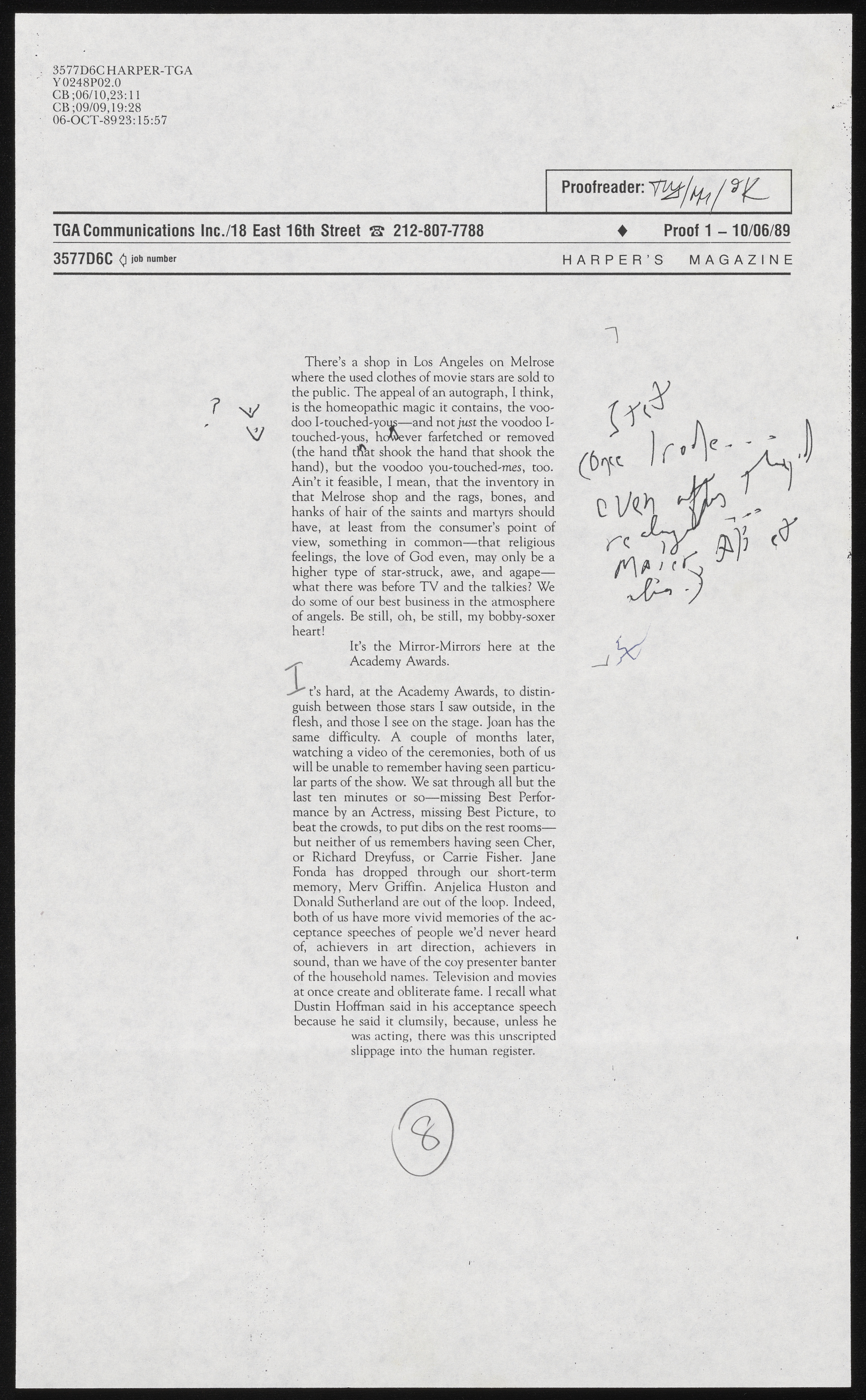 - Correspondence and galleys with minor revisions between Elkin and editors regarding "At the Academy Awards".