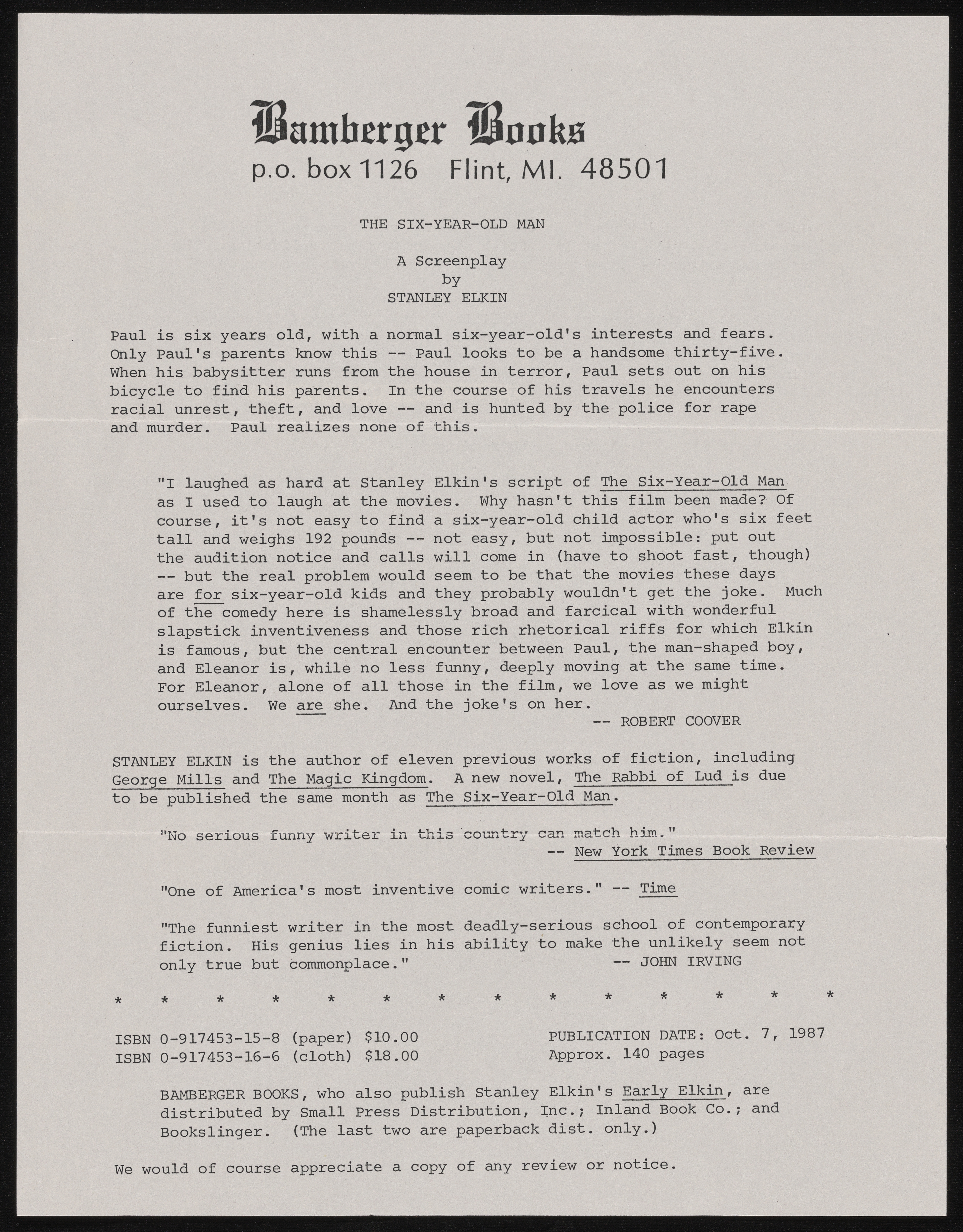 Bamberger Books. Letter. 1986. “The Six Year Old Man - Press Release”, 1986, Stanley and Joan Elkin’s Artistic Kingdom, accessed February 11, 2026, https://digitalexhibits.library.wustl.edu/s/elkin/item/59026