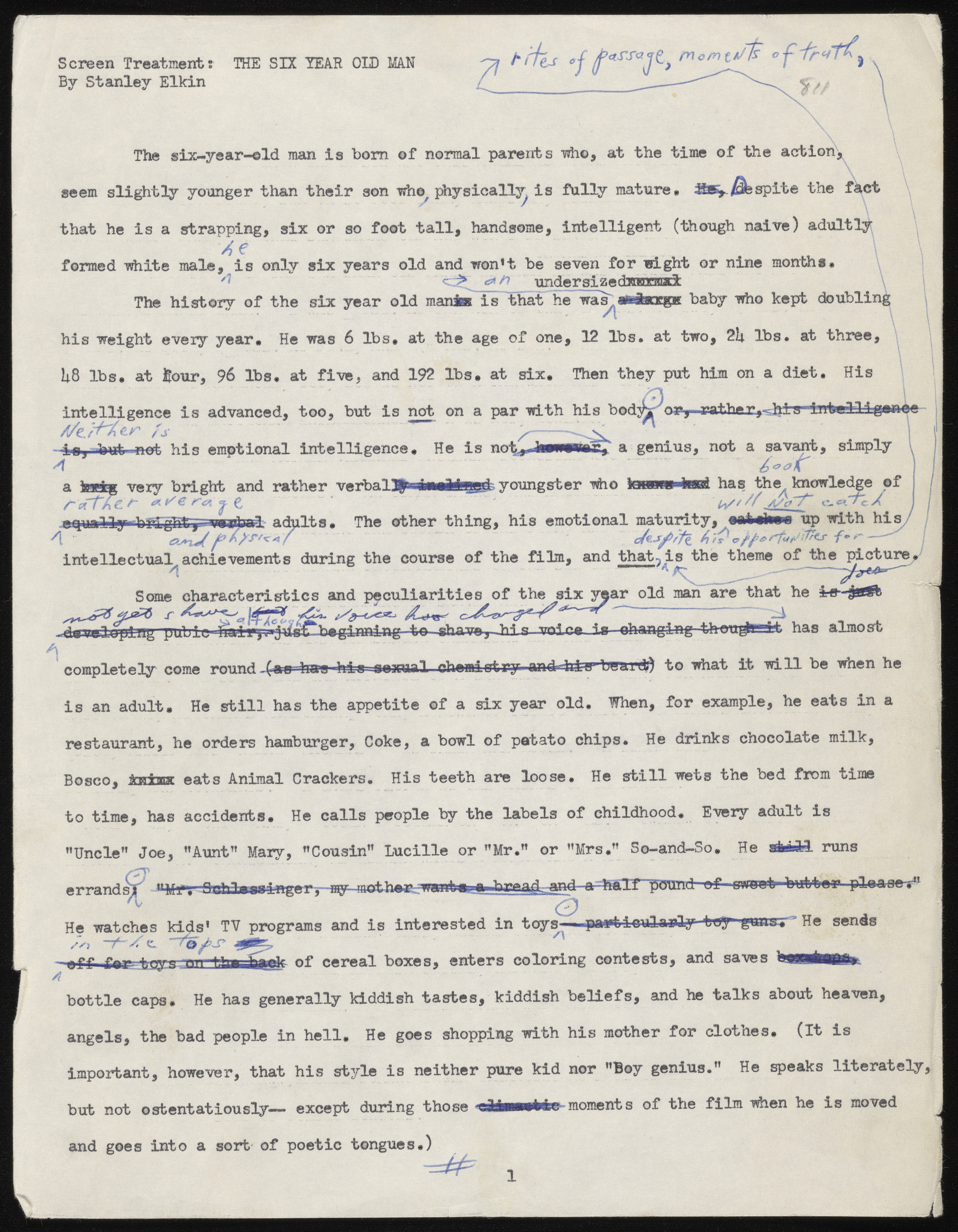 Elkin, Stanley. Letter. n.d. “The Six Year Old Man - Typescript Early Draft (77 Pages).”, Stanley and Joan Elkin’s Artistic Kingdom, accessed February 11, 2026, https://digitalexhibits.library.wustl.edu/s/elkin/item/59039
