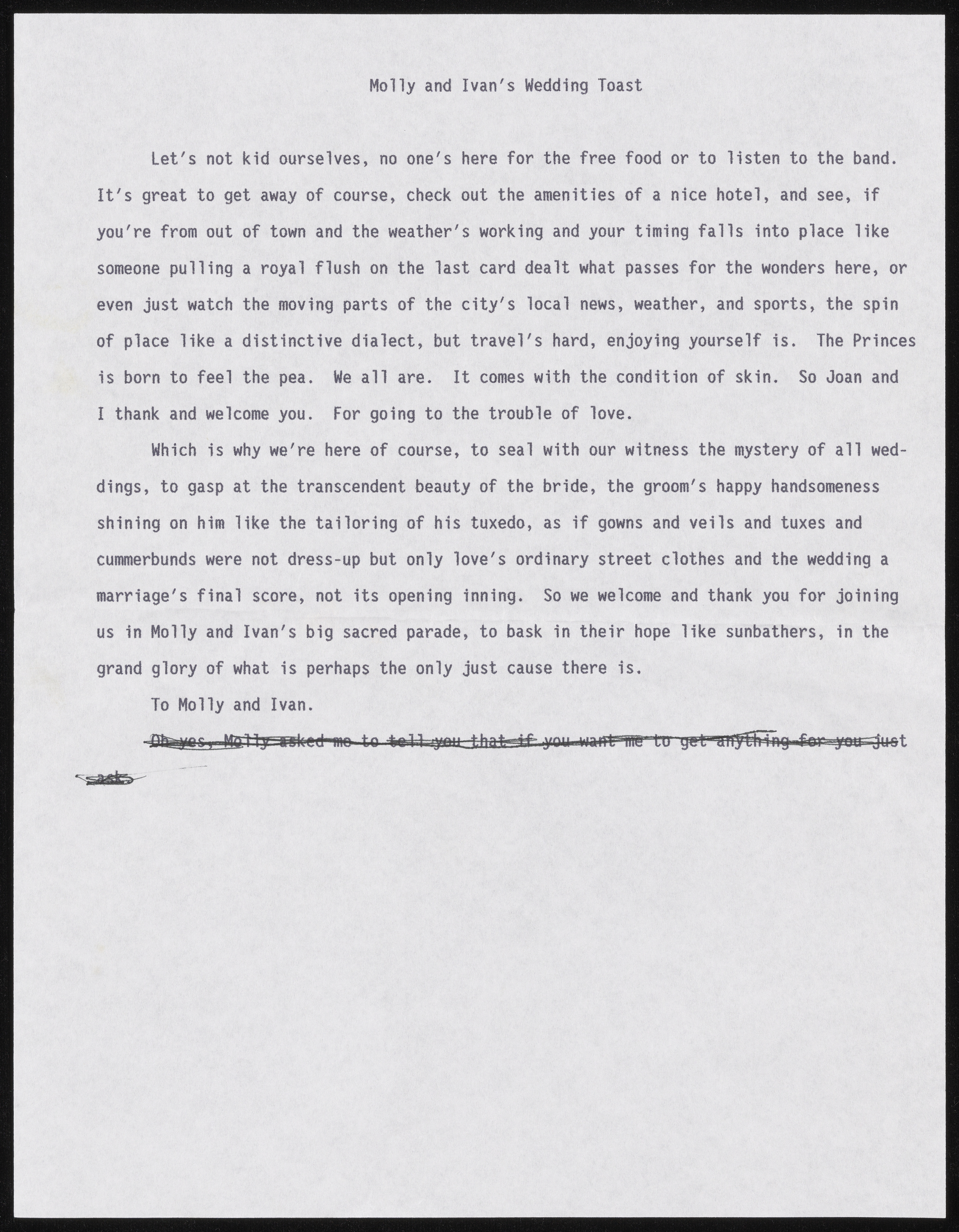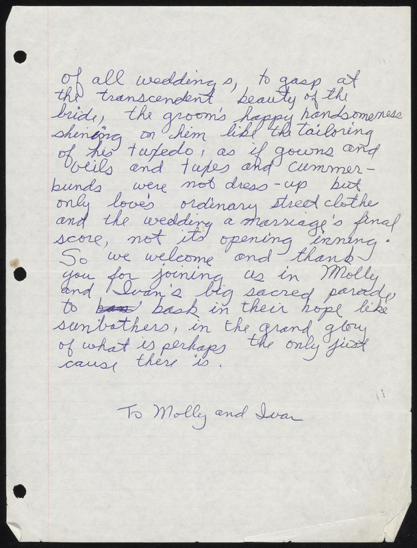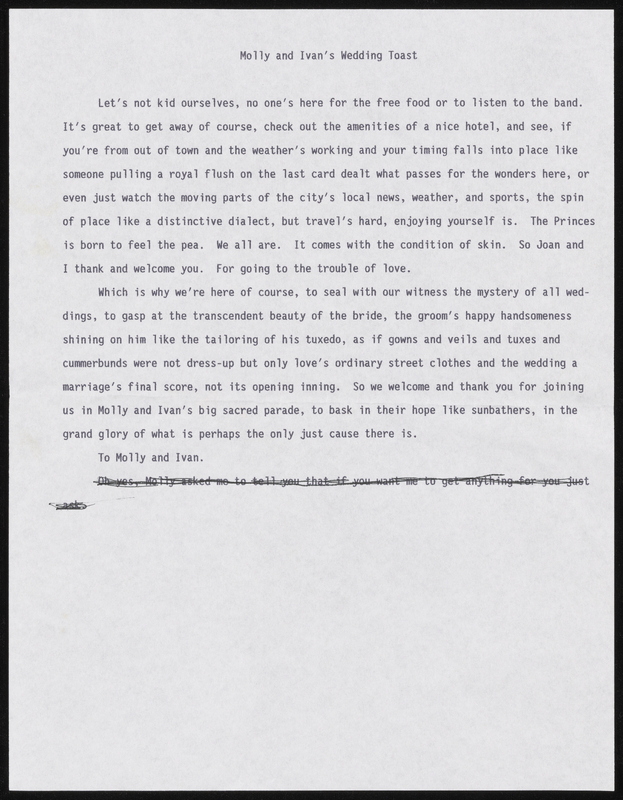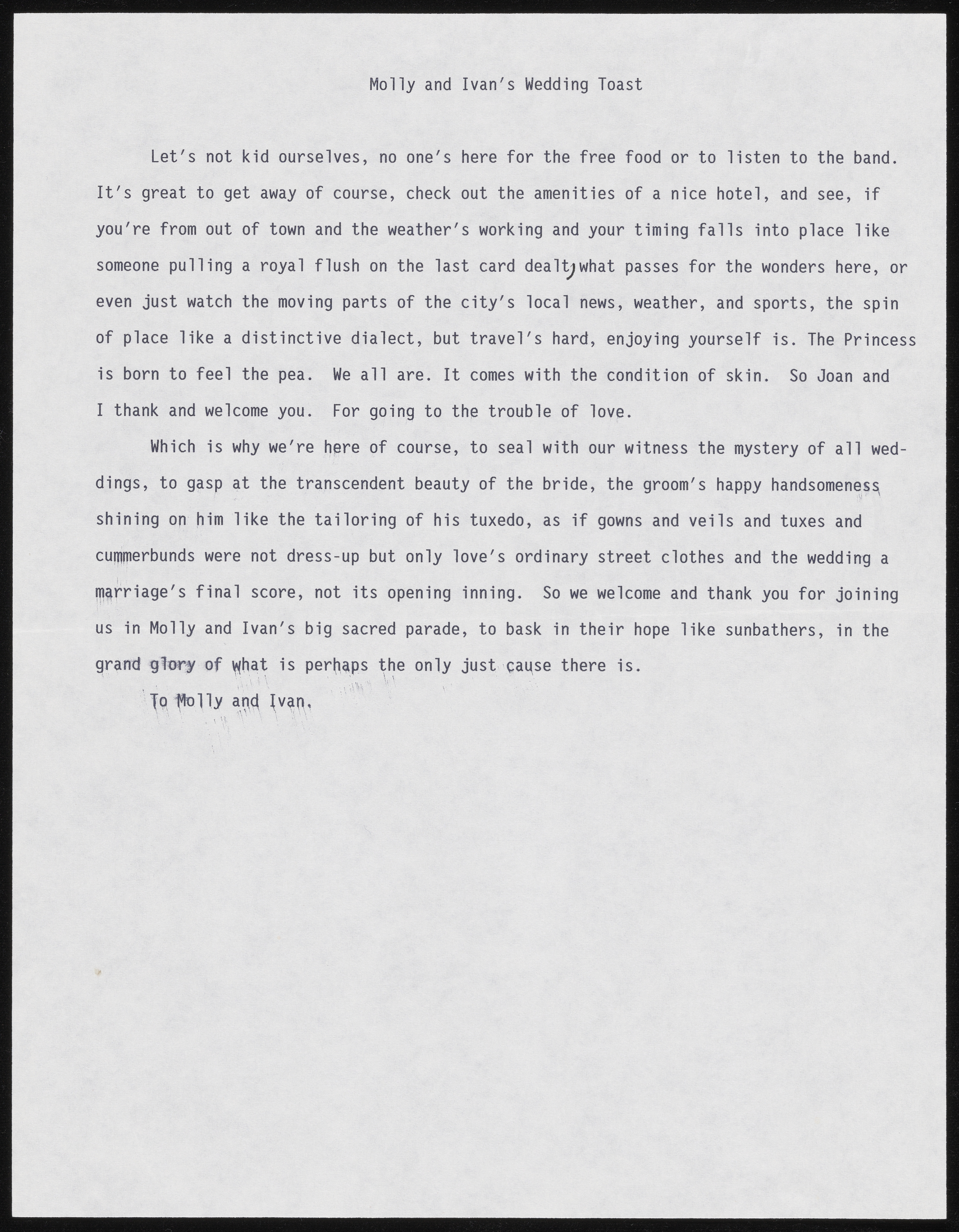 Elkin, Stanley. Letter. 1993. “Toast for Molly Elkin and Ivan Wasserman’s Wedding”, 1993, Stanley and Joan Elkin’s Artistic Kingdom, accessed February 11, 2026, https://digitalexhibits.library.wustl.edu/s/elkin/item/59197