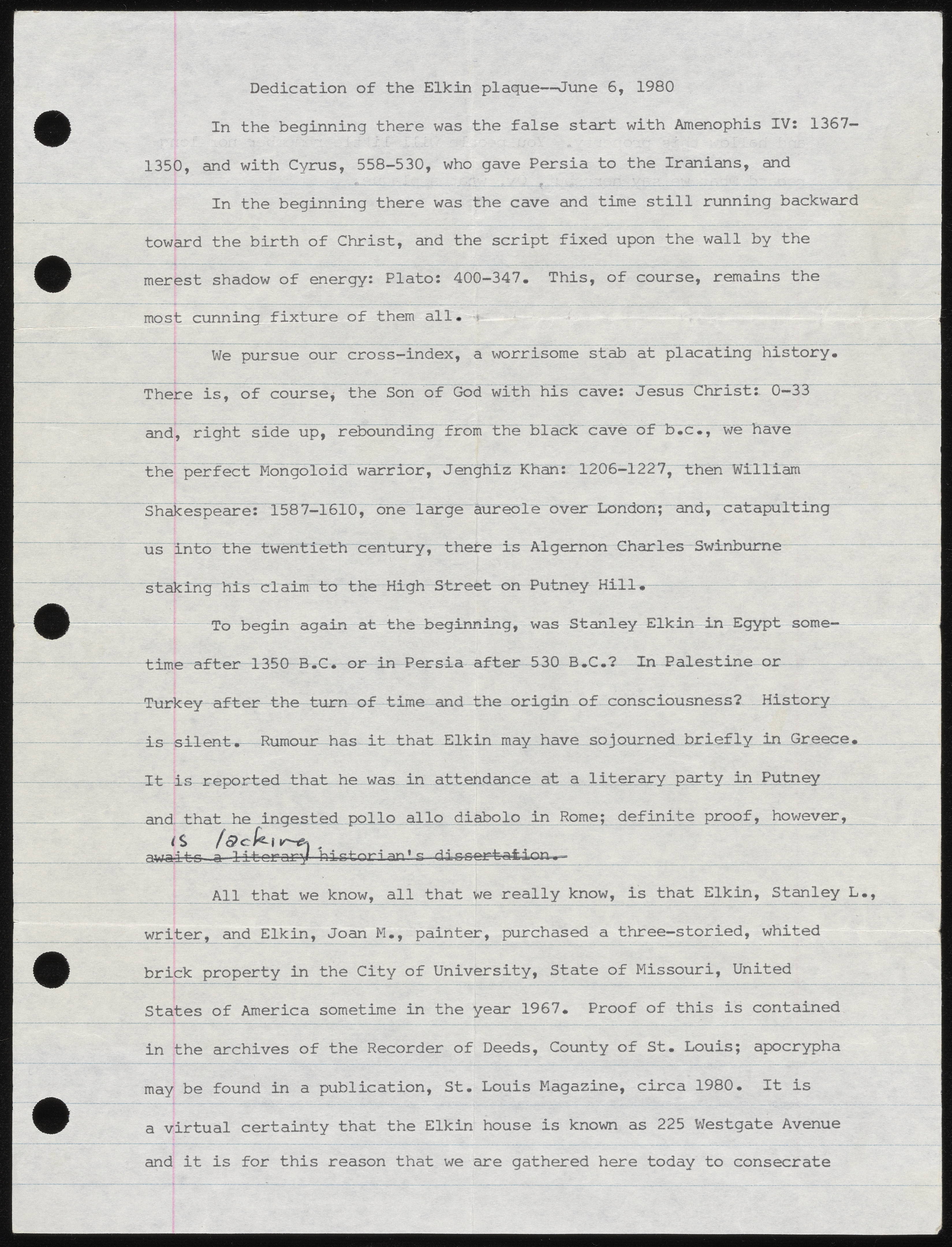 “Dedication of the Elkin Plaque”. Letter. 1980, 1980, Stanley and Joan Elkin’s Artistic Kingdom, accessed February 11, 2026, https://digitalexhibits.library.wustl.edu/s/elkin/item/59205