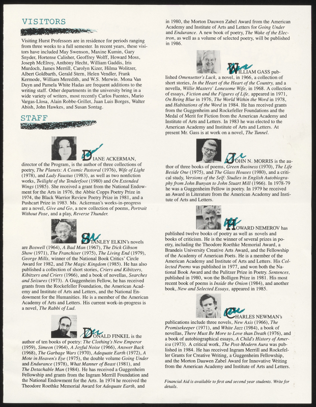 “WashU MFA in Creative Writing Mailer”. Letter. 1986, 1986, Stanley and Joan Elkin’s Artistic Kingdom, accessed February 11, 2026, https://digitalexhibits.library.wustl.edu/s/elkin/item/59237