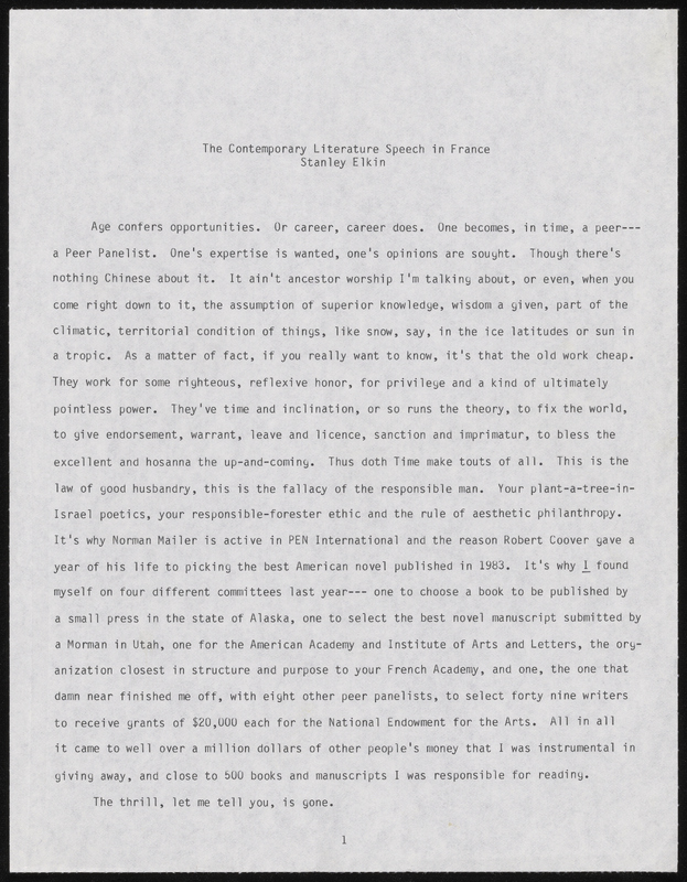 Elkin, Stanley. Letter. 1985. “The Contemporary Literature Speech in France”, 1985, Stanley and Joan Elkin’s Artistic Kingdom, accessed February 11, 2026, https://digitalexhibits.library.wustl.edu/s/elkin/item/59285