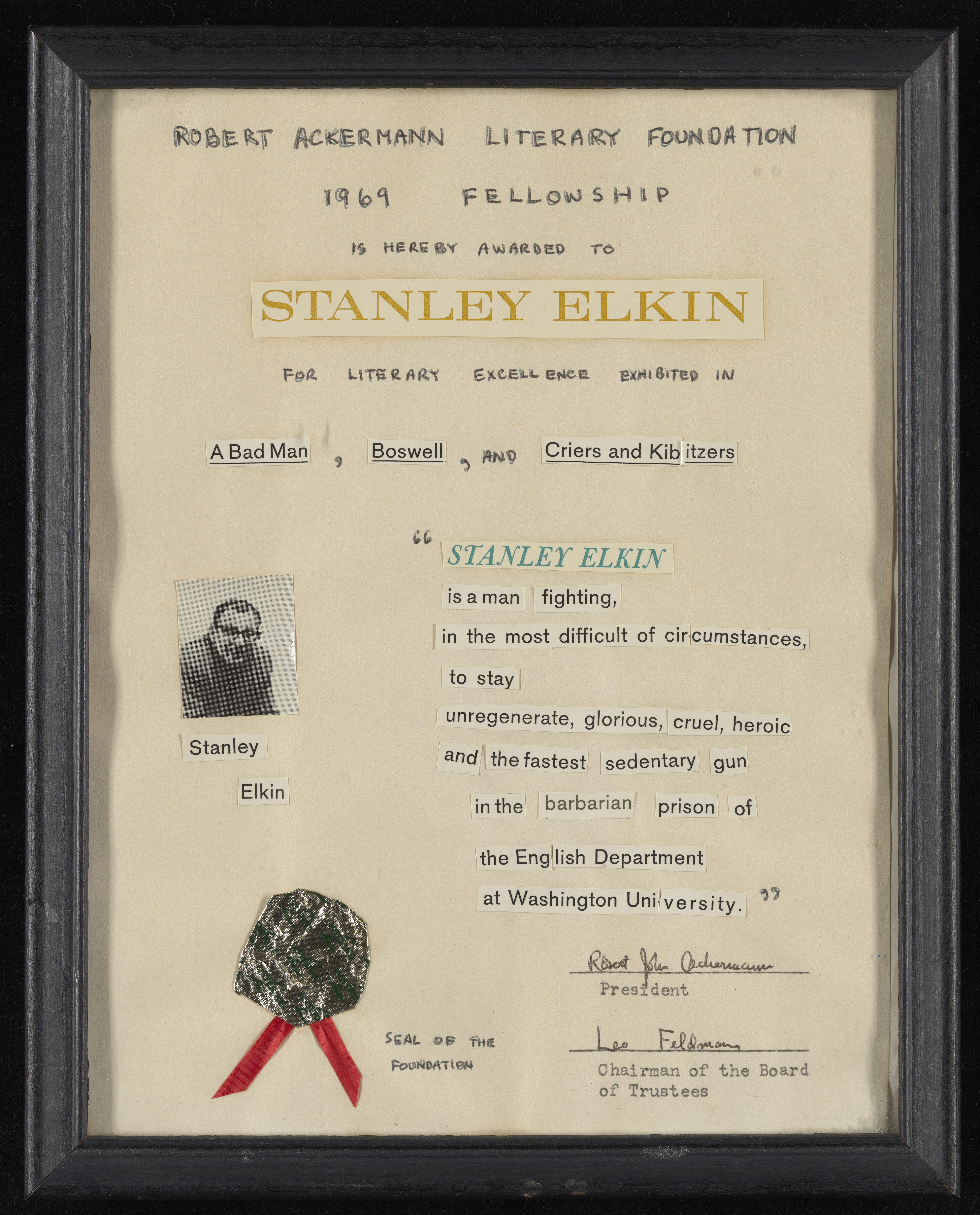 Robert Ackerman Literary Foundation. 1968. “Robert Ackerman Literary Foundation 1969 Fellowship.”, Stanley and Joan Elkin’s Artistic Kingdom, accessed February 11, 2026, https://digitalexhibits.library.wustl.edu/s/elkin/item/59350