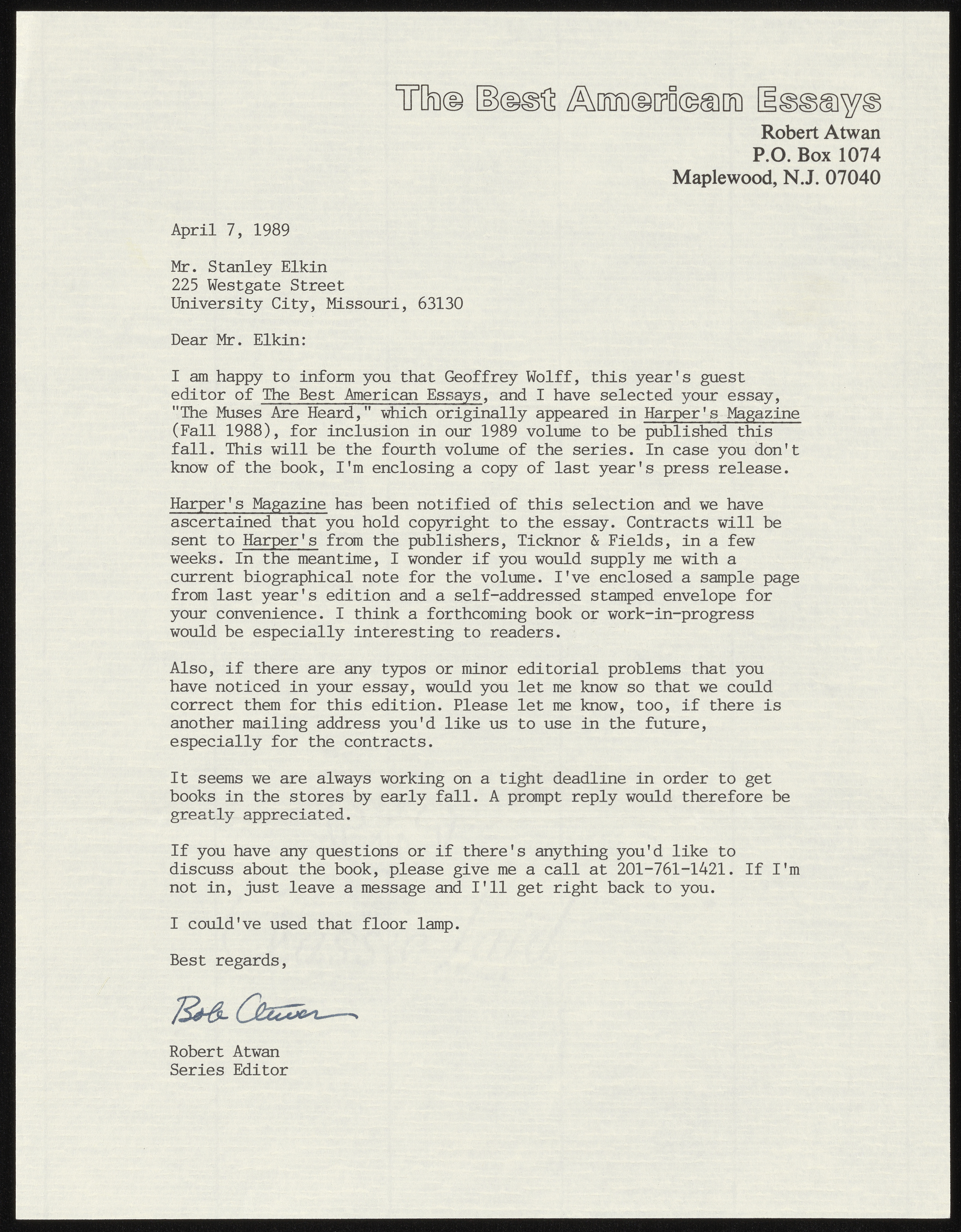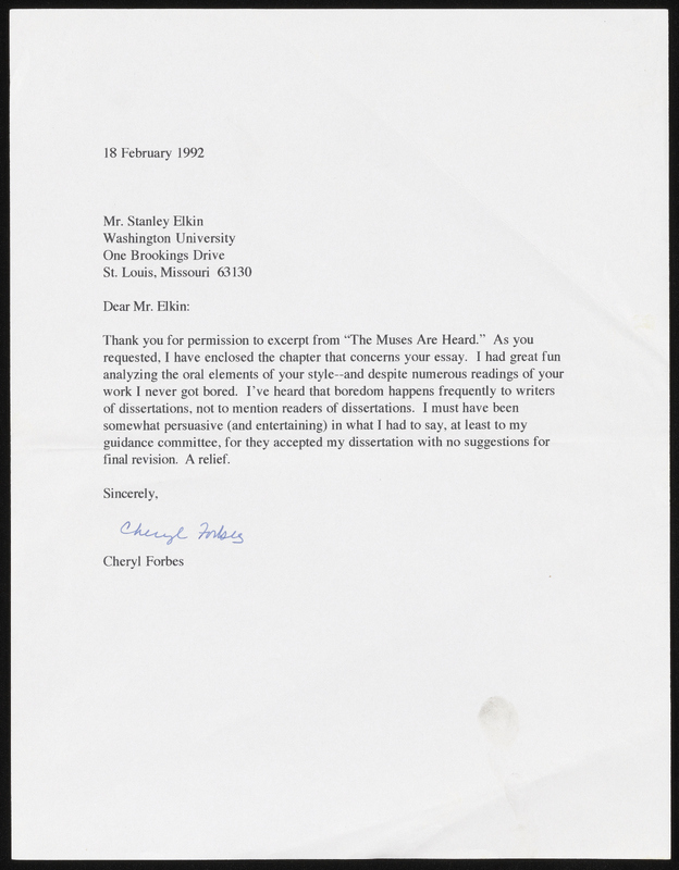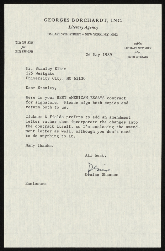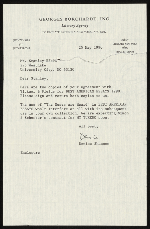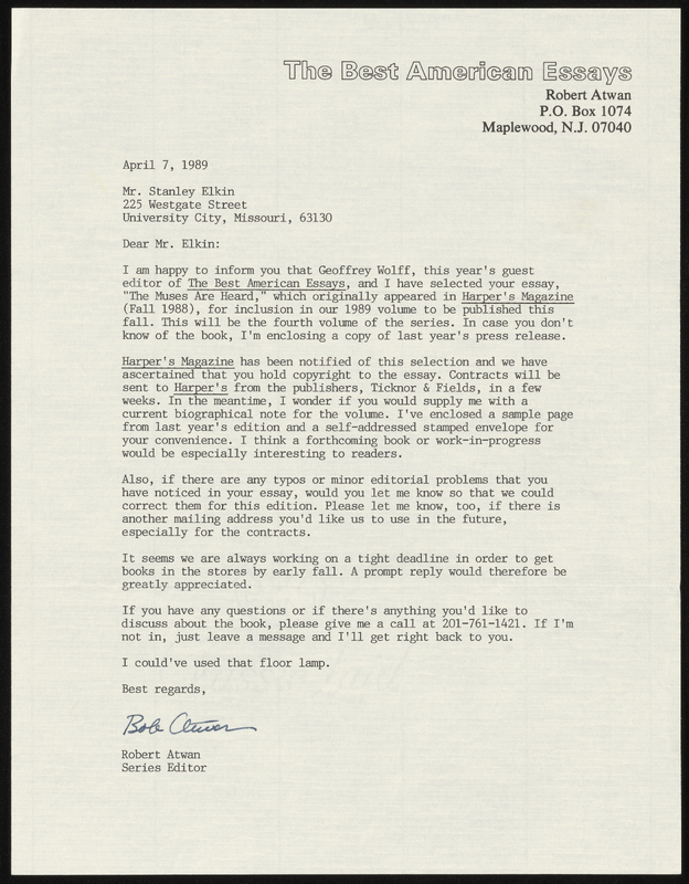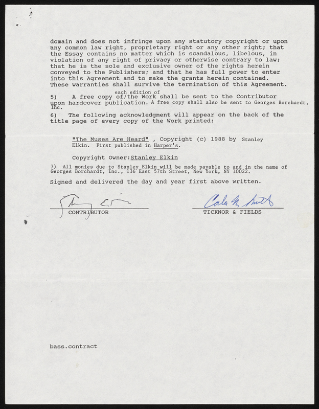 Atwan, Robert et al., “The Muses Are Heard - Contracts and Correspondence”, 1989-1992, Stanley and Joan Elkin’s Artistic Kingdom, accessed March 12, 2026, https://digitalexhibits.library.wustl.edu/s/elkin/item/59442