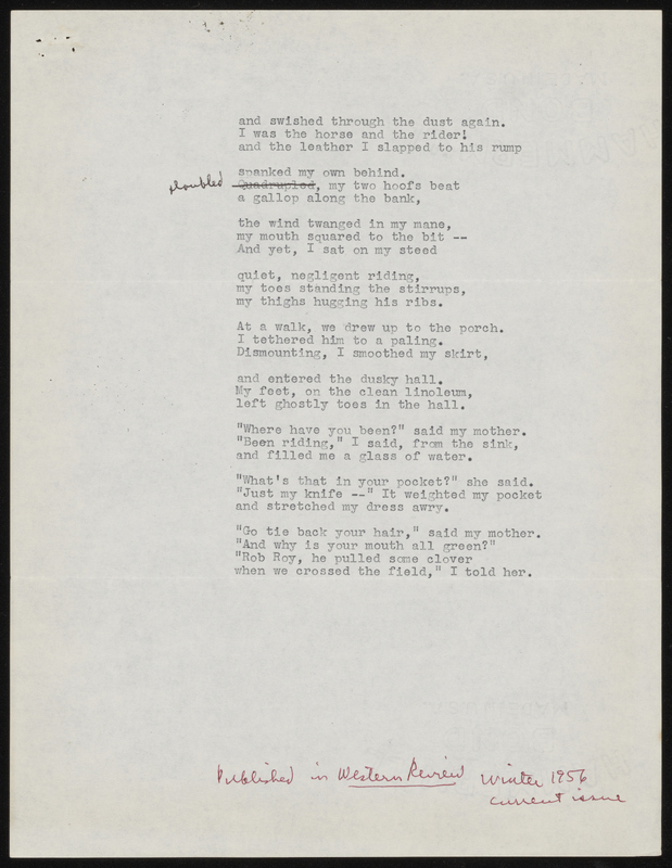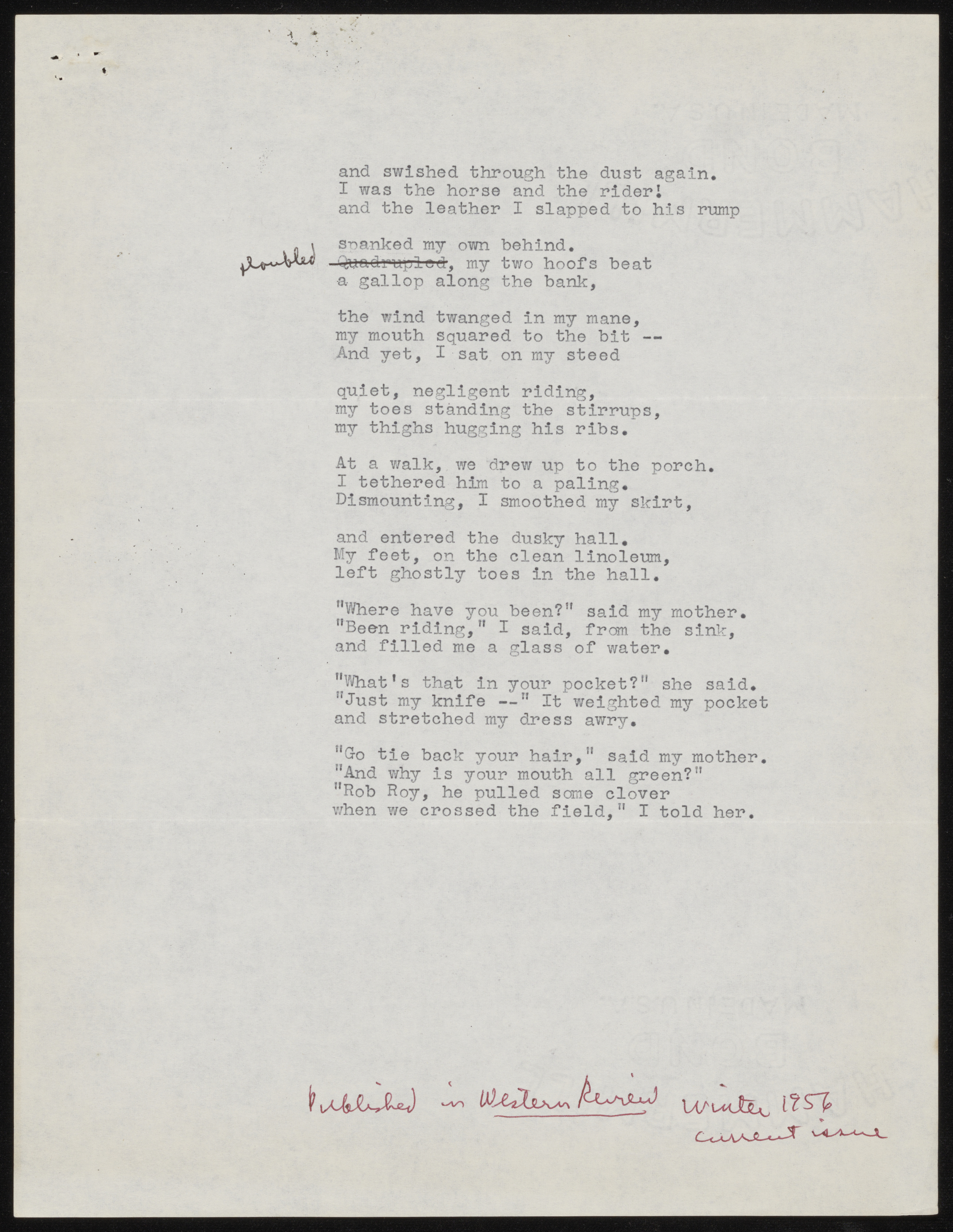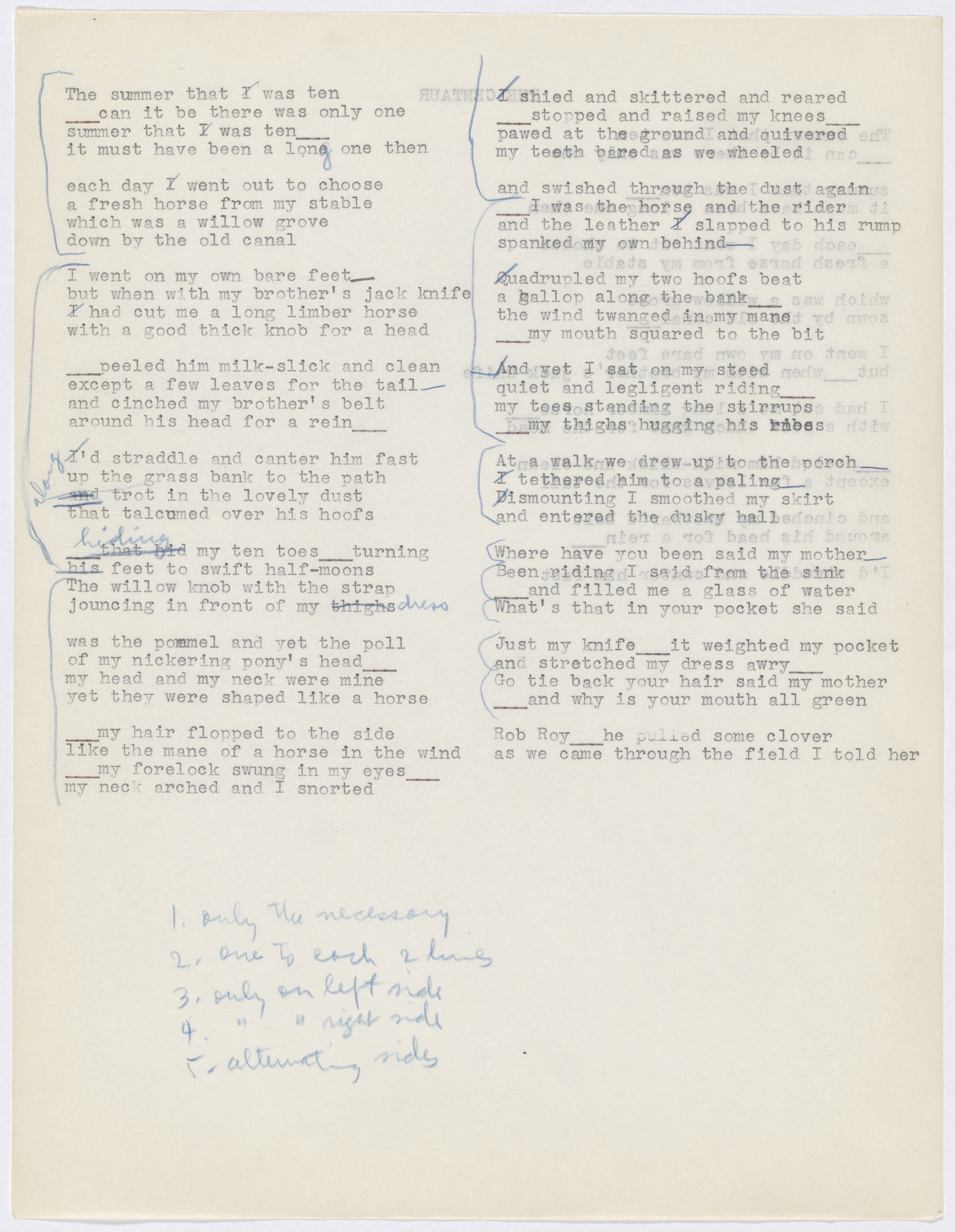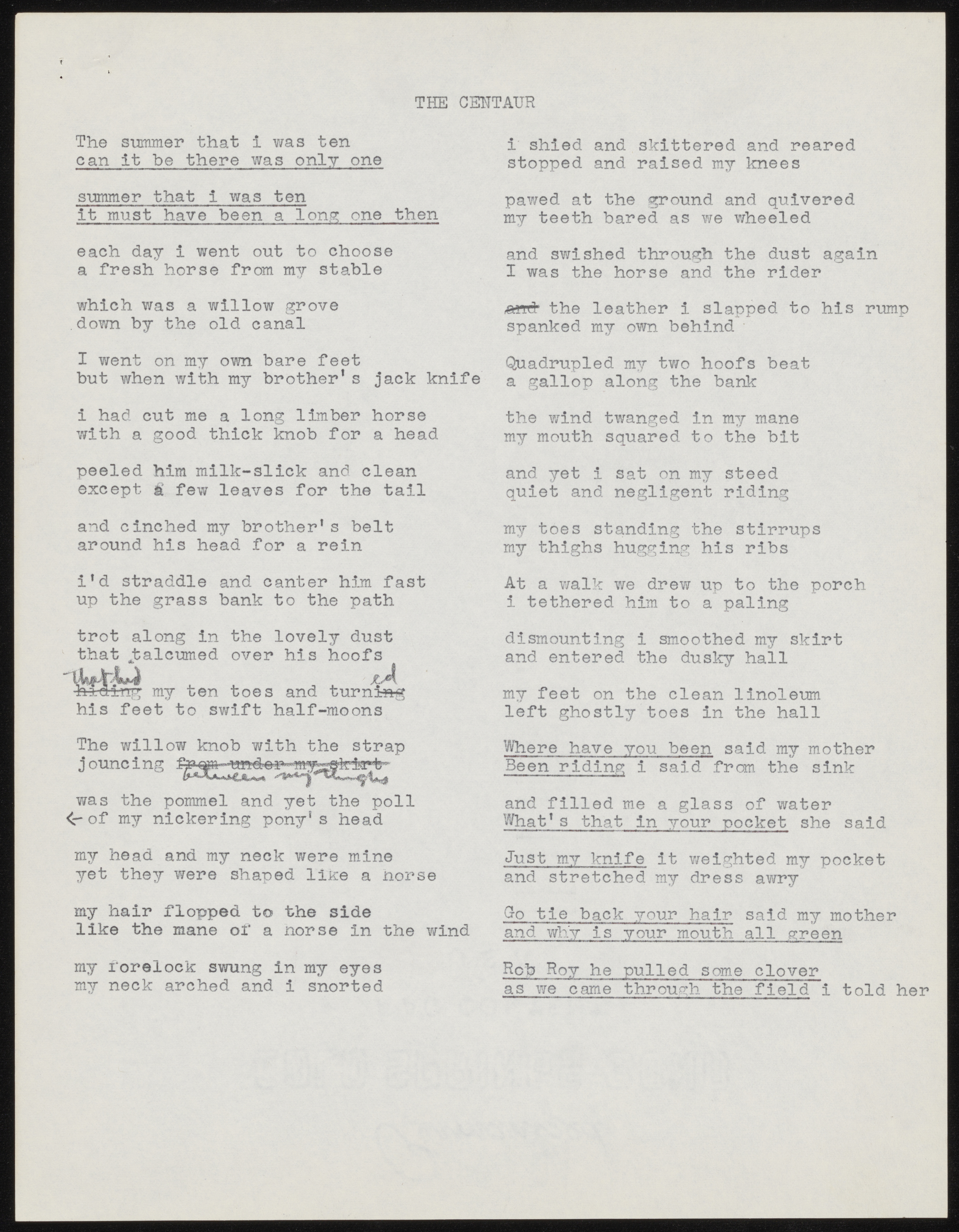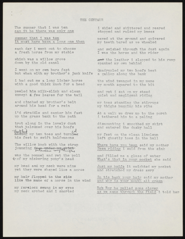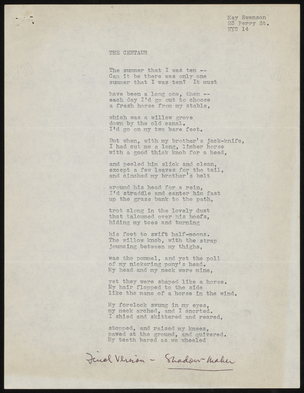 Swenson, May. 1956. “‘The Centaur’ Drafts.”, Stanley and Joan Elkin’s Artistic Kingdom, accessed February 11, 2026, https://digitalexhibits.library.wustl.edu/s/elkin/item/59843