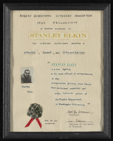 Robert Ackerman Literary Foundation 1969 Fellowship Handwritten and collaged document which resembles a certificate and reads "Robert Ackerman Literary Foundation 1969 Fellowship is Hear-by Awarded to Stanley Elkin for Literary Excellence Exhibited in A Bad Man, Boswell, and Criers and Kibitzers, 1969". -