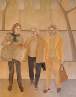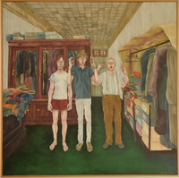 Bernie, Philip and Stanley Elkin doing Xipe Totec poses Inspired by a sculpture she saw at The Met, Joan had a number of relatives and friends pose as the Aztec god of regeneration, took photos of them and made paintings from them. She created two other versions with others modeling the pose in different settings. -