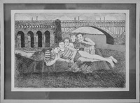 Bernie Jacobson and Other Men in Front of EADS Bridge The reclining man in front is Joan’s older brother Bernie, who was very close to her but who died of cancer at 36. Though the picture of these men most likely would have been taken in Chicago, Joan puts them in front of the Eads Bridge, which crosses the Mississippi River in St. Louis, MO. -