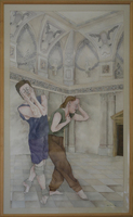 Dancers from the Mid America Dance Company (MADCO) Watercolor 1992. This is one of three works Joan did from photos she took of dancers from the Mid America Dance Company (MADCO), who danced on stage while Stanley read from his work (See The Rabbi of Lud for more information). Joan was paid by MADCO to design the dancers’ costumes. -