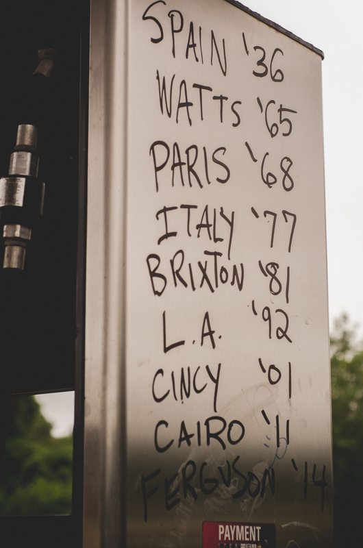Mark Regester. n.d. “Written on the Burnt Out Shell of the Quick Trip Gas Station on W. Florissant.”, Documenting Ferguson, accessed February 11, 2026, https://digitalexhibits.library.wustl.edu/s/ferguson/item/54917