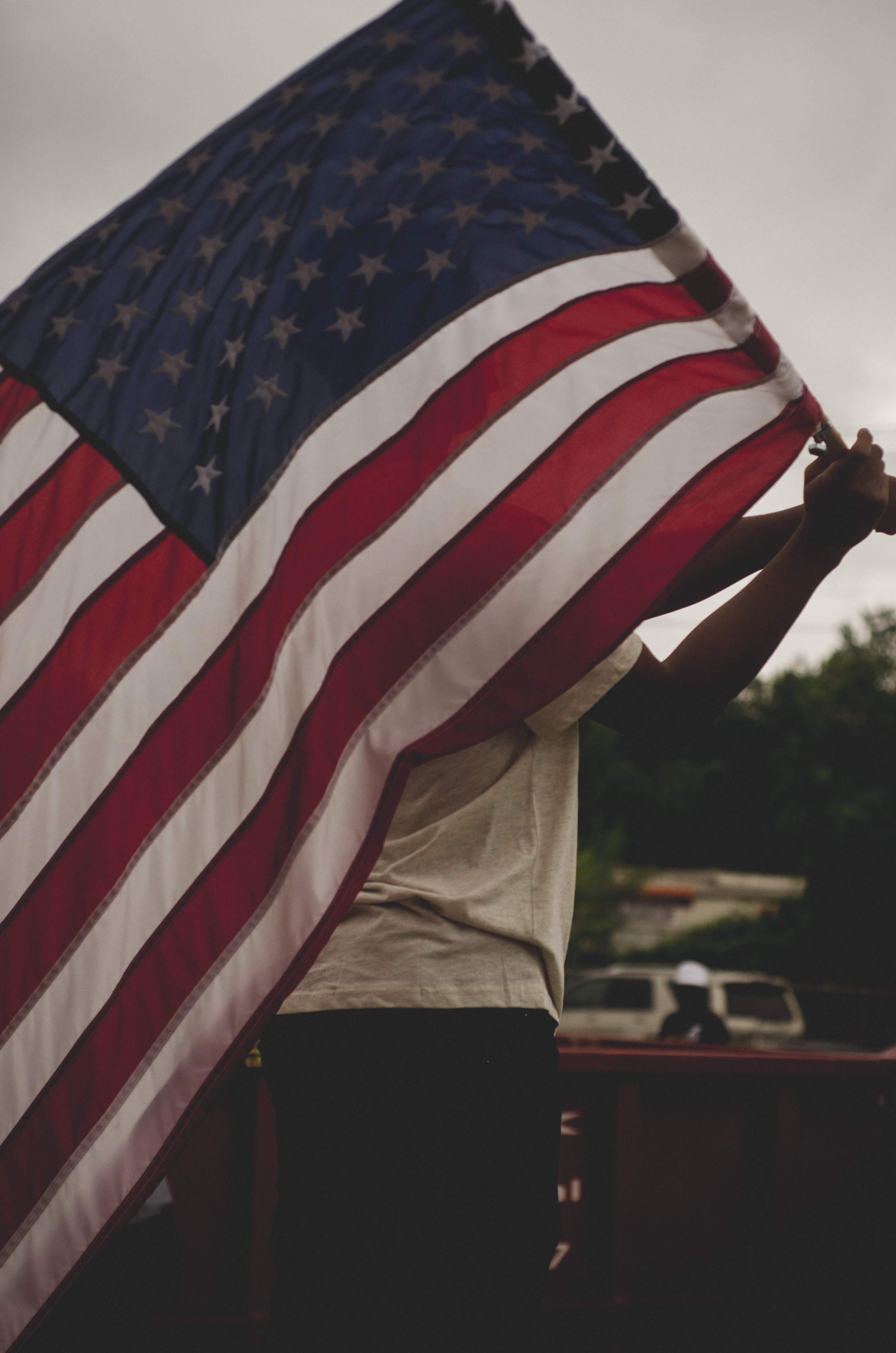 A protester waves an American flag at the Quick Trip on W. Florissant
