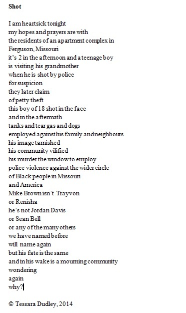 Tessara Dudley. “Shot: A Poem for Mike Brown.”, Documenting Ferguson, accessed February 11, 2026, https://digitalexhibits.library.wustl.edu/s/ferguson/item/55002